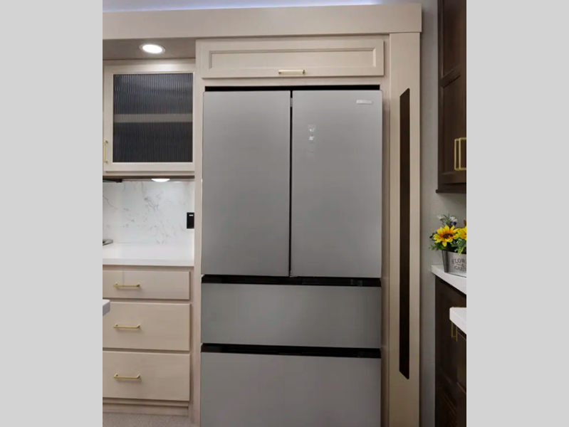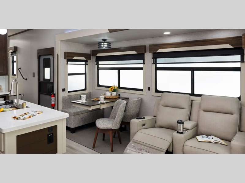 Sleeps 6 Slides 4 Length 43 ft 5 in Ext Width 8 ft Ext Height 13 ft 5 in Interior Color Pebble, Livingston, Dune Exterior Color Full Body Paint; Onyx, Sapphire, Opal Hitch Weight 2490 lbs GVWR 18000 lbs Dry Weight 15429 lbs Cargo Capacity 2571 lbs Fresh Water Capacity 75 gals Grey Water Capacity 82 gals Black Water Capacity 82 gals Available Beds King, Murphy Refrigerator Type 12V with Icemaker Refrigerator Size 18 cu ft Cooktop Burners 3 Shower Size 48" x 30" Number of Awnings 2 Water Heater Capacity 12 gal Water Heater Type LP/110V AC BTU 30000 btu TV Info LR 50" Smart TV, BR 32" Smart TV Awning Info 12' and 21' Electric w/LED Lights Axle Count 2 Washer/Dryer Available Yes Shower Type Shower w/Seat Similar Floorplans