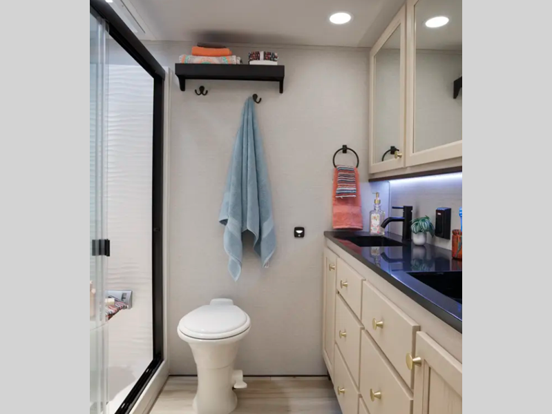 The 101" wide body frame will provide you with more space to stretch out and relax, and the "True" gelcoat exterior is the best of the best in exteriors! Each model also includes Road Warrior suspension for better handling, and the Gen 3 hydraulic leveling system will have you set up in no-time. Inside, you'll enjoy vinyl floor covering in the kitchen and living area, easy to clean, 12V motion lighting in the closet in the bedroom, plus many more comforts.