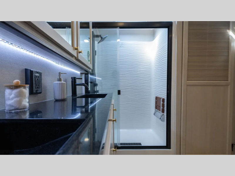 - Redesigned 48” x 30” Rectangular shower with seat, sliding glass doors, and an Upgraded Shower Head