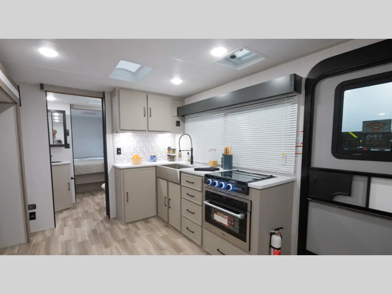 Sleeps 8 Slides 1 Length 29 ft 10 in Ext Width 8 ft Ext Height 11 ft 4 in Hitch Weight 850 lbs Dry Weight 6053 lbs Cargo Capacity 1797 lbs Fresh Water Capacity 38 gals Grey Water Capacity 60 gals Black Water Capacity 30 gals Number Of Bunks 2 Available Beds Custom King Refrigerator Type 12V Refrigerator Size 10.7 cu ft Cooktop Burners 3 Shower Size 40" x 30" Number of Awnings 1 Water Heater Type On Demand Tankless AC BTU 31500 btu TV Info LR 40" TV Awning Info 20' w/LED Lights Axle Count 2 Shower Type Standard Similar Floorplans