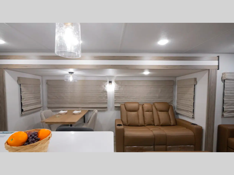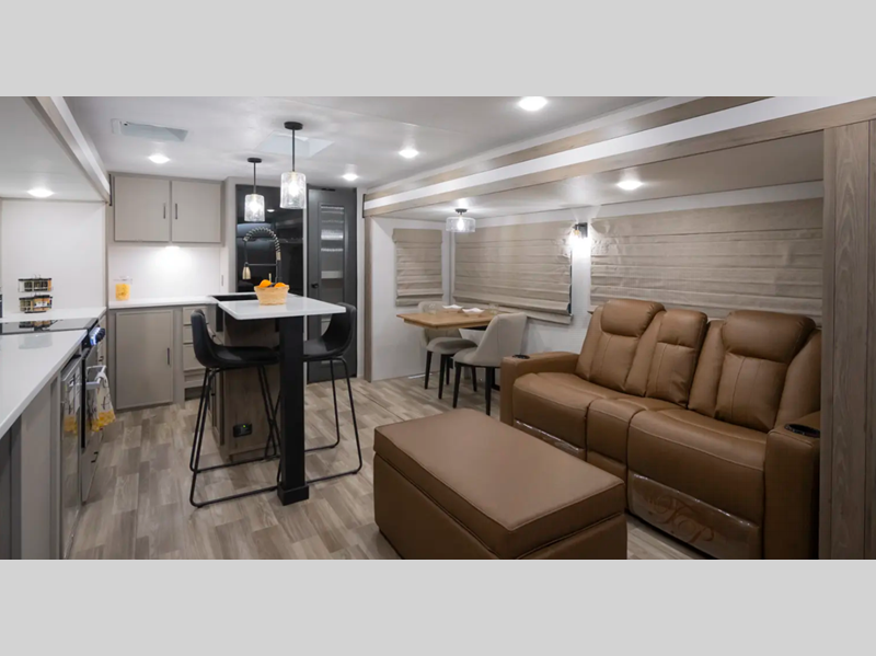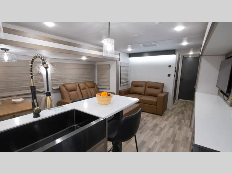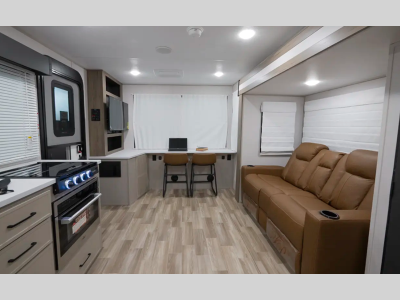 Sleeps 5 Slides 1 Length 34 ft Ext Width 8 ft Ext Height 11 ft 4 in Hitch Weight 875 lbs Dry Weight 6938 lbs Cargo Capacity 2737 lbs Fresh Water Capacity 38 gals Grey Water Capacity 96 gals Black Water Capacity 30 gals Available Beds Custom King Refrigerator Type 12V Refrigerator Size 10.7 cu ft Cooktop Burners 3 Shower Size 36" x 30" Number of Awnings 1 Water Heater Type On Demand Tankless AC BTU 31500 btu TV Info LR TV Awning Info 20' w/LED Lights Axle Count 2 Washer/Dryer Available Yes Shower Type Walk-In Shower Similar Floorplans