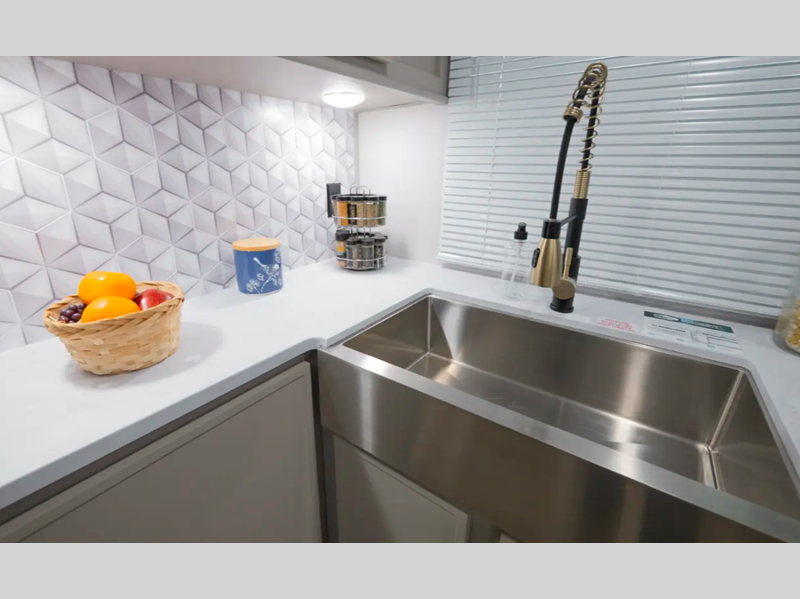 - Residential Solid Surface Countertop w/ Oversized Undermounted Single Bowl Stainless Steel Sink, Built in Drying Rack & Decorative Kitchen Backsplash