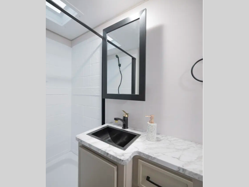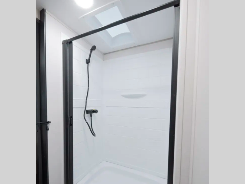 Sleeps 2 Slides 2 Length 29 ft 11 in Ext Width 8 ft Ext Height 11 ft 4 in Hitch Weight 805 lbs Dry Weight 6663 lbs Cargo Capacity 2942 lbs Fresh Water Capacity 38 gals Grey Water Capacity 96 gals Black Water Capacity 30 gals Available Beds Custom King Refrigerator Type 12V Refrigerator Size 10.7 cu ft Cooktop Burners 3 Shower Size 36" x 30" Number of Awnings 2 Water Heater Type On Demand Tankless AC BTU 31500 btu Awning Info 9'6" and 9'6" w/LED Lights Axle Count 2 Washer/Dryer Available Yes Shower Type Walk-In Shower Similar Floorplans