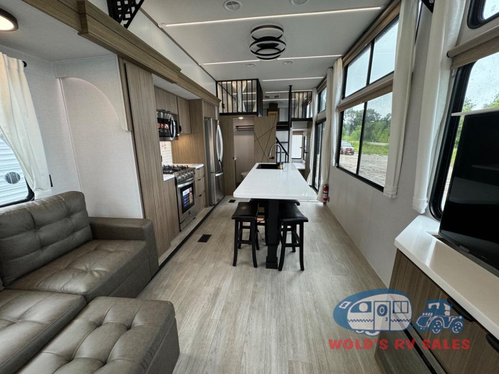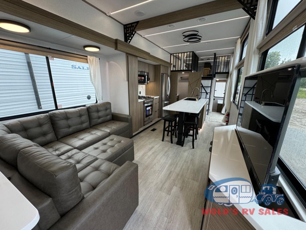 You will feel like you are home when you step inside! Not only will you be impressed with the large slide in the main combined kitchen and living area, but check out the island with four seats! The main entry closest to the front features a step up to a private bedroom featuring a custom king bed with Versa-Tilt within a slide, plus a fireplace, wardrobe, and a dress for your belongings. Just outside this door is a half bath around the corner and a spiral staircase to the front loft with two 42" x 74" bunk mats above. The kitchen is fully equipped for you to provide the best home cooked meals with a roll-out pantry, range and microwave, plus side-by-side refrigerator all part of the large slide that also houses an L-shaped sectional sofa with ottoman so everyone can have a seat! Opposite the sectional find an entertainment center with pop-up TV and fireplace. A second set of stairs leads up to the rear loft featuring a 62" x 74" Versa Queen mattress and a dresser. Back down in the very back of the unit, there is a large bathroom with a walk-in shower, linen cabinet, toilet, and vanity with a sink. There is also a space that has washer/dryer prep to add even more convenience. Outside, a 26' awning for outdoor living, and double entry doors to make it easy to move in and out.