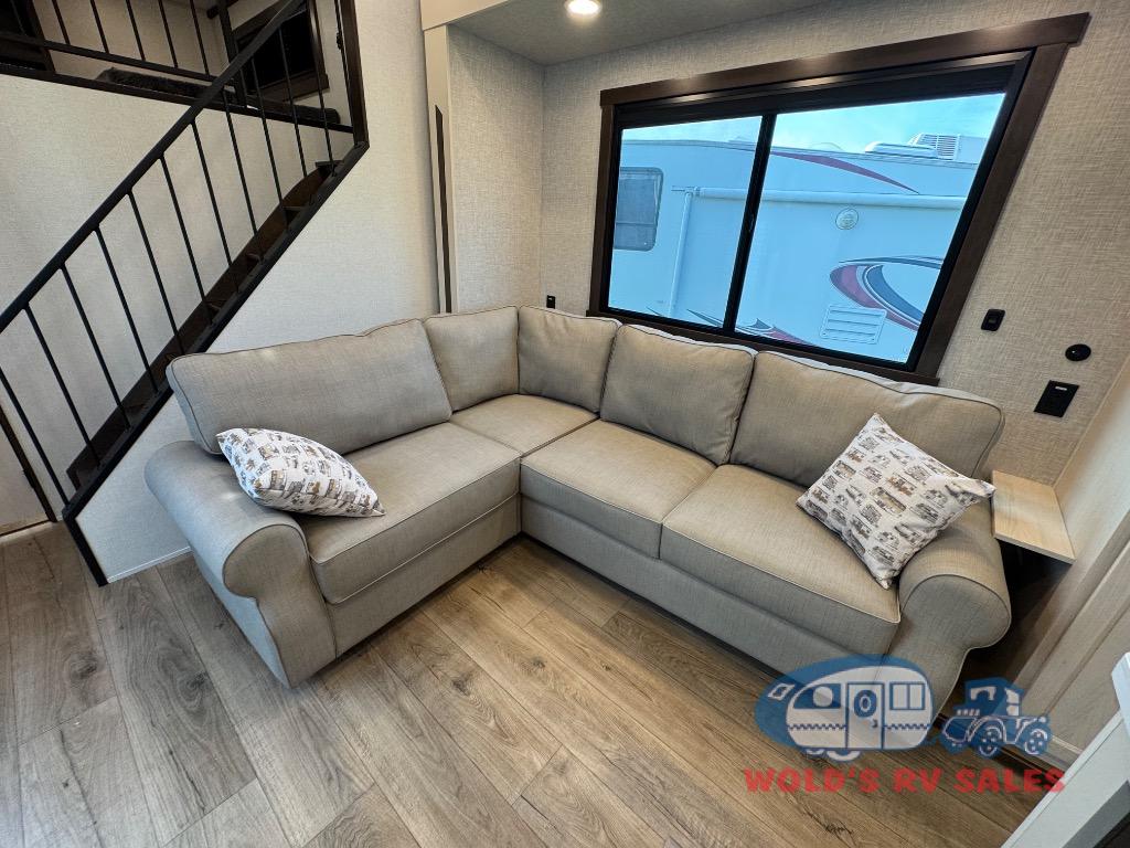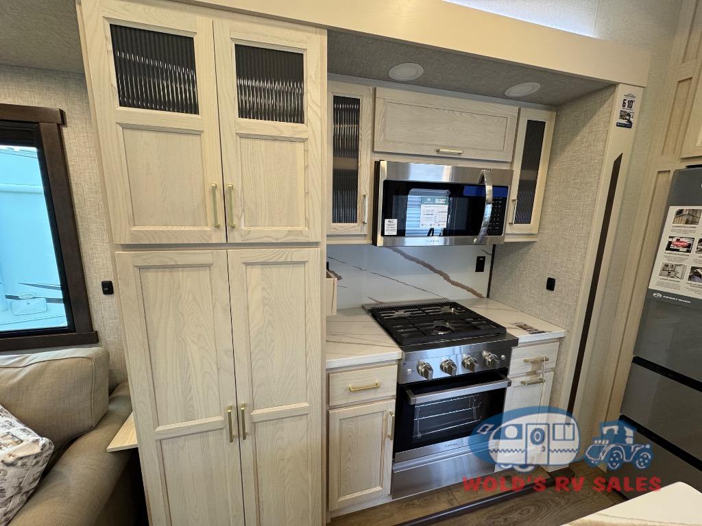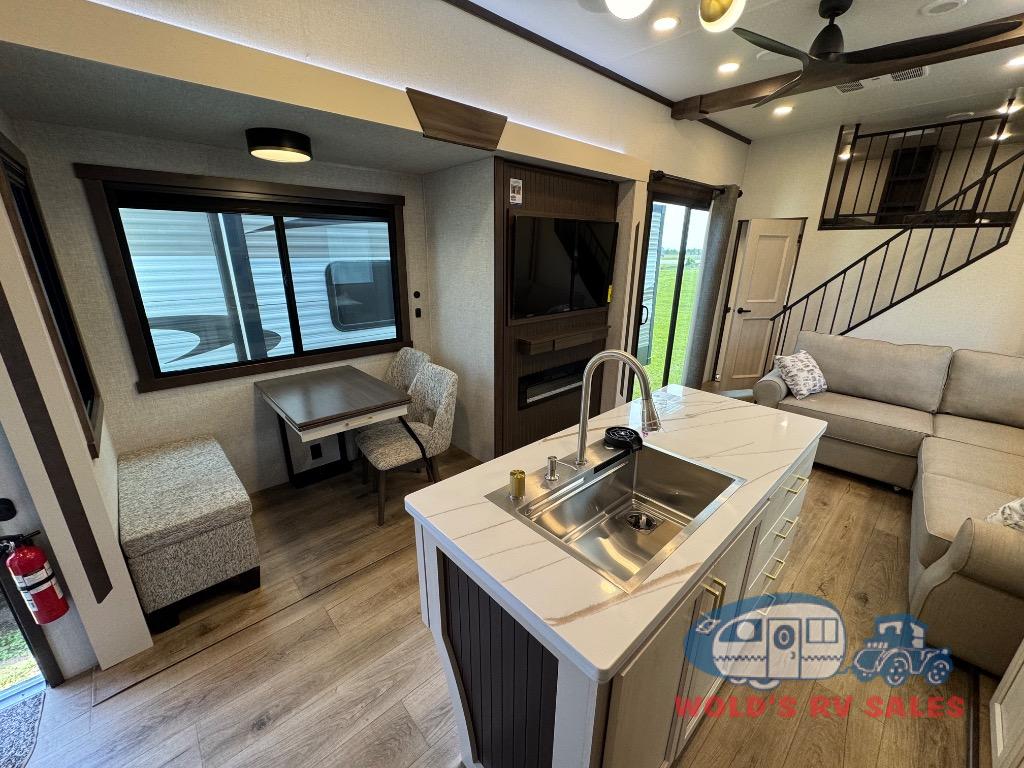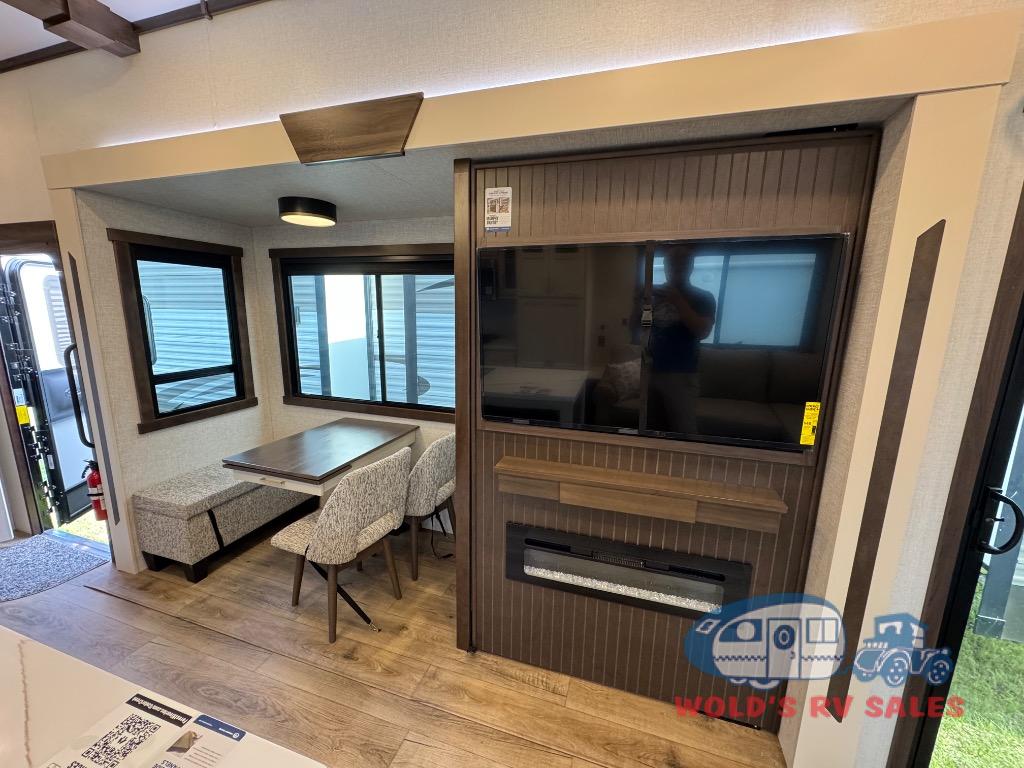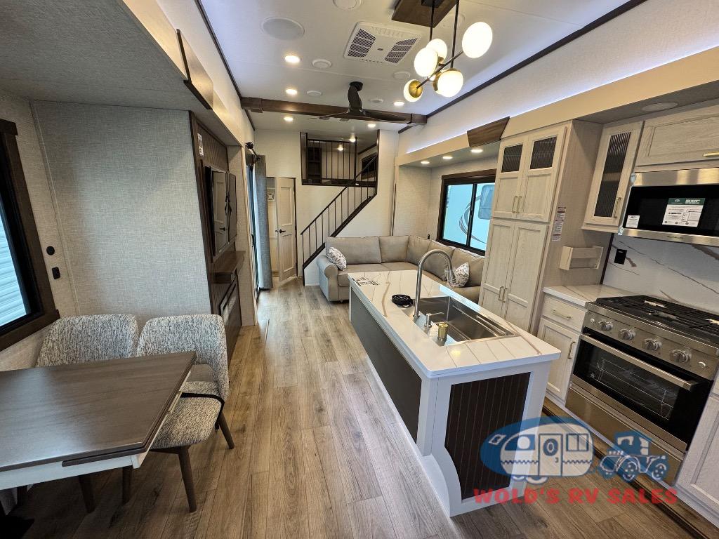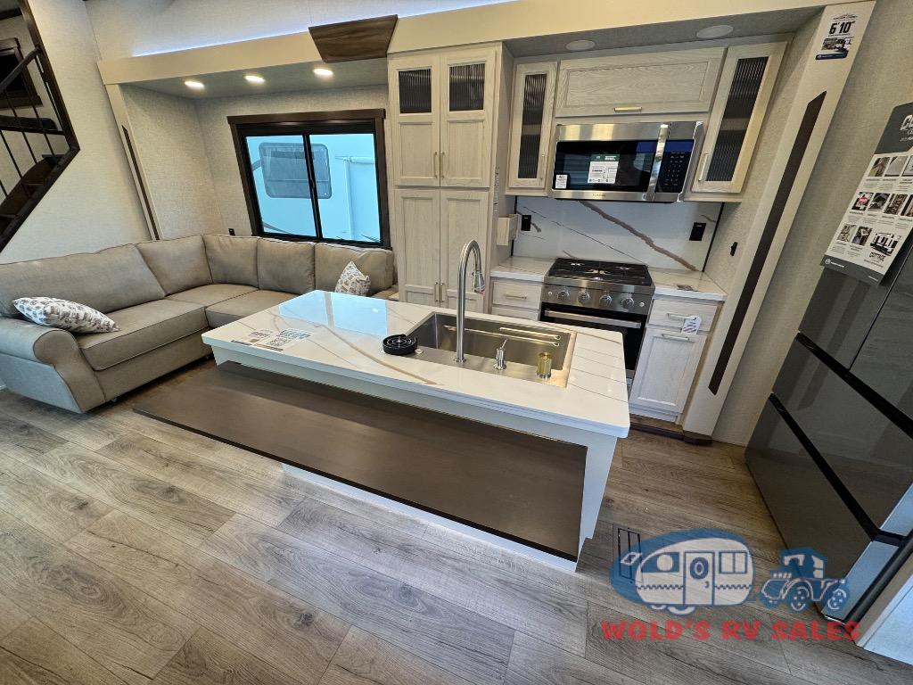 A front and rear loft plus master bedroom offer three different sleeping spaces that you and your family or guests will enjoy. The front master offers a king bed slide, plus two dressers and a wardrobe for clothing. There is also a 32" TV as well. The main combined living and kitchen area features a large L-shaped sectional sofa opposite a swivel mount Smart TV and fireplace mounted on the exterior door that hides a Murphy pantry. The kitchen is fully equipped for all of your cooking needs with a 30" stainless steel microwave, a 12V 18 cu. ft. refrigerator, and an island with fold-down breakfast counter. There is also a free standing dinette with an extension and an ottoman.