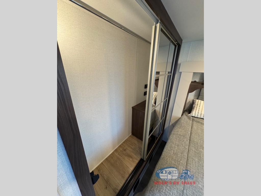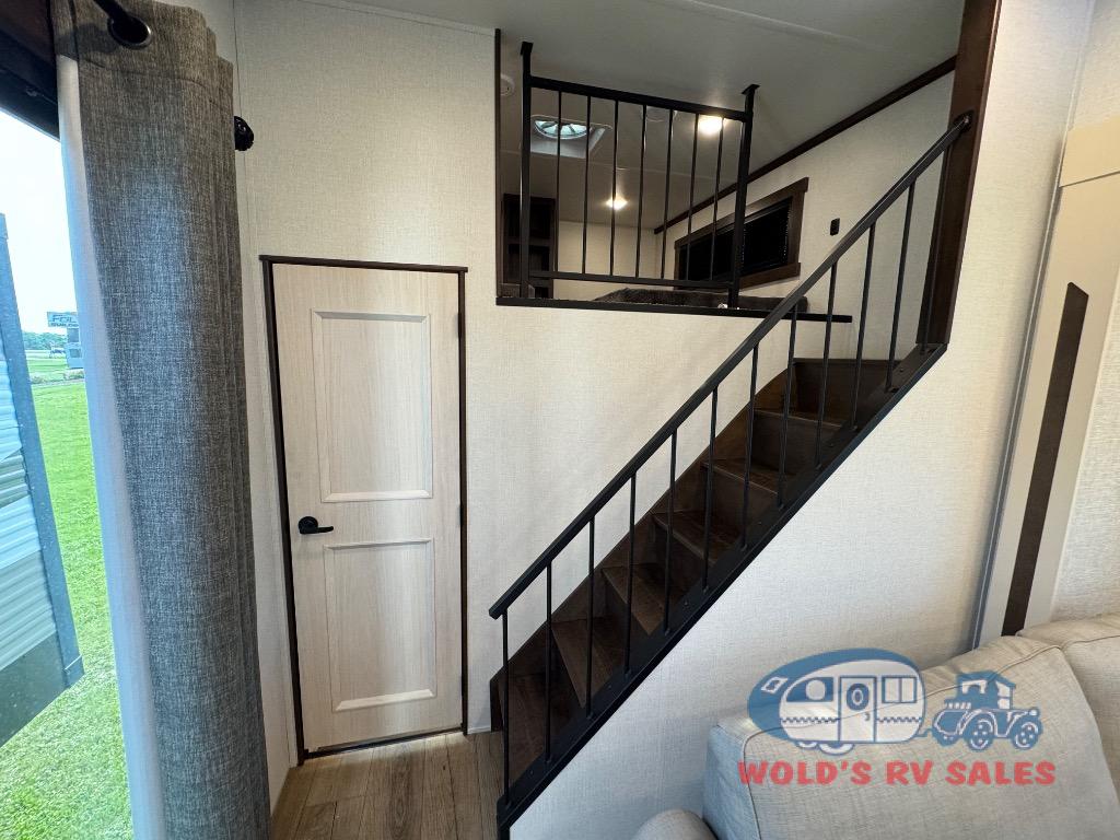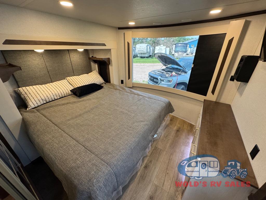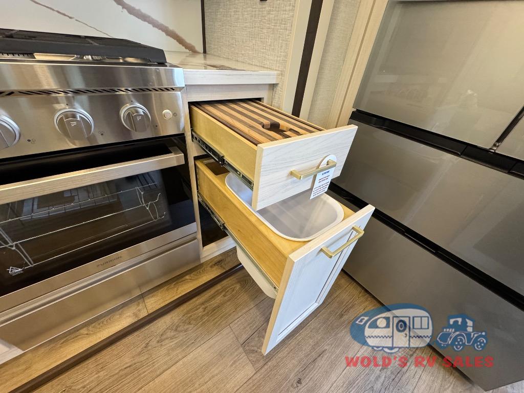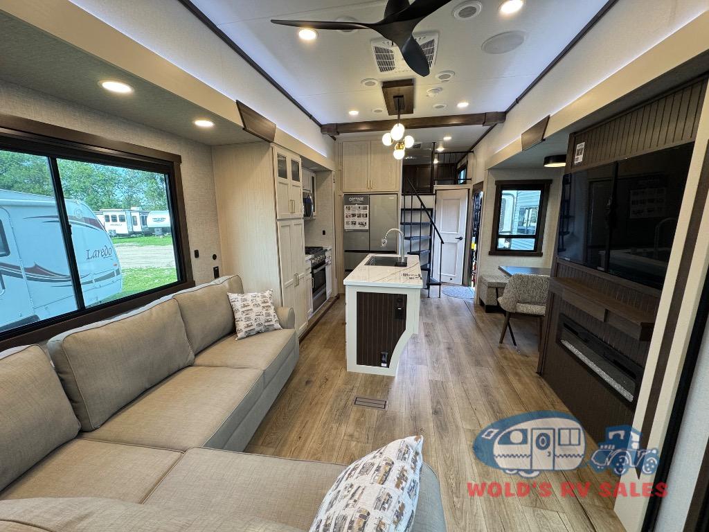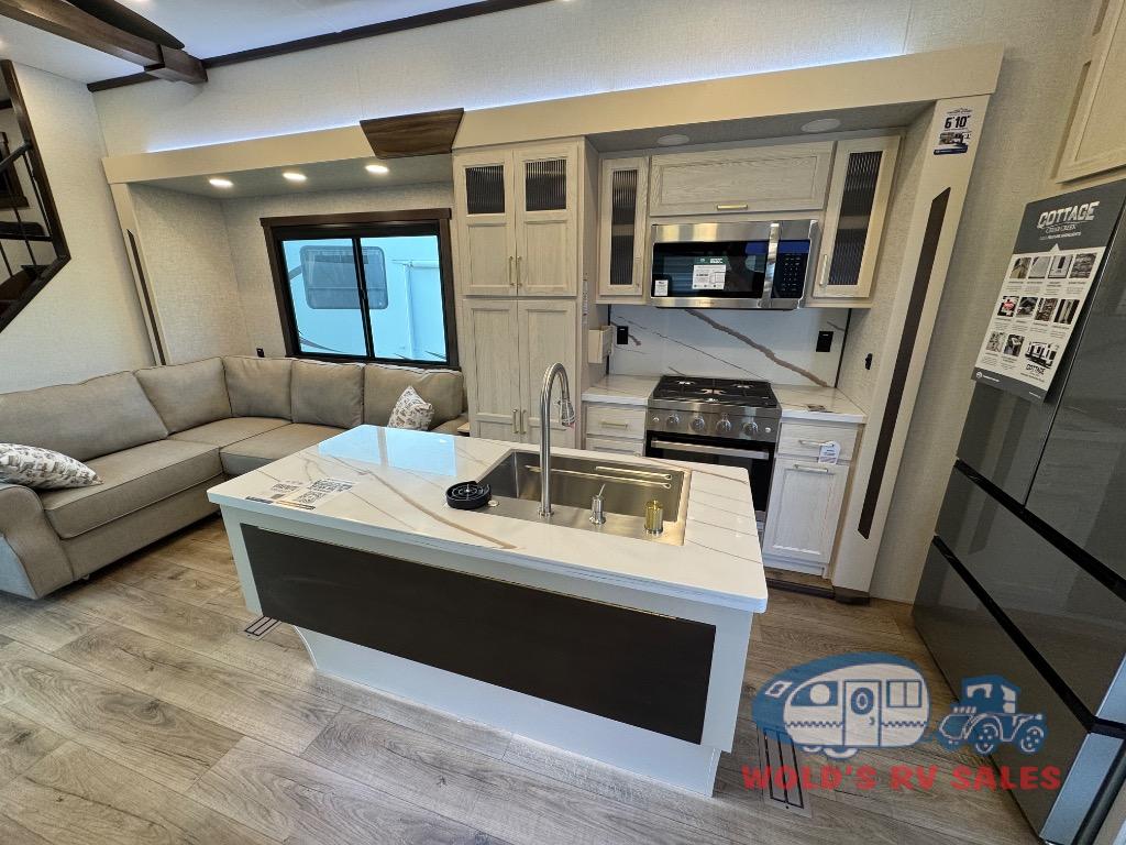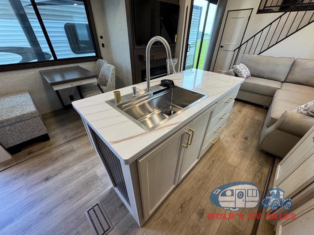 A front and rear loft plus master bedroom offer three different sleeping spaces that you and your family or guests will enjoy. The front master offers a king bed slide, plus two dressers and a wardrobe for clothing. There is also a 32" TV as well. The main combined living and kitchen area features a large L-shaped sectional sofa opposite a swivel mount Smart TV and fireplace mounted on the exterior door that hides a Murphy pantry. The kitchen is fully equipped for all of your cooking needs with a 30" stainless steel microwave, a 12V 18 cu. ft. refrigerator, and an island with fold-down breakfast counter. There is also a free standing dinette with an extension and an ottoman.