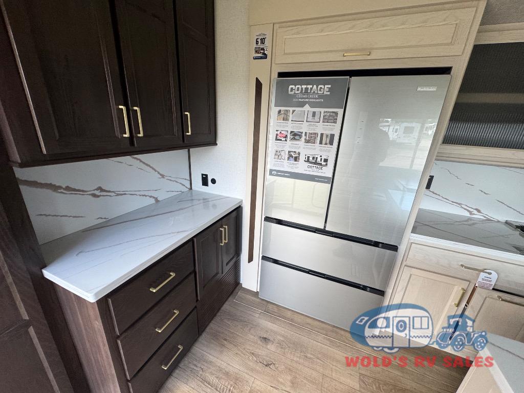 Spend some time getting to know your family a little bit better in this Cedar Creek Cottage destination trailer! You will have plenty of space to do all sorts of indoor activities with the opposing slides and king bed slide for added space, and the free-standing table with chairs has an extension that you can use if you are working on a bigger puzzle or have guests over for dinner. The kitchen features everything you need to create meals for your whole family just like at home. You will love the 18 cu. ft. 12 volt refrigerator so you can stock-up at the grocery store. The Murphy pantry also features all the space needed to store many treats, and you can add an optional dishwasher to help you clean up much faster.