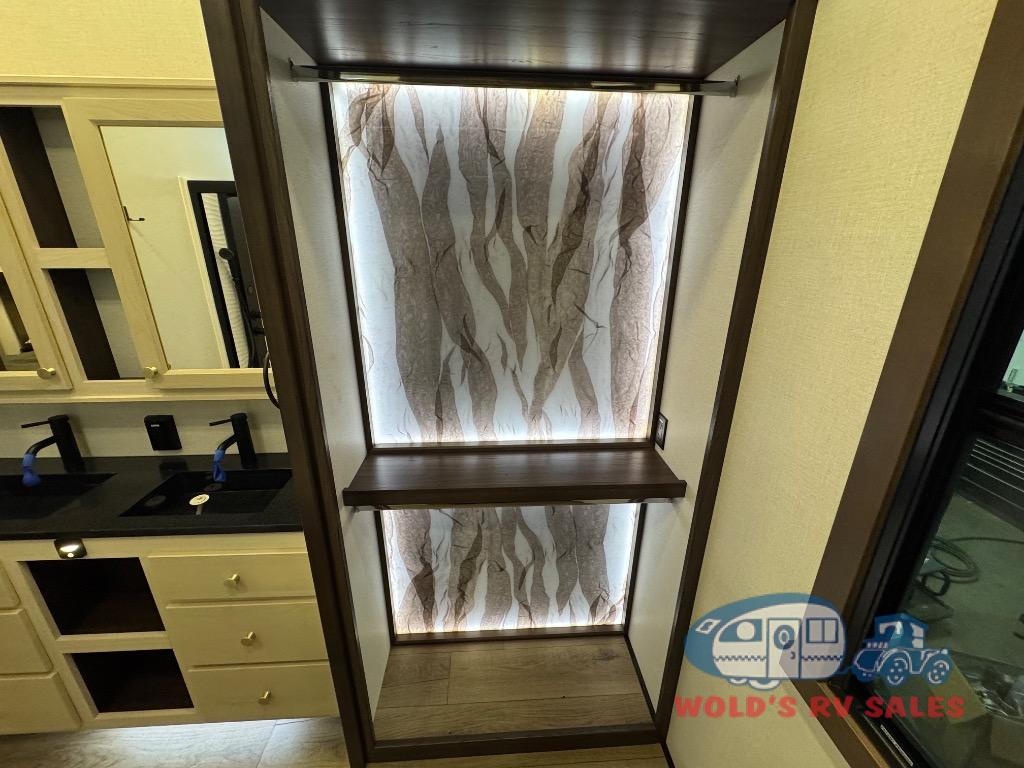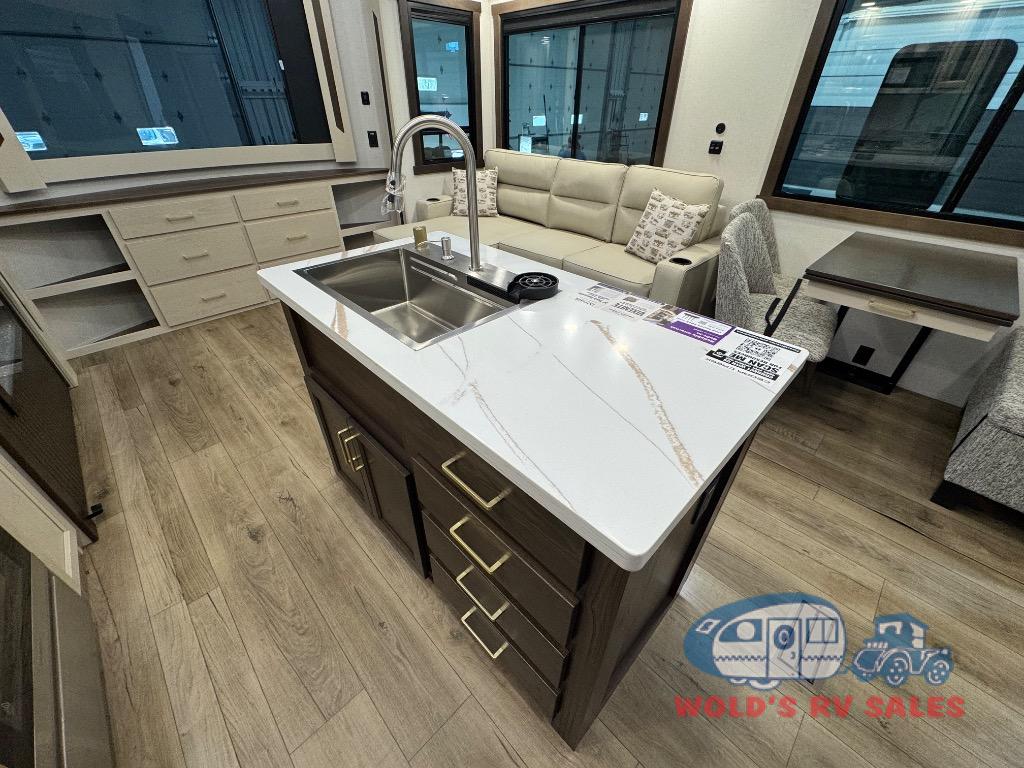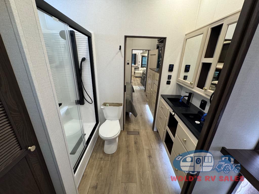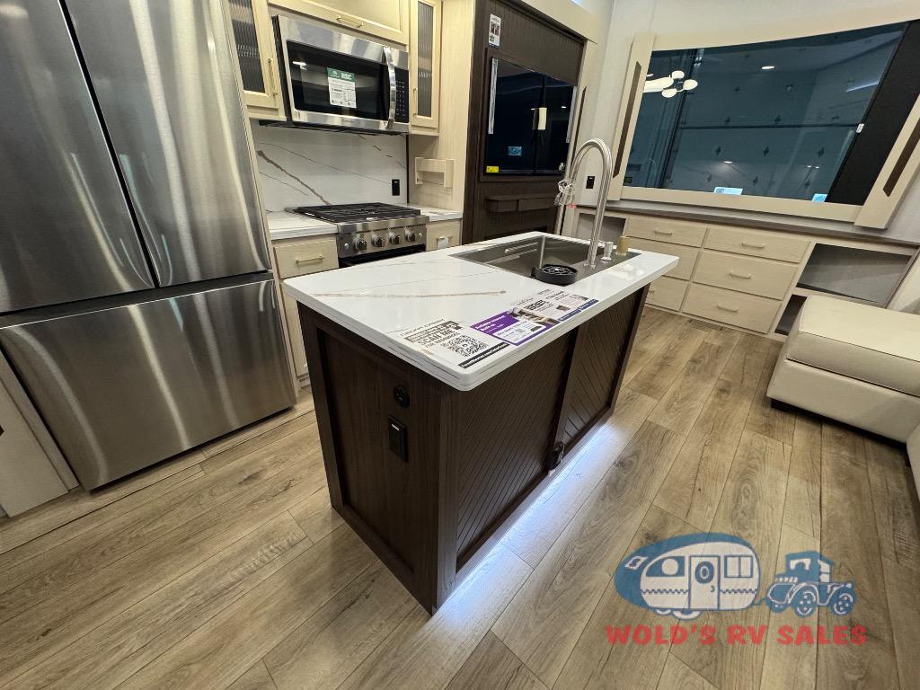 This Cedar Creek Cottage destination trailer will bring out the best in every trip with its residential-style design and features. Up front, the living area features a swivel-mounted 50" smart TV and cozy fireplace so you can enjoy a great view from the theater seating or sofa. The fully equipped kitchen includes a handy Murphy pantry for extra storage, a 20 cu. ft. 110V refrigerator, 30" over-the-range microwave, and a beautiful island with solid surface countertop and workstation sink. At the rear, a private king bedroom with a bed slide, wardrobe storage, and dresser with hidden storage gives you a true retreat, while the spacious bathroom offers a 48" x 30" one-piece fiberglass shower with glass doors and a large vanity. And don’t forget the half bath that makes getting ready a breeze.