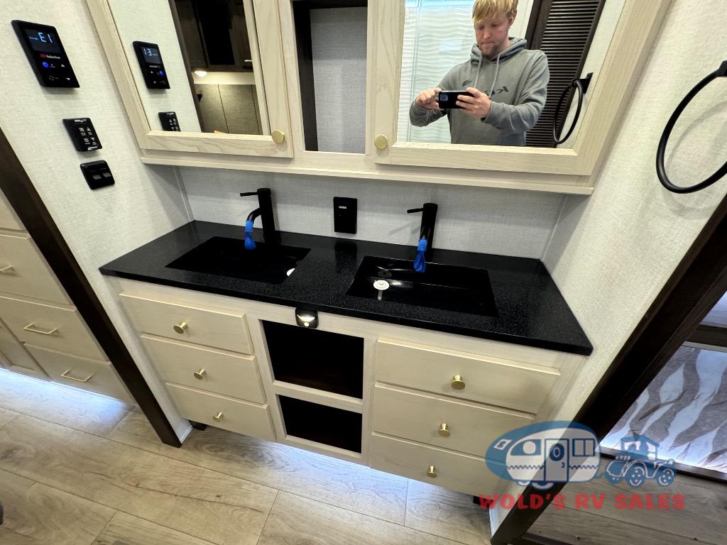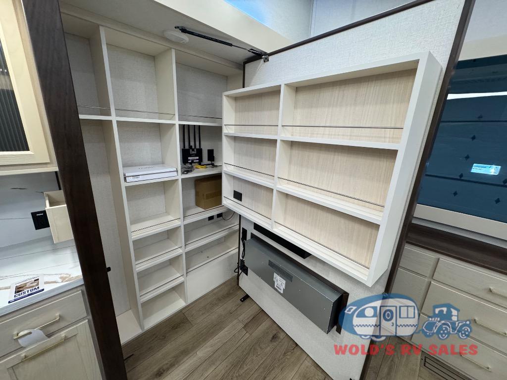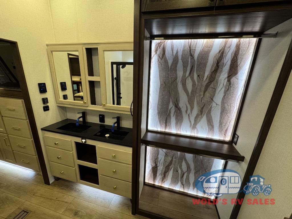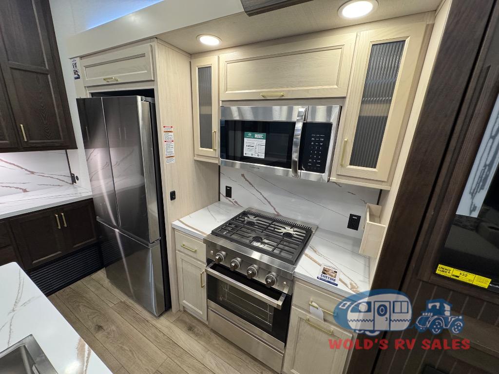 This Cedar Creek Cottage destination trailer will bring out the best in every trip with its residential-style design and features. Up front, the living area features a swivel-mounted 50" smart TV and cozy fireplace so you can enjoy a great view from the theater seating or sofa. The fully equipped kitchen includes a handy Murphy pantry for extra storage, a 20 cu. ft. 110V refrigerator, 30" over-the-range microwave, and a beautiful island with solid surface countertop and workstation sink. At the rear, a private king bedroom with a bed slide, wardrobe storage, and dresser with hidden storage gives you a true retreat, while the spacious bathroom offers a 48" x 30" one-piece fiberglass shower with glass doors and a large vanity. And don’t forget the half bath that makes getting ready a breeze.