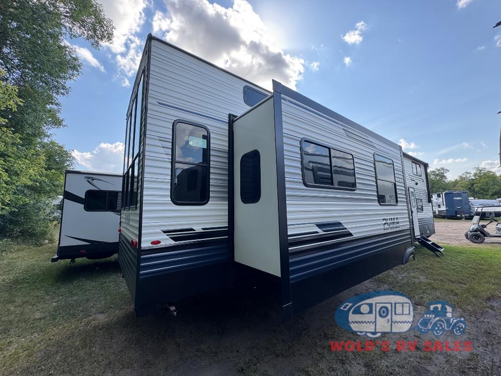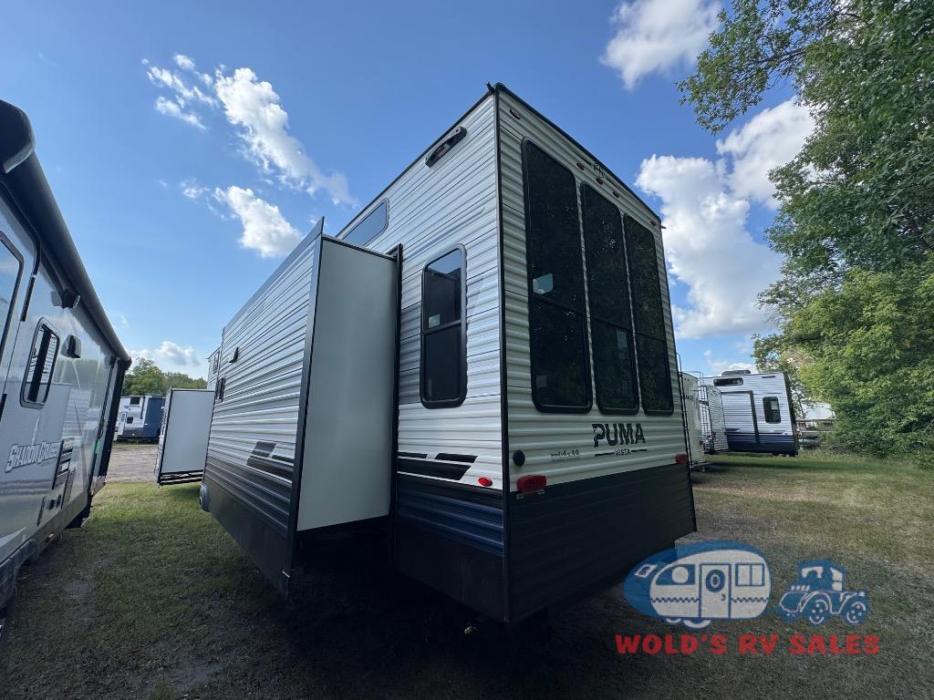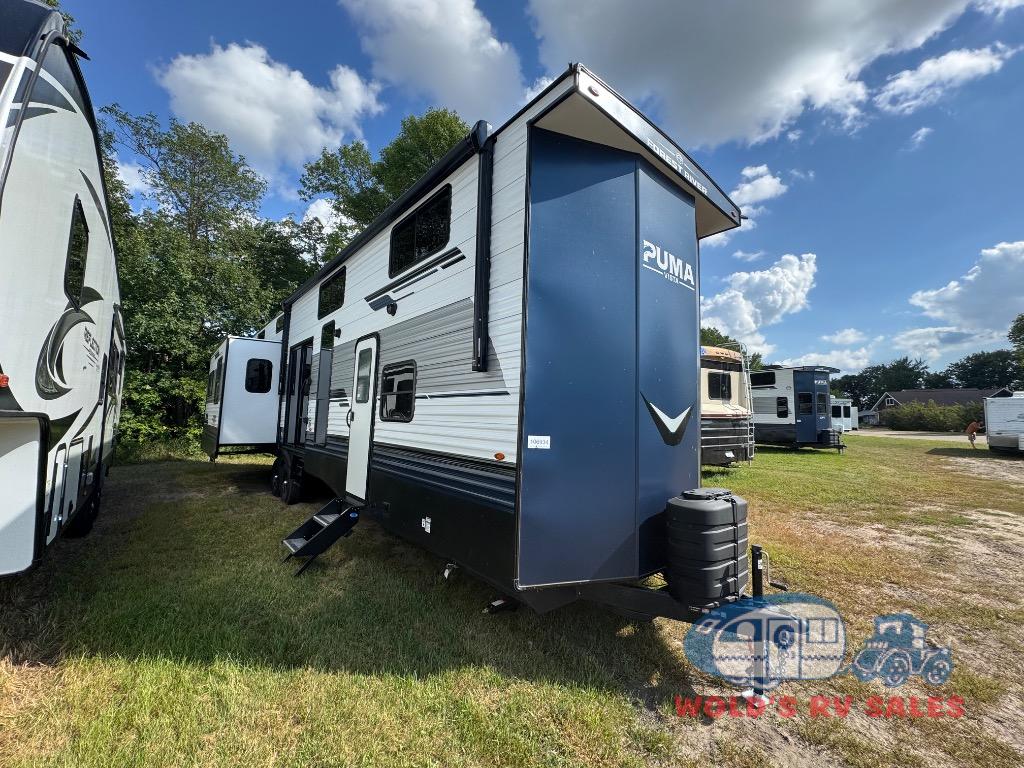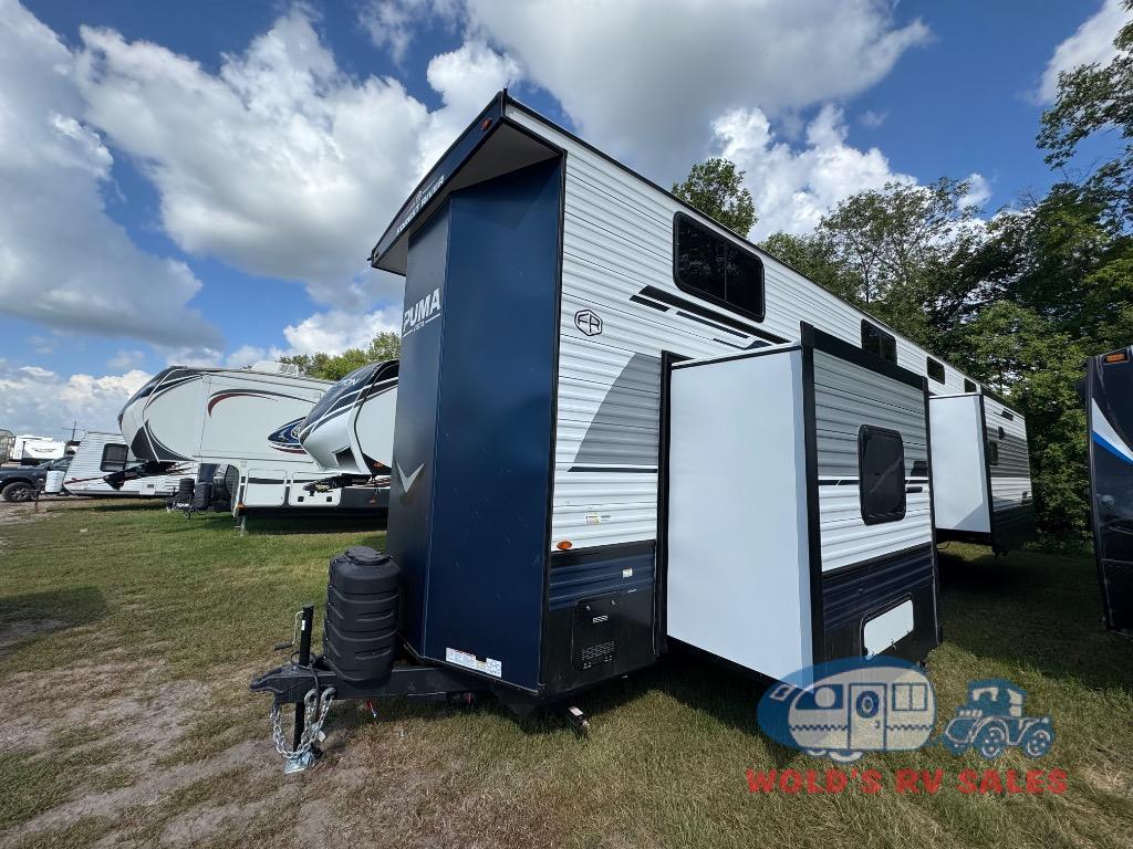 Each Puma Destination trailer by Palomino is designed to give you unforgettable getaways to the destination of your choice! The required Value Shopper Loft Package includes Congoleum designer linoleum, night roller shades, LED lighting, and a 24" stainless steel oven with a four burner stove so you can make meals just like you would at home. The tankless water heater is another feature you won't want to camp without, and there is WiFi prep, solar prep, plus optional washer and dryer prep for the option to further customize your trailer. An outside shower is included with the required Loft Package, along with two exterior speakers, solid surface countertops, four stabilizer jacks, and more!