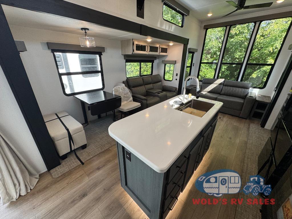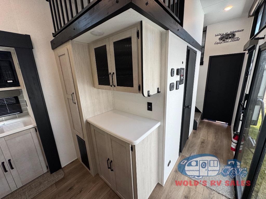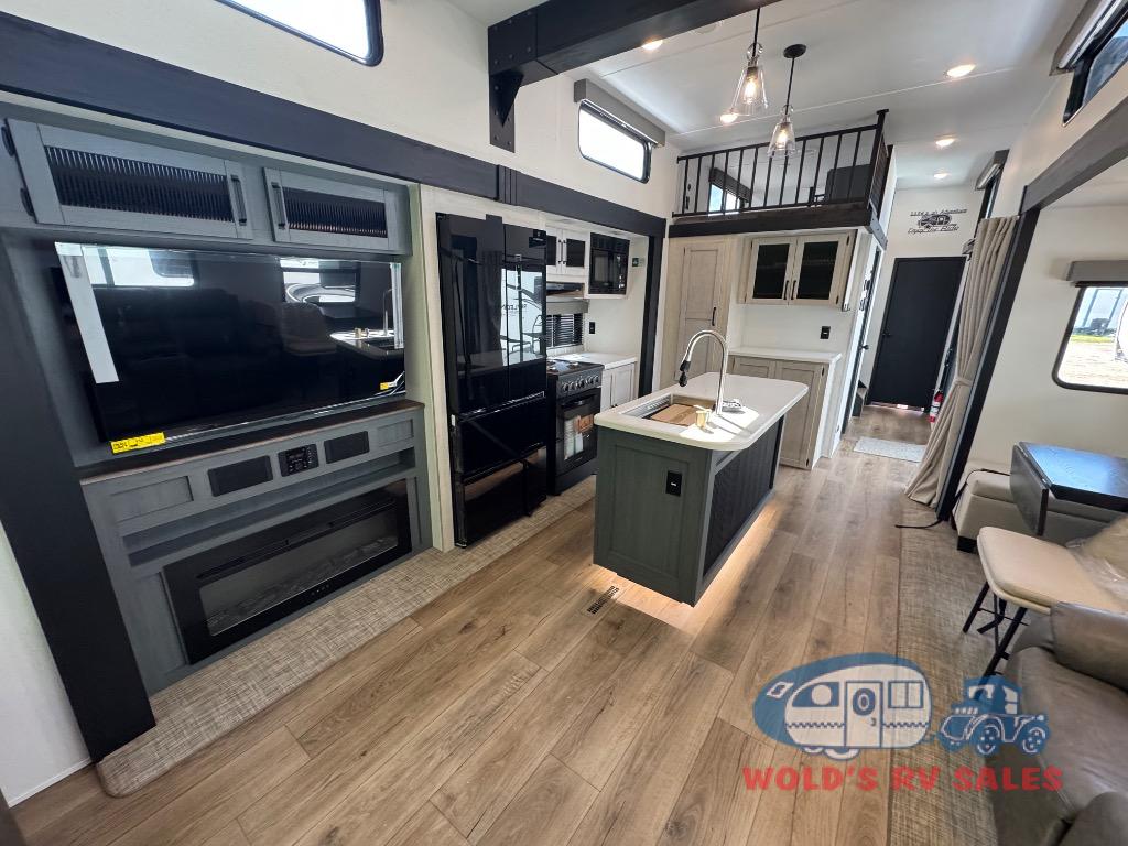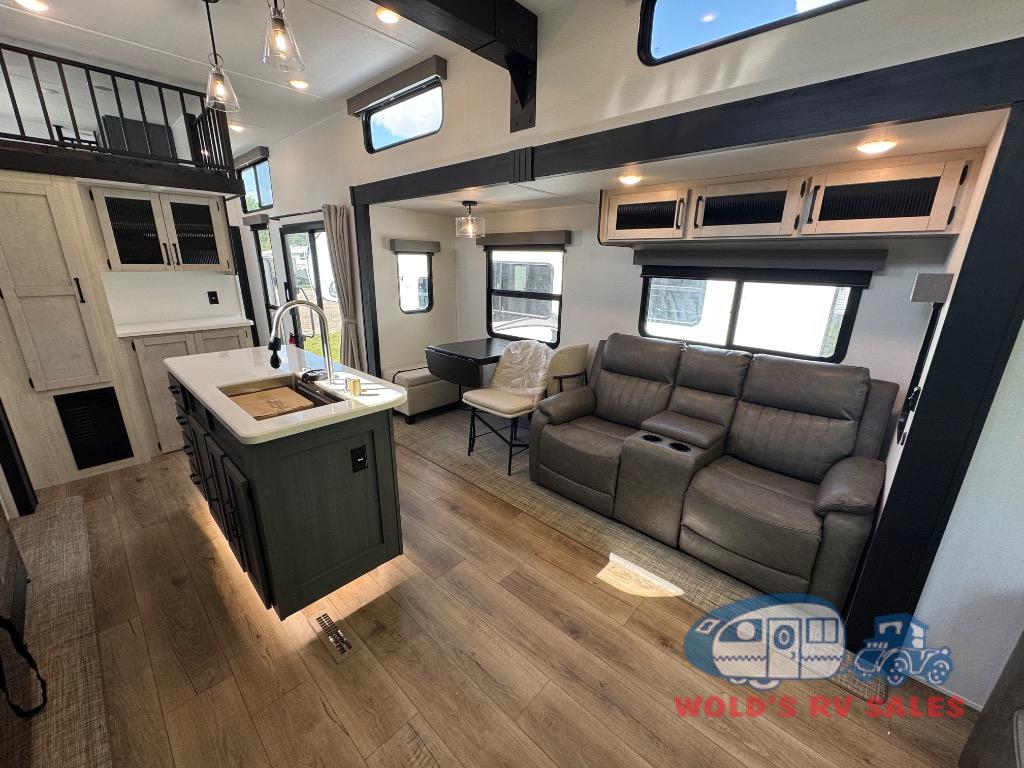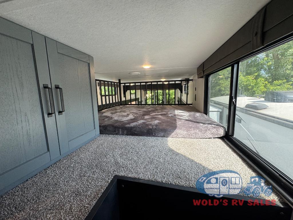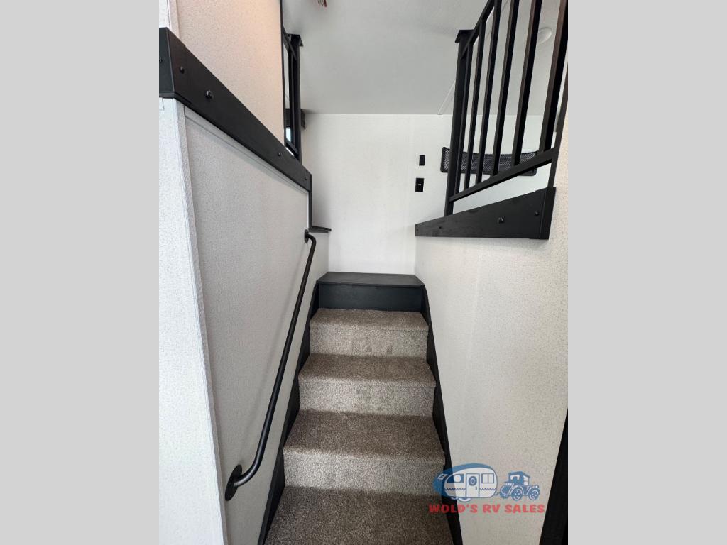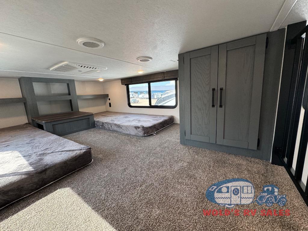 Wherever your destination may be, you can be sure to enjoy it to the fullest with this trailer in tow! With two entry doors, you can enter in through the front private bedroom or the main living area. The bedroom includes a king bed slide out, a desktop if you need to work from home, and a wardrobe/closet to keep your clothes organized. There is also a closet with the option to add washer and dryer prep. Just outside this room are steps that lead to the large loft area with a 58" x 58" bunk mat and a cabinet on one side, plus two 32" x 80" bunk mats on the other. There is also a front cabinet and a wardrobe/closet for plenty of storage space. Once you've headed back downstairs, you can relax on the dual recliners, rear sofa, or free-standing table with a bench and two seats. And the chef of your group will love the kitchen with its residential style refrigerator and pantry, kitchen island, and four burner cooktop!