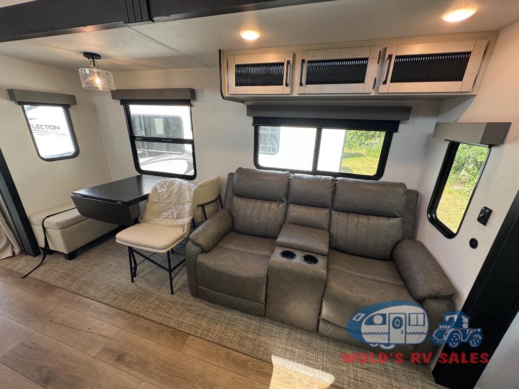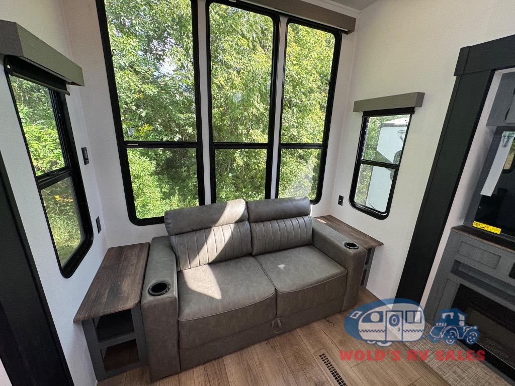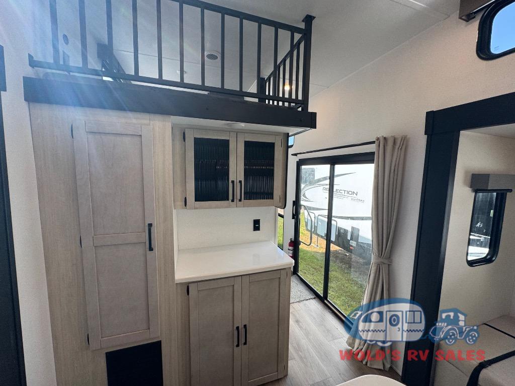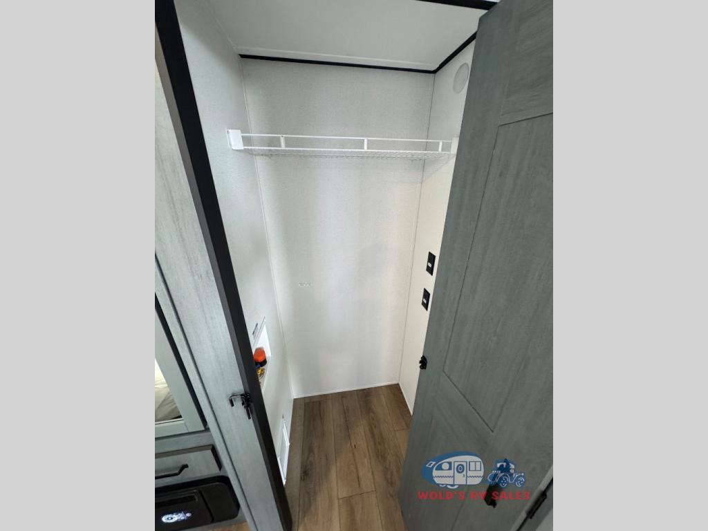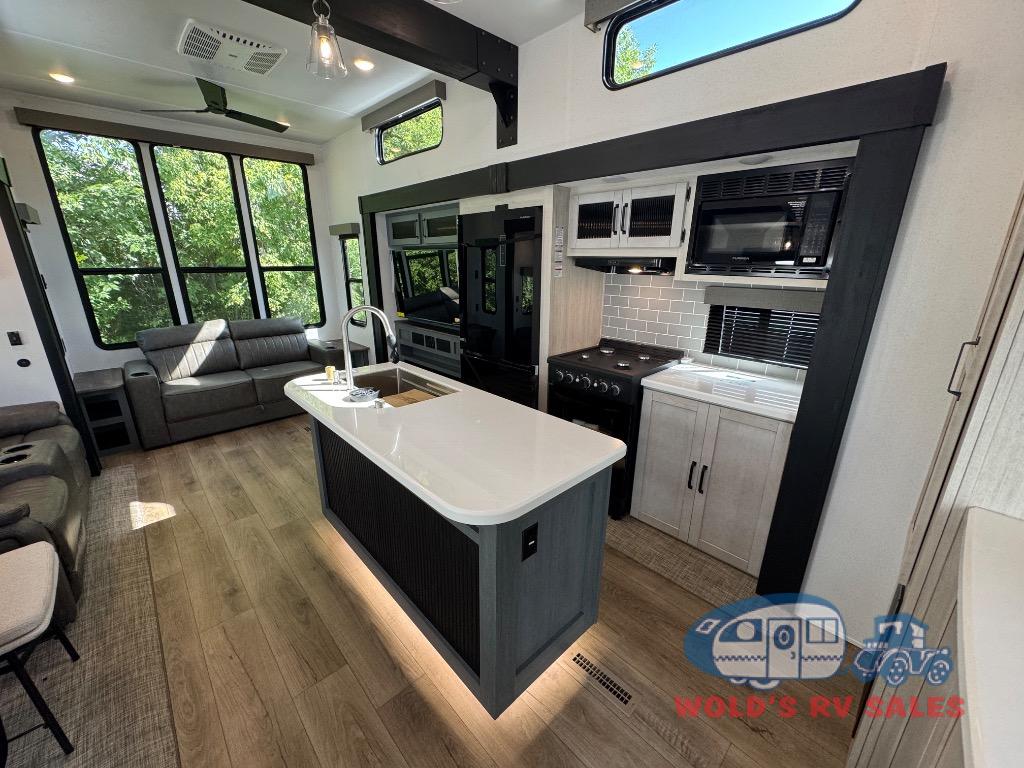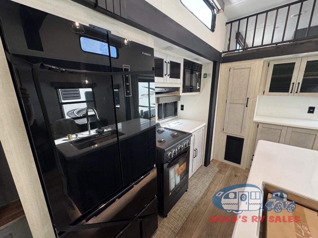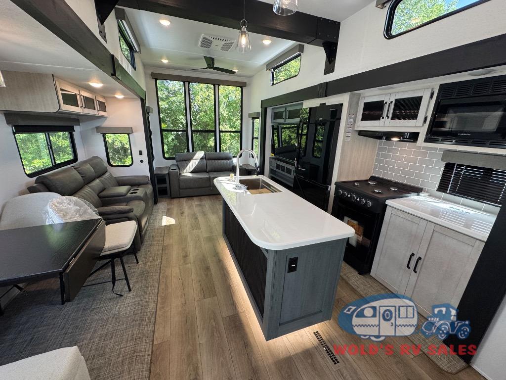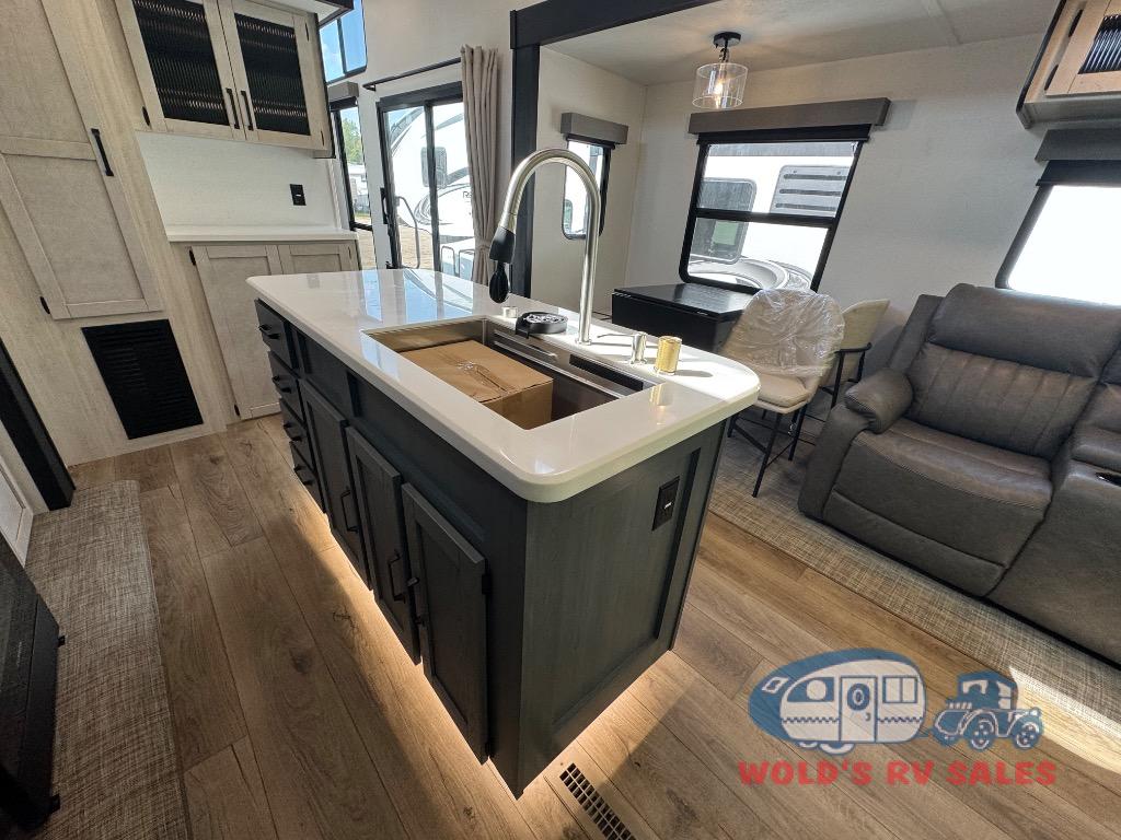 Wherever your destination may be, you can be sure to enjoy it to the fullest with this trailer in tow! With two entry doors, you can enter in through the front private bedroom or the main living area. The bedroom includes a king bed slide out, a desktop if you need to work from home, and a wardrobe/closet to keep your clothes organized. There is also a closet with the option to add washer and dryer prep. Just outside this room are steps that lead to the large loft area with a 58" x 58" bunk mat and a cabinet on one side, plus two 32" x 80" bunk mats on the other. There is also a front cabinet and a wardrobe/closet for plenty of storage space. Once you've headed back downstairs, you can relax on the dual recliners, rear sofa, or free-standing table with a bench and two seats. And the chef of your group will love the kitchen with its residential style refrigerator and pantry, kitchen island, and four burner cooktop!