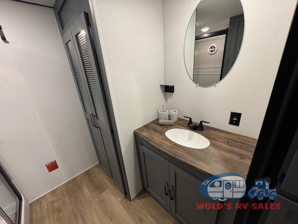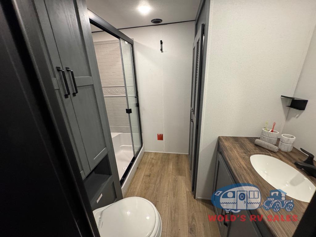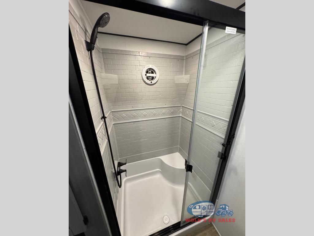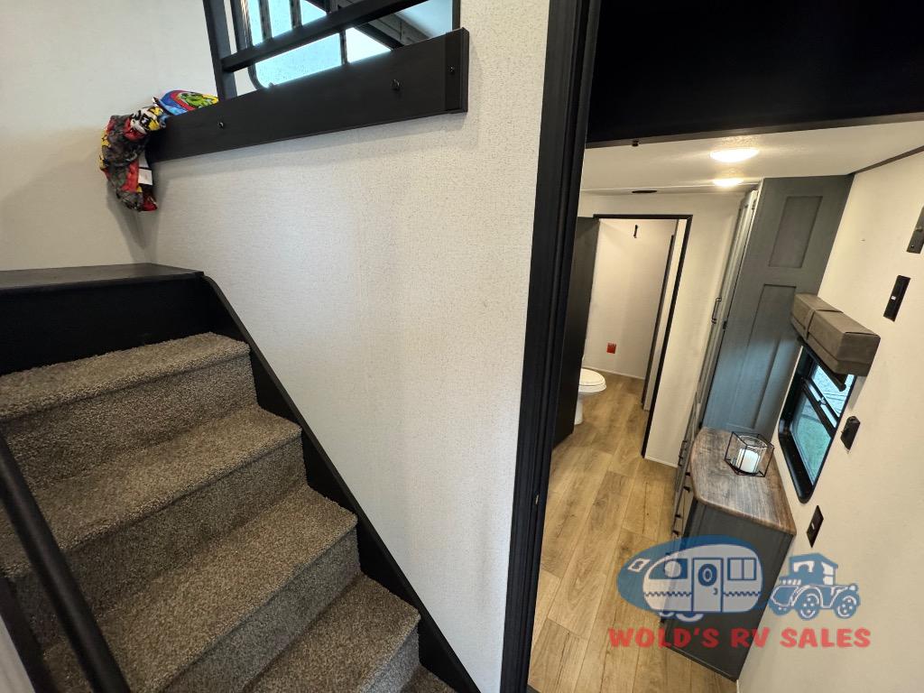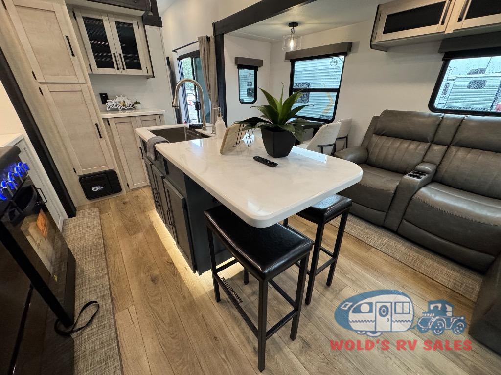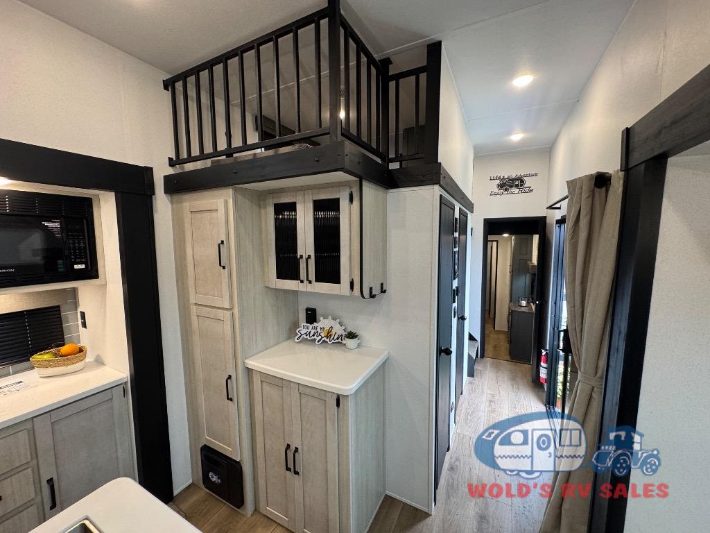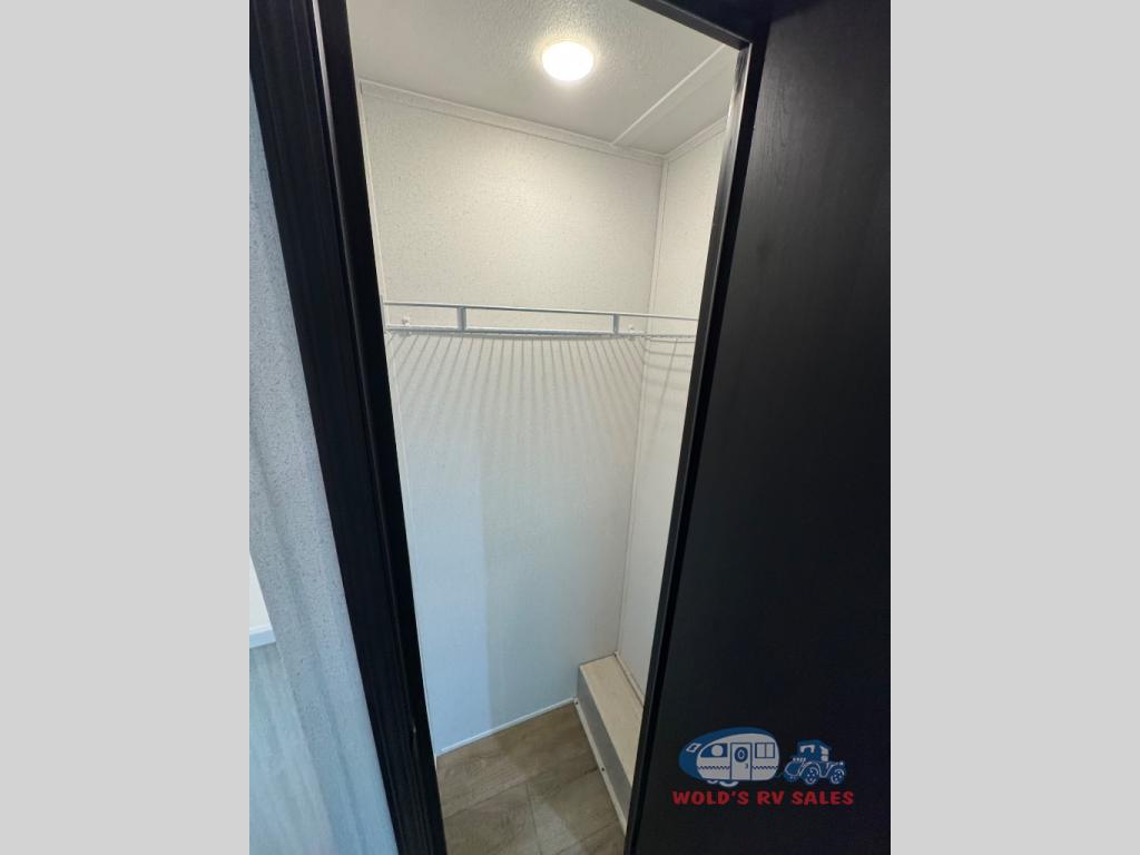 Your crew of eight will love extended stays in this spacious destination trailer. With dual opposing slides in the combined kitchen and living area, everyone can relax comfortably on the L-shaped sofa with recliners at the end or dine at the table and chairs. There is a spacious kitchen island with two chairs, a pantry for dry goods, and even a second, hidden pantry behind the TV for games, movies and more. A full bath is located right as you enter the unit for added convenience, and you'll find the second full bath up front in the master bedroom. You're sure to enjoy the king bed slide out here, along with a dresser and a wardrobe/closet to keep your things tidy. There is even washer and dryer prep in the front bath if you choose to add these appliances. Your guests or little ones will love the loft that includes two 54" x 74" bunk mats and storage on one side, plus a third bunk mat (32" x 74") and storage on the other!