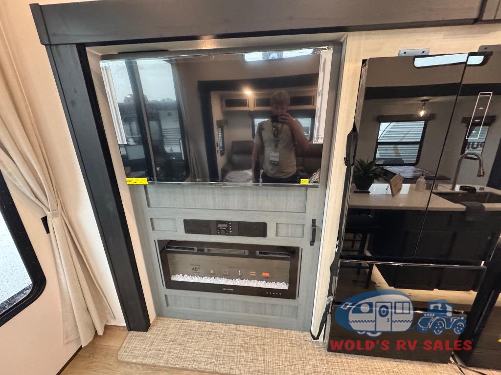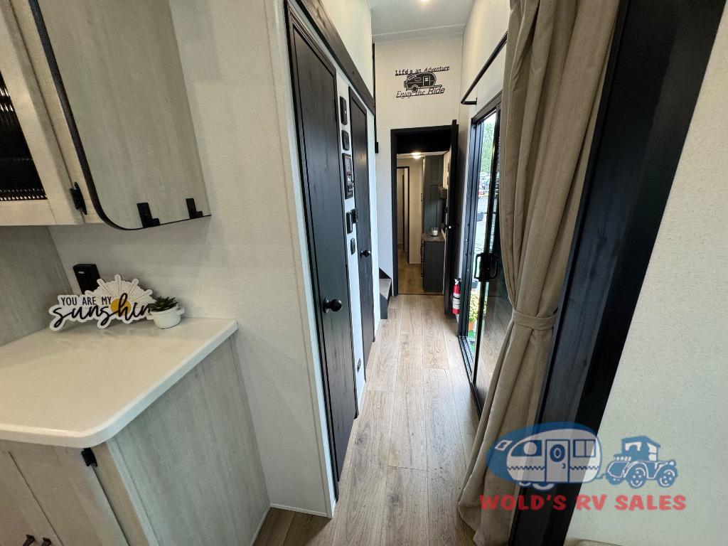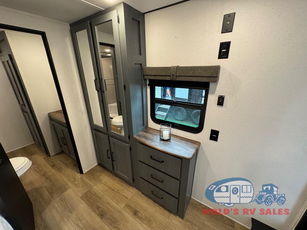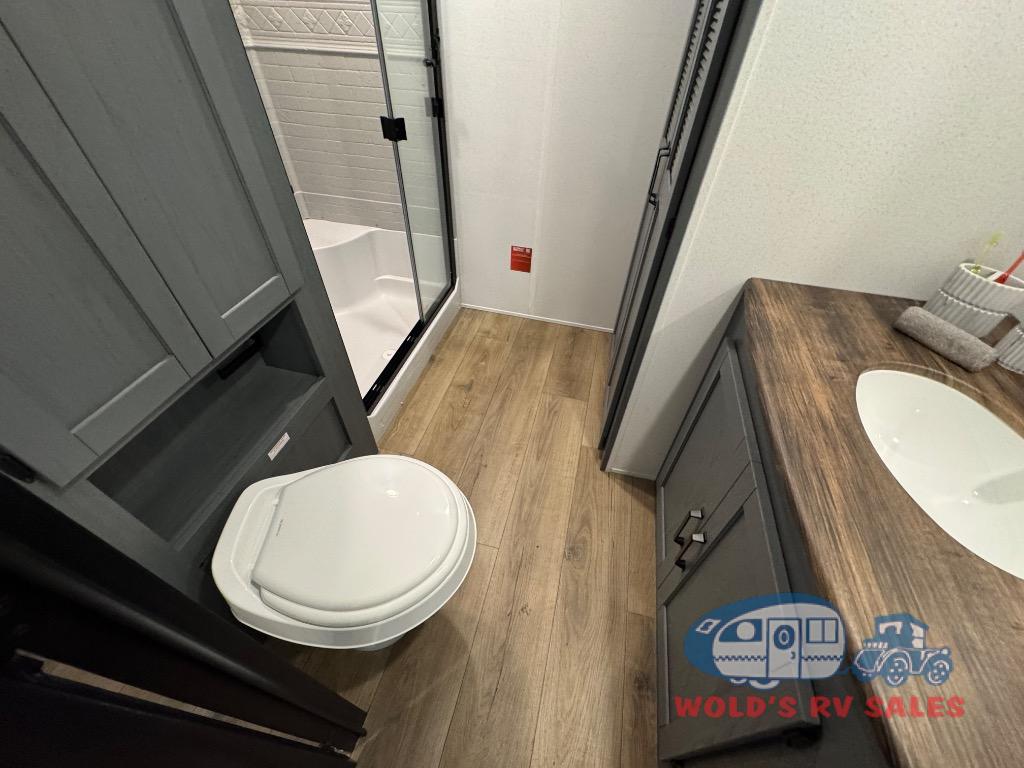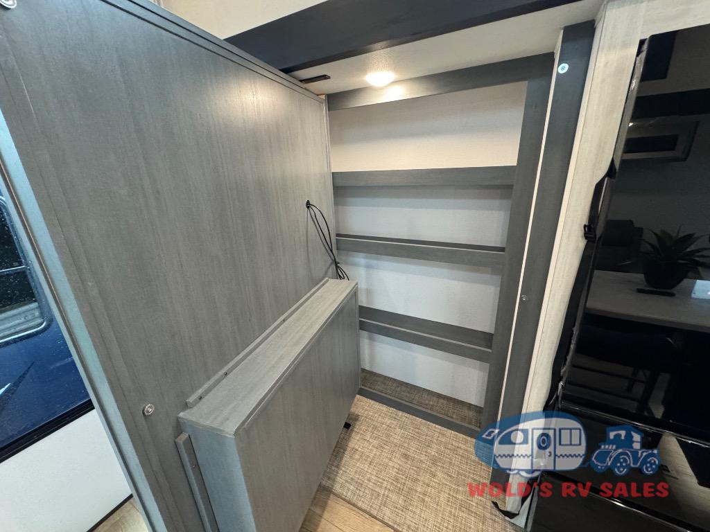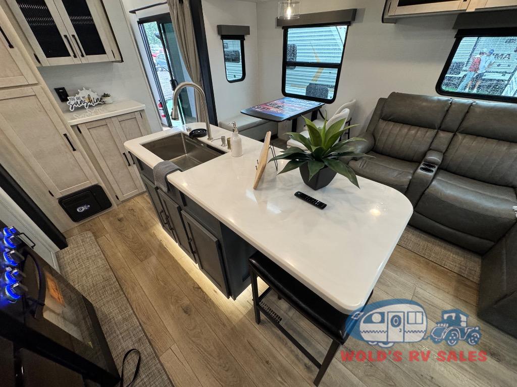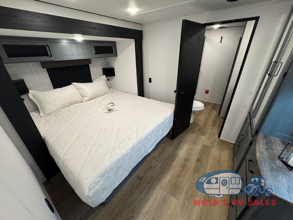 Your crew of eight will love extended stays in this spacious destination trailer. With dual opposing slides in the combined kitchen and living area, everyone can relax comfortably on the L-shaped sofa with recliners at the end or dine at the table and chairs. There is a spacious kitchen island with two chairs, a pantry for dry goods, and even a second, hidden pantry behind the TV for games, movies and more. A full bath is located right as you enter the unit for added convenience, and you'll find the second full bath up front in the master bedroom. You're sure to enjoy the king bed slide out here, along with a dresser and a wardrobe/closet to keep your things tidy. There is even washer and dryer prep in the front bath if you choose to add these appliances. Your guests or little ones will love the loft that includes two 54" x 74" bunk mats and storage on one side, plus a third bunk mat (32" x 74") and storage on the other!