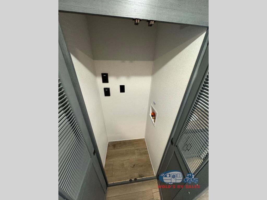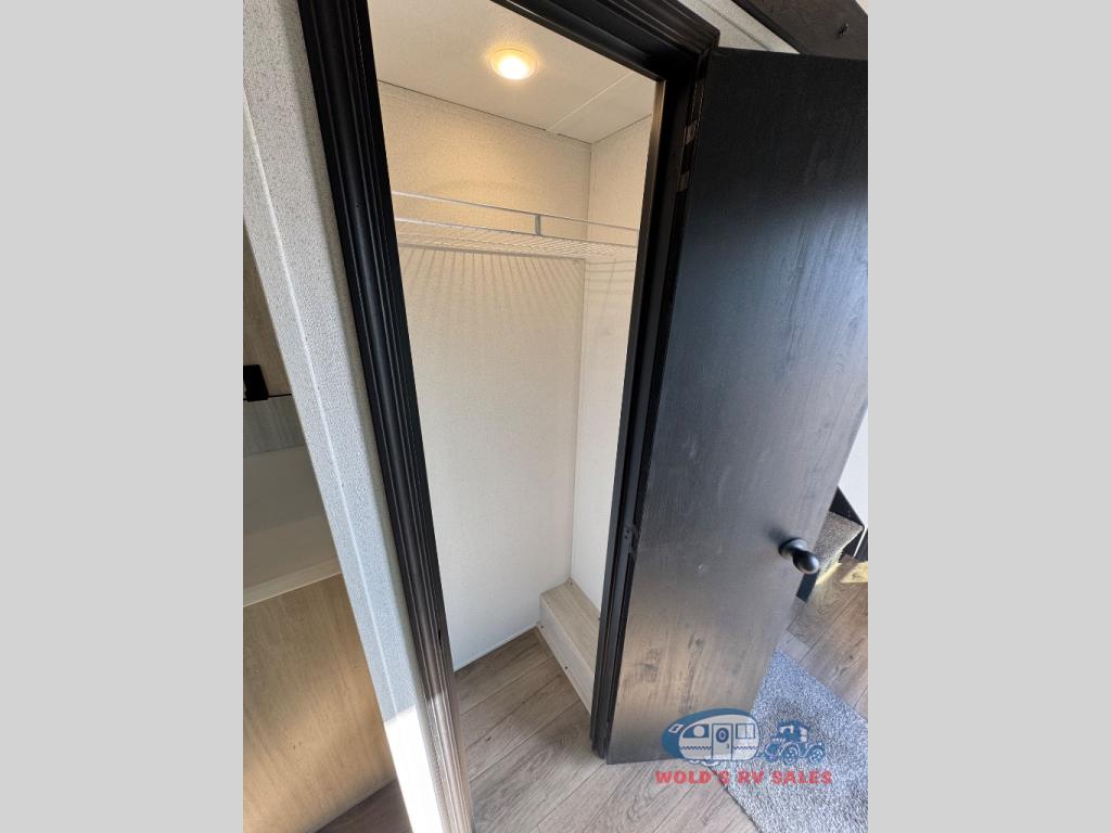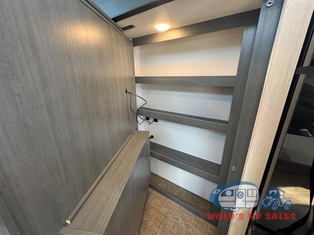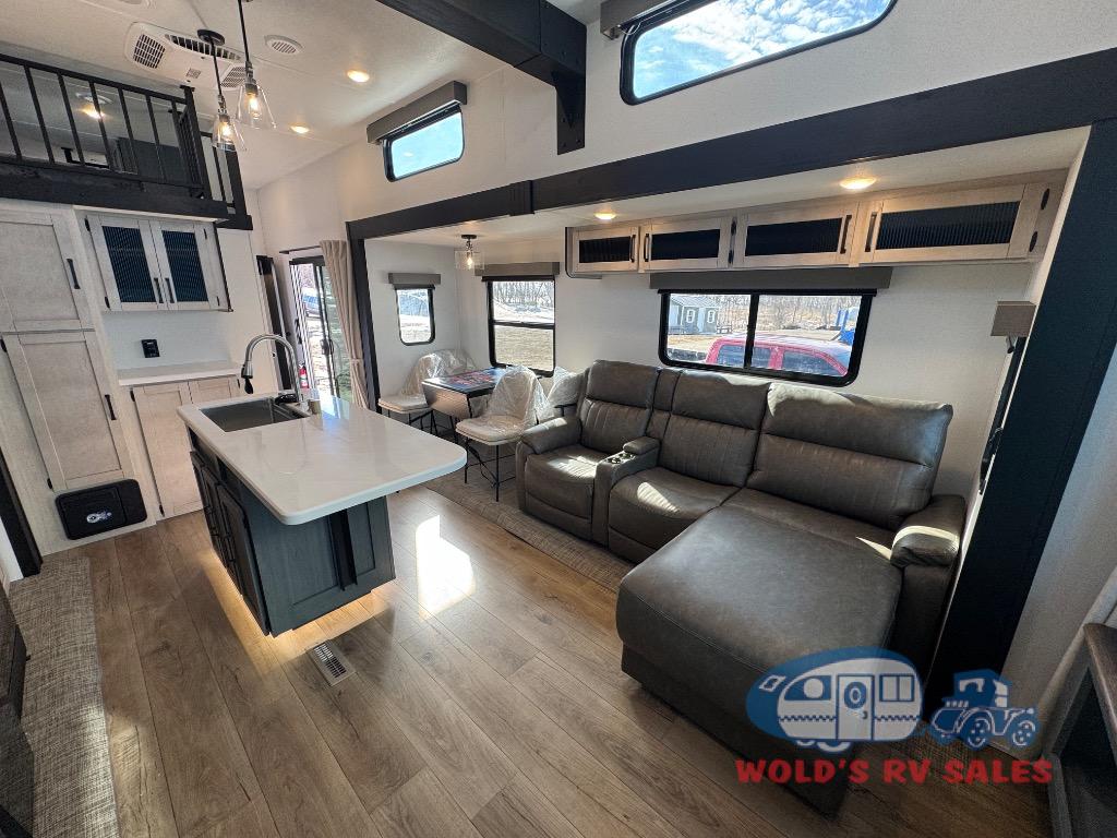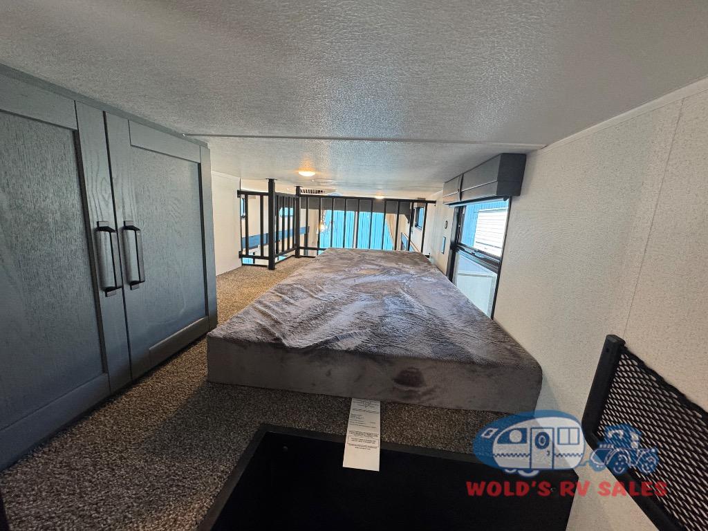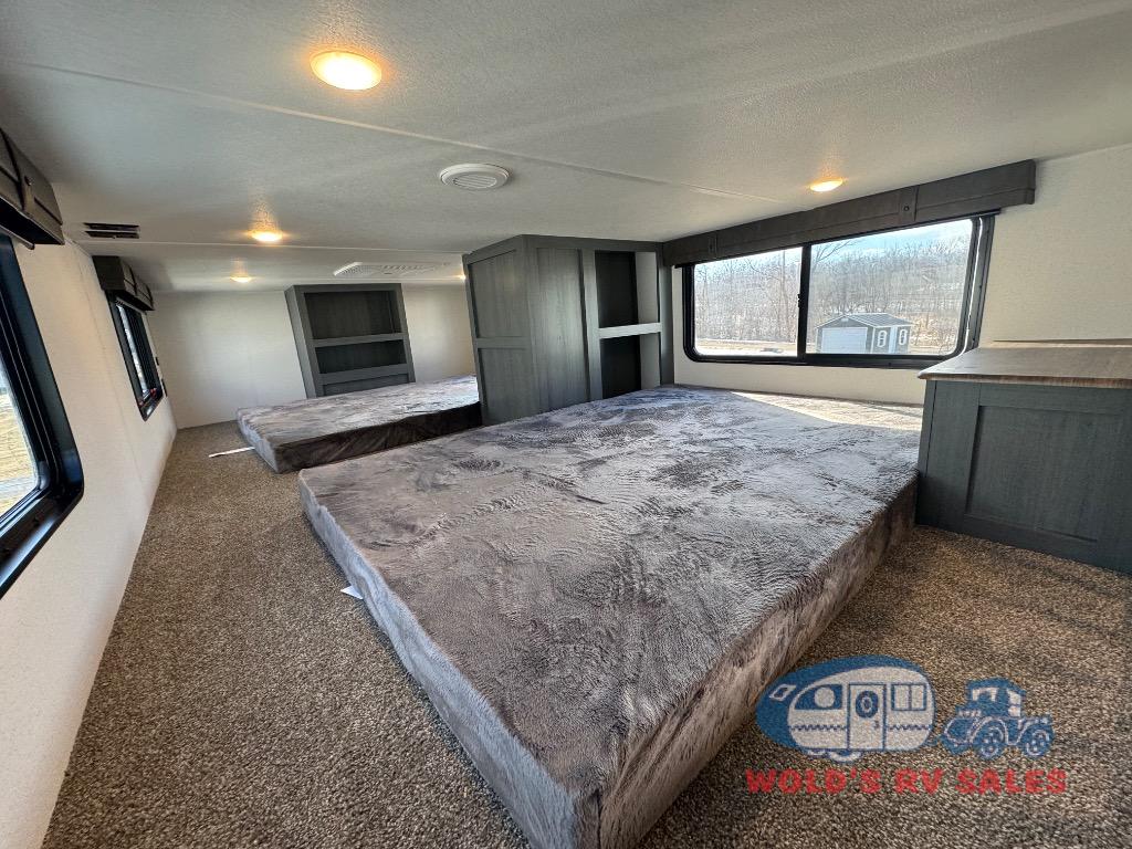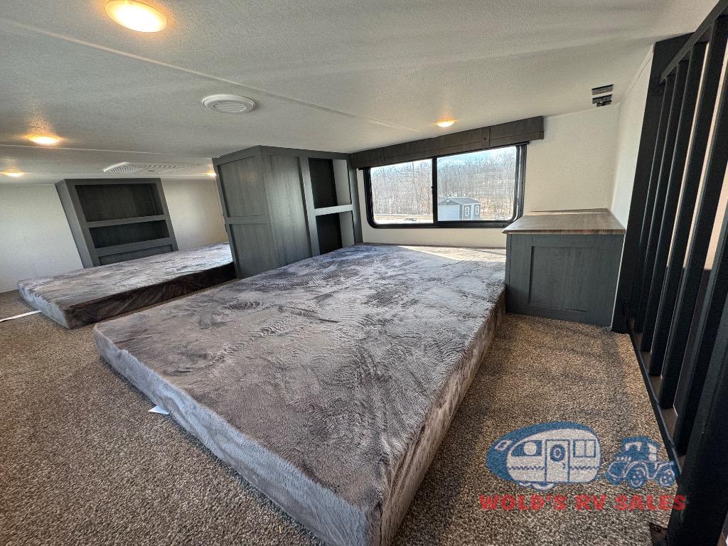 Your crew of eight will love extended stays in this spacious destination trailer. With dual opposing slides in the combined kitchen and living area, everyone can relax comfortably on the L-shaped sofa with recliners at the end or dine at the table and chairs. There is a spacious kitchen island with two chairs, a pantry for dry goods, and even a second, hidden pantry behind the TV for games, movies and more. A full bath is located right as you enter the unit for added convenience, and you'll find the second full bath up front in the master bedroom. You're sure to enjoy the king bed slide out here, along with a dresser and a wardrobe/closet to keep your things tidy. There is even washer and dryer prep in the front bath if you choose to add these appliances. Your guests or little ones will love the loft that includes two 54" x 74" bunk mats and storage on one side, plus a third bunk mat (32" x 74") and storage on the other!