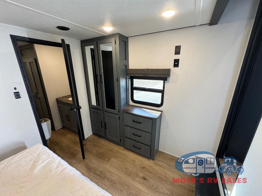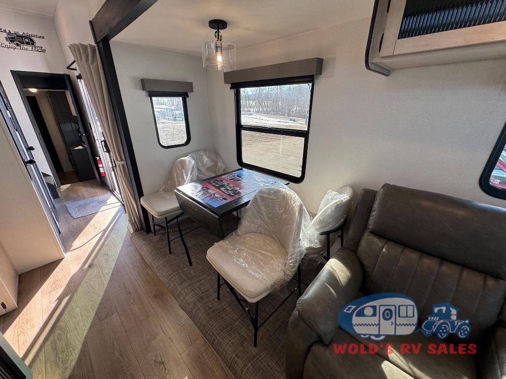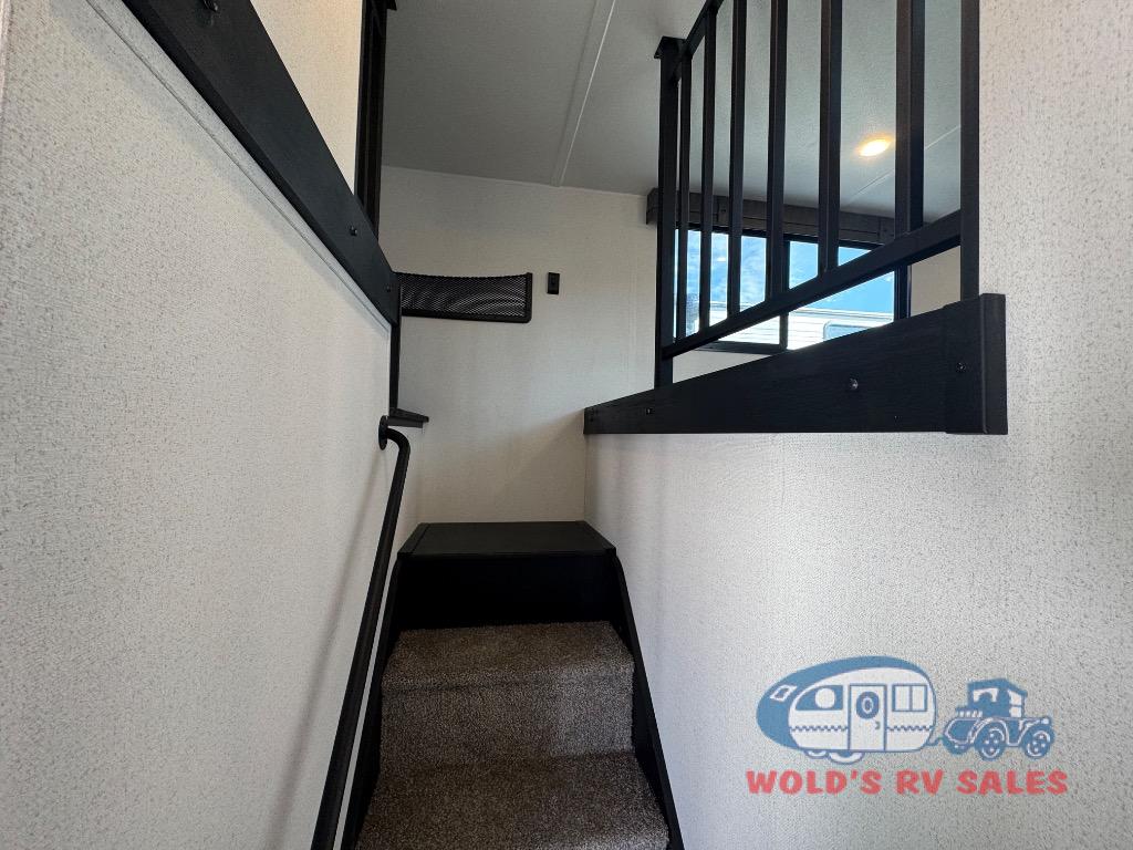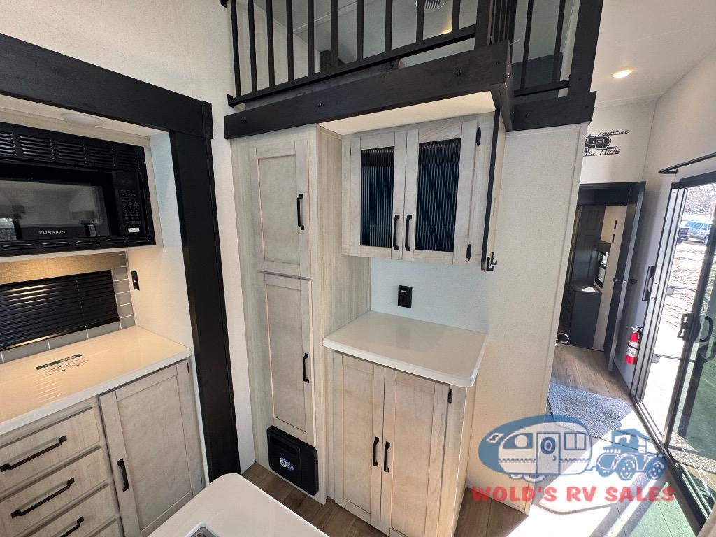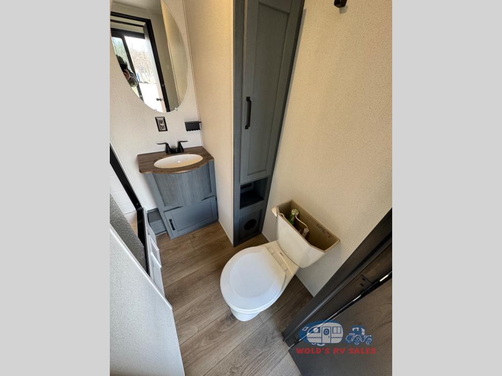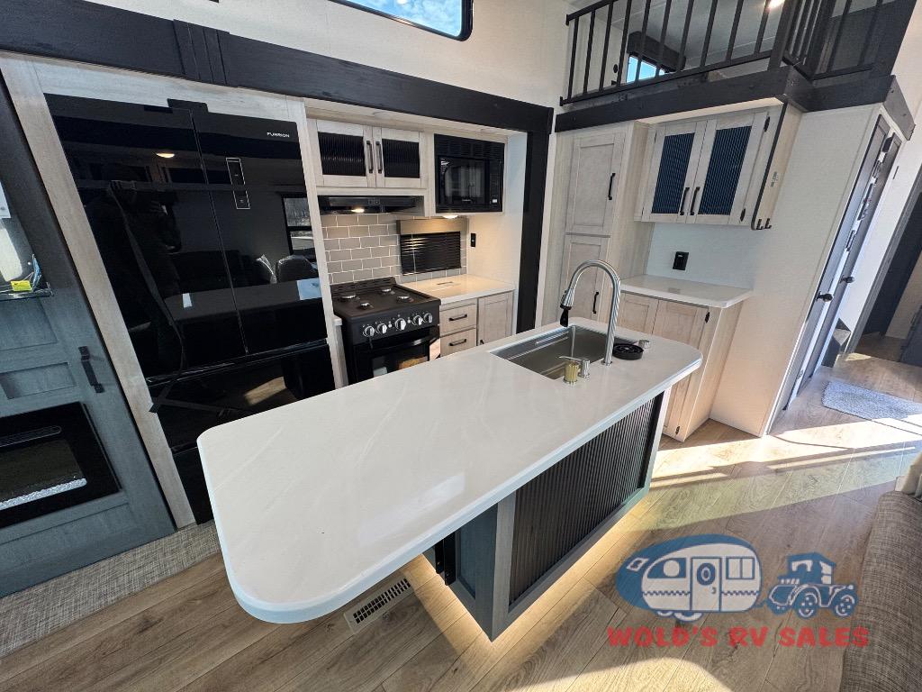 Your crew of eight will love extended stays in this spacious destination trailer. With dual opposing slides in the combined kitchen and living area, everyone can relax comfortably on the L-shaped sofa with recliners at the end or dine at the table and chairs. There is a spacious kitchen island with two chairs, a pantry for dry goods, and even a second, hidden pantry behind the TV for games, movies and more. A full bath is located right as you enter the unit for added convenience, and you'll find the second full bath up front in the master bedroom. You're sure to enjoy the king bed slide out here, along with a dresser and a wardrobe/closet to keep your things tidy. There is even washer and dryer prep in the front bath if you choose to add these appliances. Your guests or little ones will love the loft that includes two 54" x 74" bunk mats and storage on one side, plus a third bunk mat (32" x 74") and storage on the other!