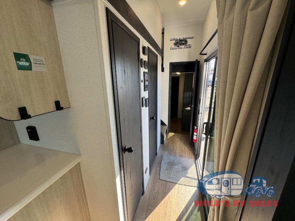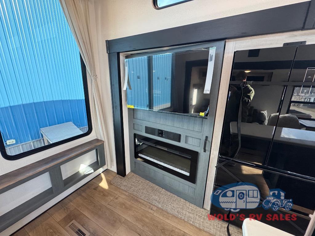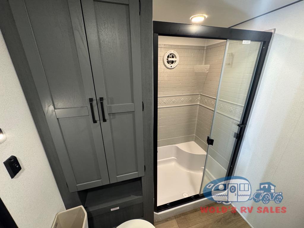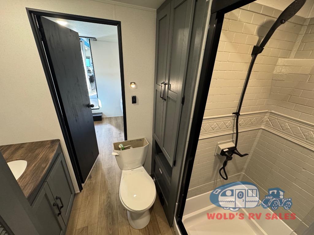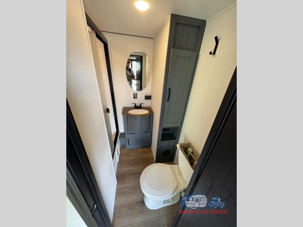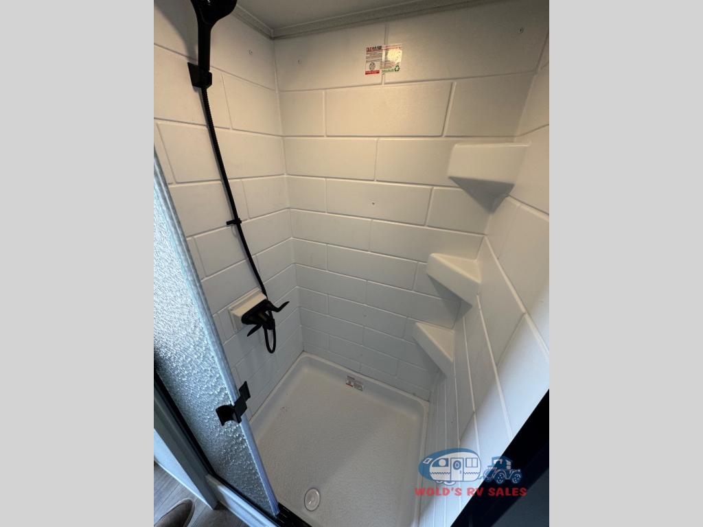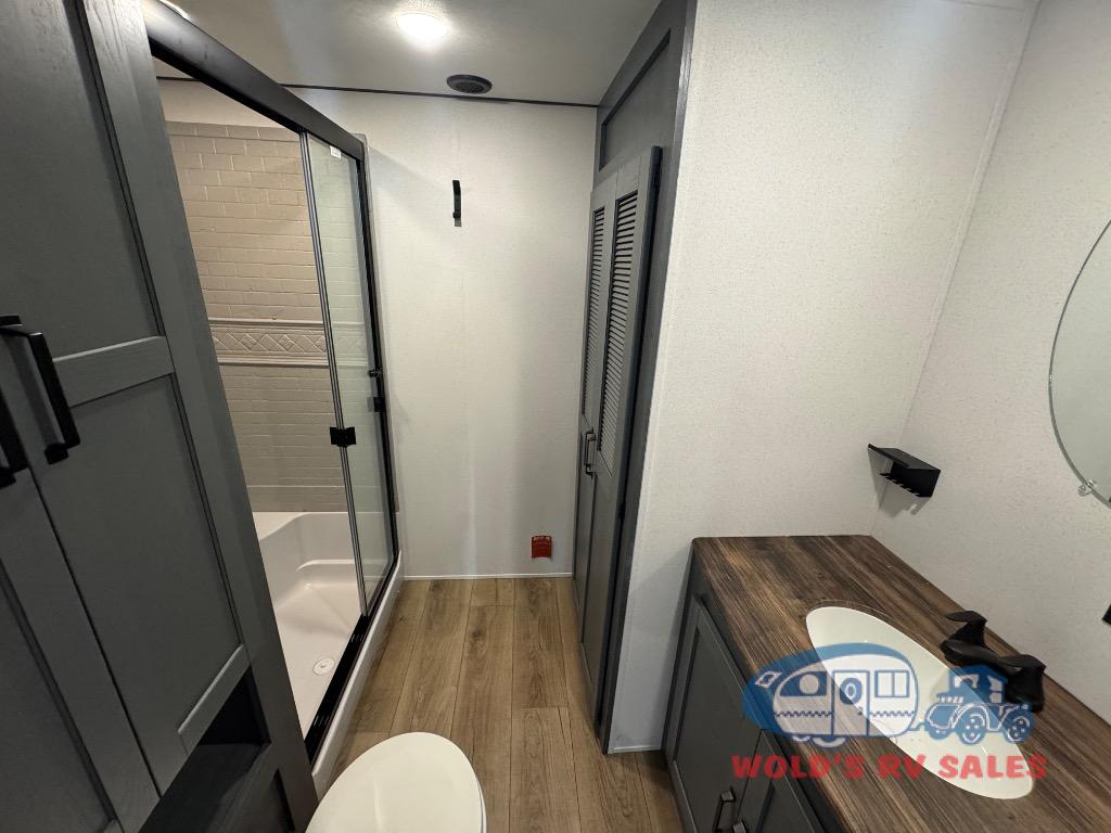 Your crew of eight will love extended stays in this spacious destination trailer. With dual opposing slides in the combined kitchen and living area, everyone can relax comfortably on the L-shaped sofa with recliners at the end or dine at the table and chairs. There is a spacious kitchen island with two chairs, a pantry for dry goods, and even a second, hidden pantry behind the TV for games, movies and more. A full bath is located right as you enter the unit for added convenience, and you'll find the second full bath up front in the master bedroom. You're sure to enjoy the king bed slide out here, along with a dresser and a wardrobe/closet to keep your things tidy. There is even washer and dryer prep in the front bath if you choose to add these appliances. Your guests or little ones will love the loft that includes two 54" x 74" bunk mats and storage on one side, plus a third bunk mat (32" x 74") and storage on the other!