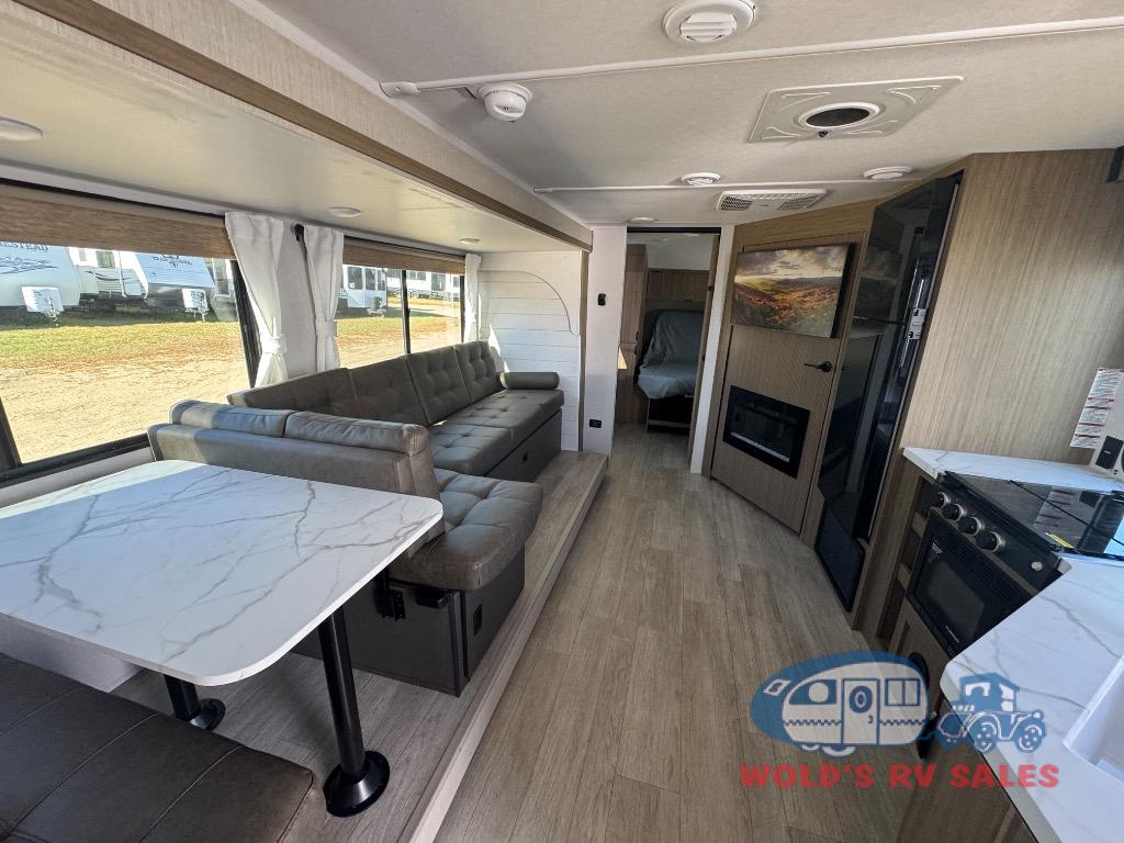 You're sure to make camping memories in this spacious travel trailer! You can easily sleep eight people each night thanks to the double-size bunks, the custom king bed with Versa Tilt in the front bedroom plus the Versa-Lounge within the large slide out! The cooktop and microwave oven will let you make meals each day, and you'll appreciate the hidden pantry with shelves behind the fireplace. There is also a booth dinette where you can dine together or play a game of cards after dinner is cleaned up, or you may just find yourselves outdoors under the 18' awning with 4K blade lighting. And don't overlook the full bath, complete with a tub/shower that will make bath time easier if you have little ones.