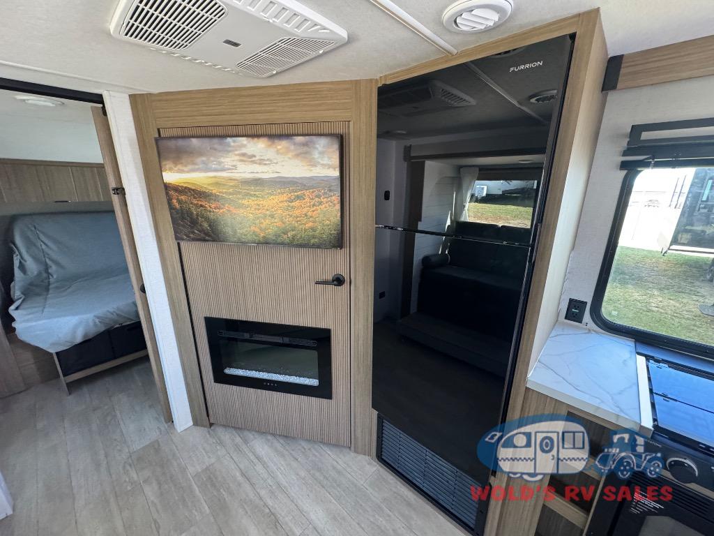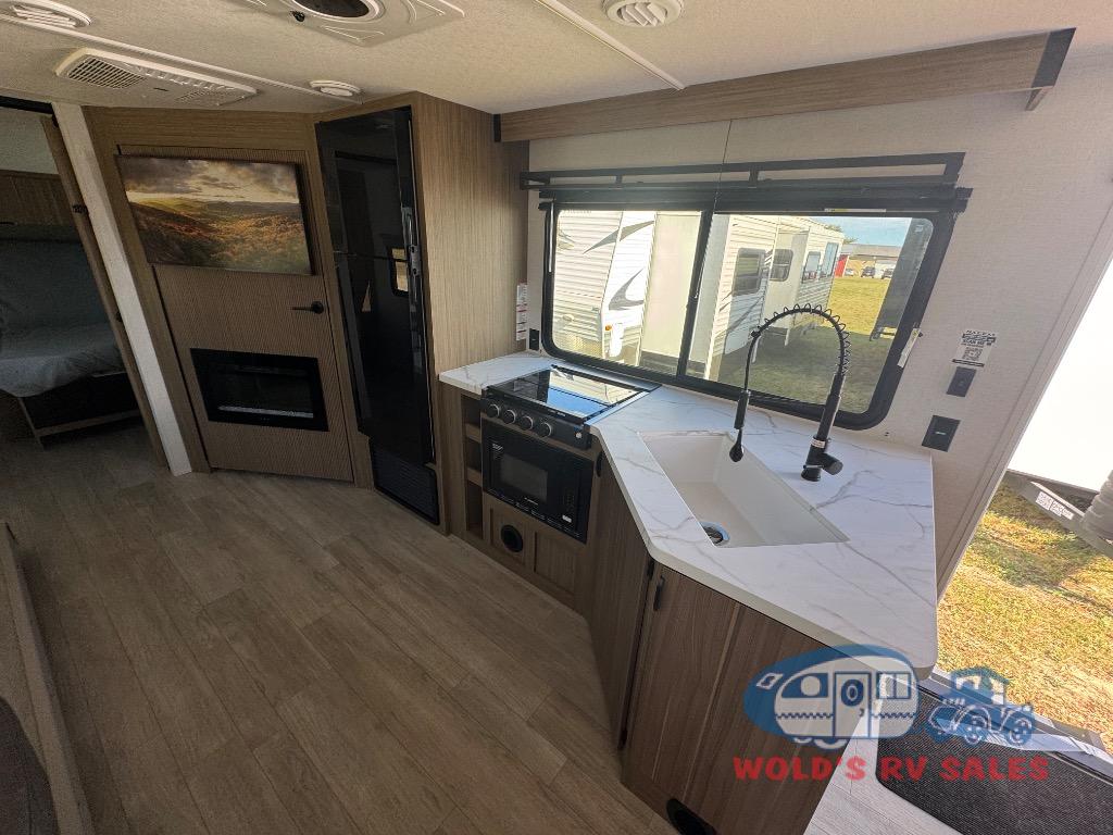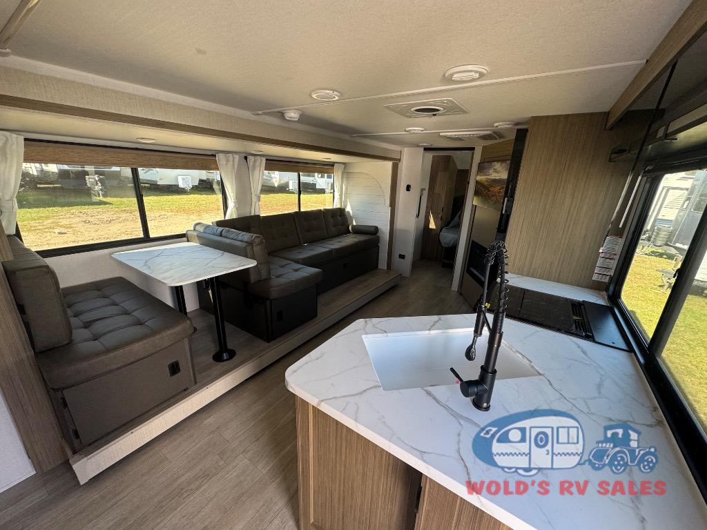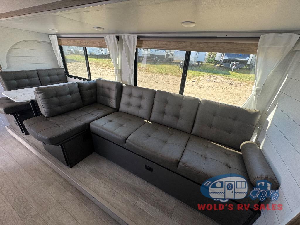 You're sure to make camping memories in this spacious travel trailer! You can easily sleep eight people each night thanks to the double-size bunks, the custom king bed with Versa Tilt in the front bedroom plus the Versa-Lounge within the large slide out! The cooktop and microwave oven will let you make meals each day, and you'll appreciate the hidden pantry with shelves behind the fireplace. There is also a booth dinette where you can dine together or play a game of cards after dinner is cleaned up, or you may just find yourselves outdoors under the 18' awning with 4K blade lighting. And don't overlook the full bath, complete with a tub/shower that will make bath time easier if you have little ones.