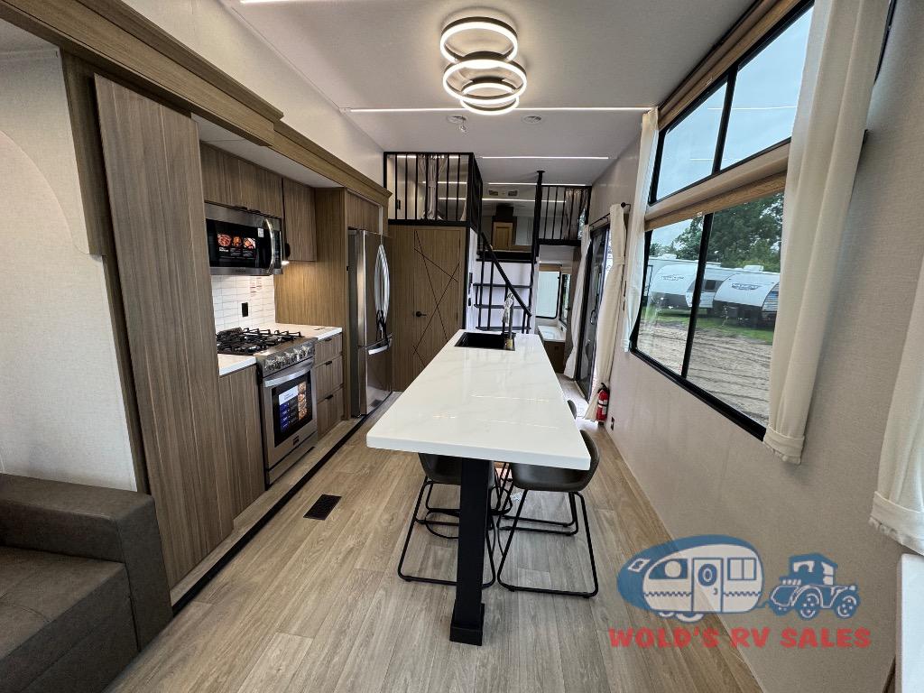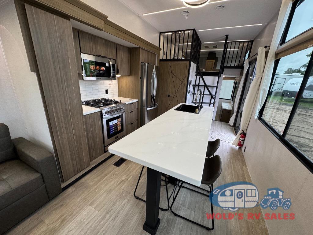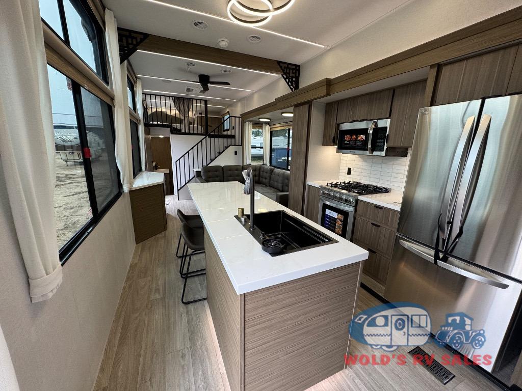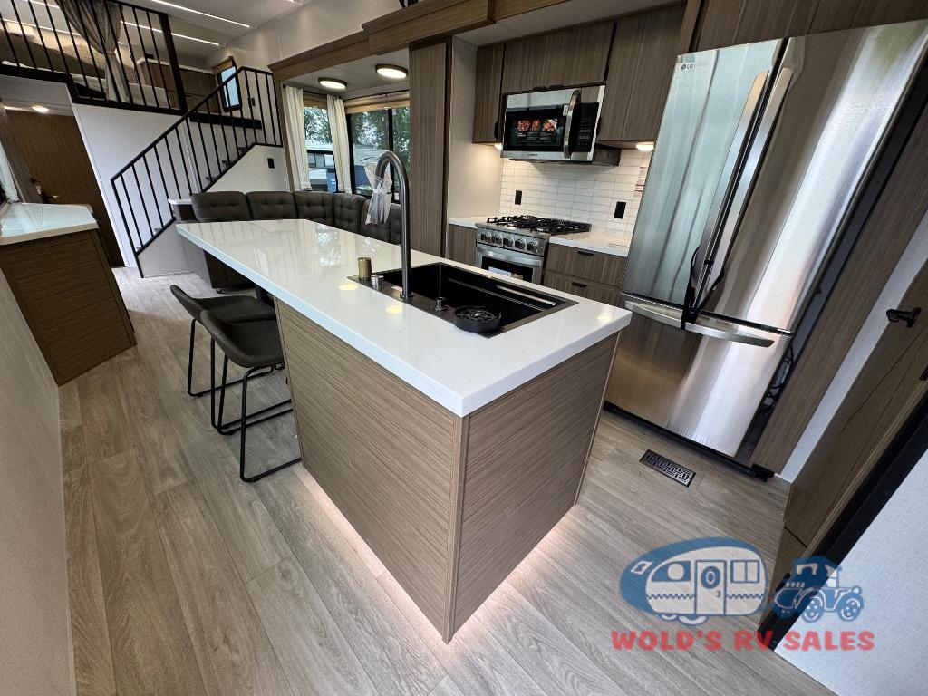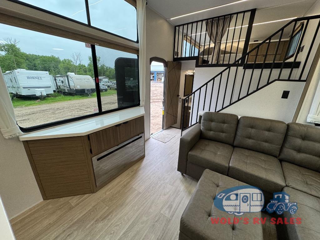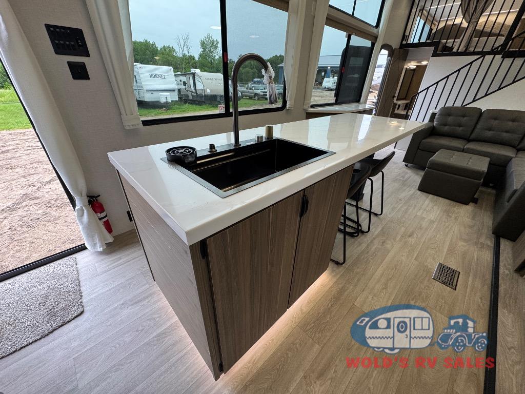 You will feel like you are home when you step inside! Not only will you be impressed with the large slide in the main combined kitchen and living area, but check out the island with four seats! The main entry closest to the front features a step up to a private bedroom featuring a custom king bed with Versa-Tilt within a slide, plus a fireplace, wardrobe, and a dress for your belongings. Just outside this door is a half bath around the corner and a spiral staircase to the front loft with two 42" x 74" bunk mats above. The kitchen is fully equipped for you to provide the best home cooked meals with a roll-out pantry, range and microwave, plus side-by-side refrigerator all part of the large slide that also houses an L-shaped sectional sofa with ottoman so everyone can have a seat! Opposite the sectional find an entertainment center with pop-up TV and fireplace. A second set of stairs leads up to the rear loft featuring a 62" x 74" Versa Queen mattress and a dresser. Back down in the very back of the unit, there is a large bathroom with a walk-in shower, linen cabinet, toilet, and vanity with a sink. There is also a space that has washer/dryer prep to add even more convenience. Outside, a 26' awning for outdoor living, and double entry doors to make it easy to move in and out.
