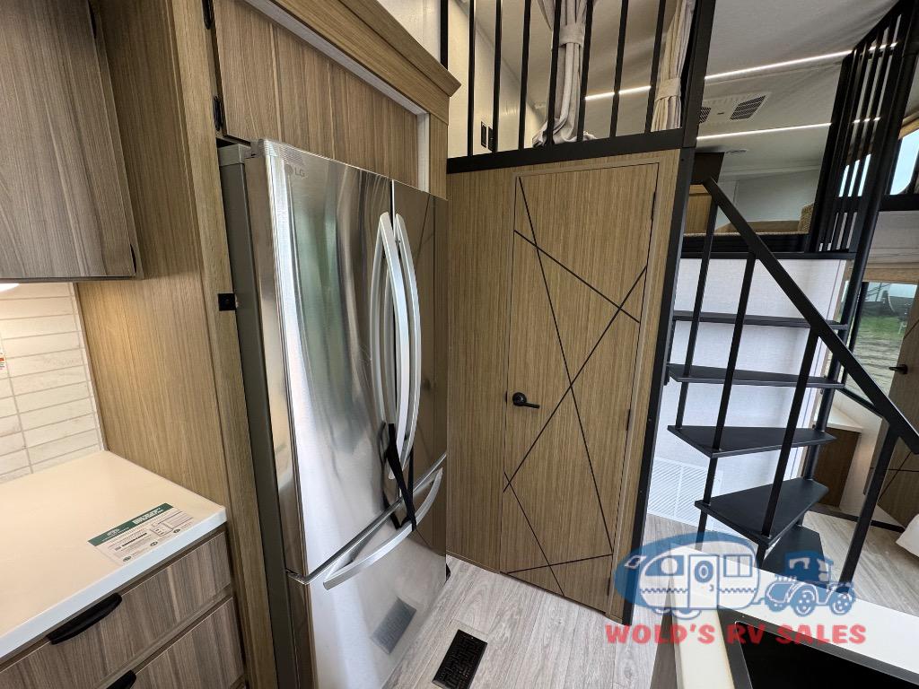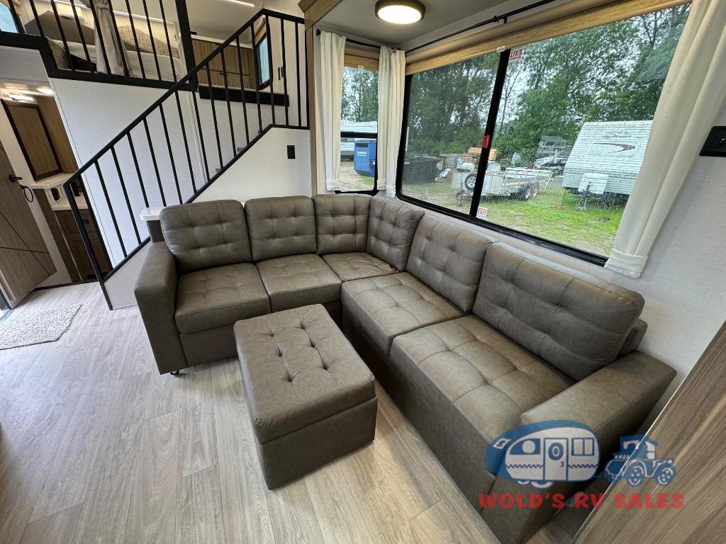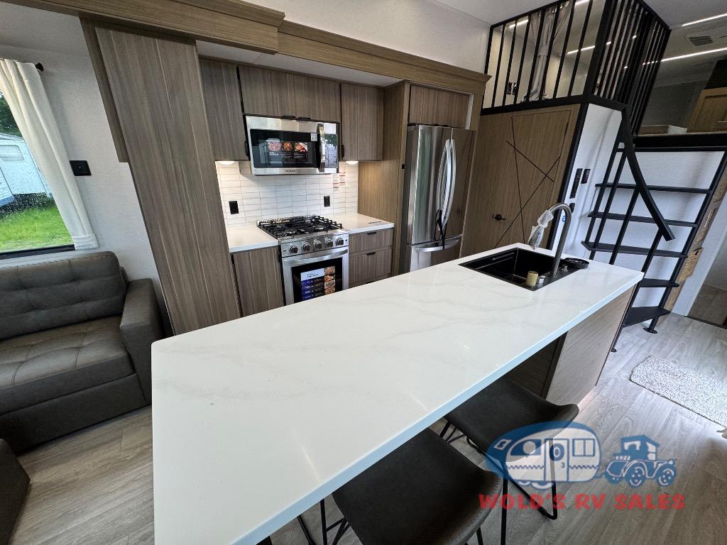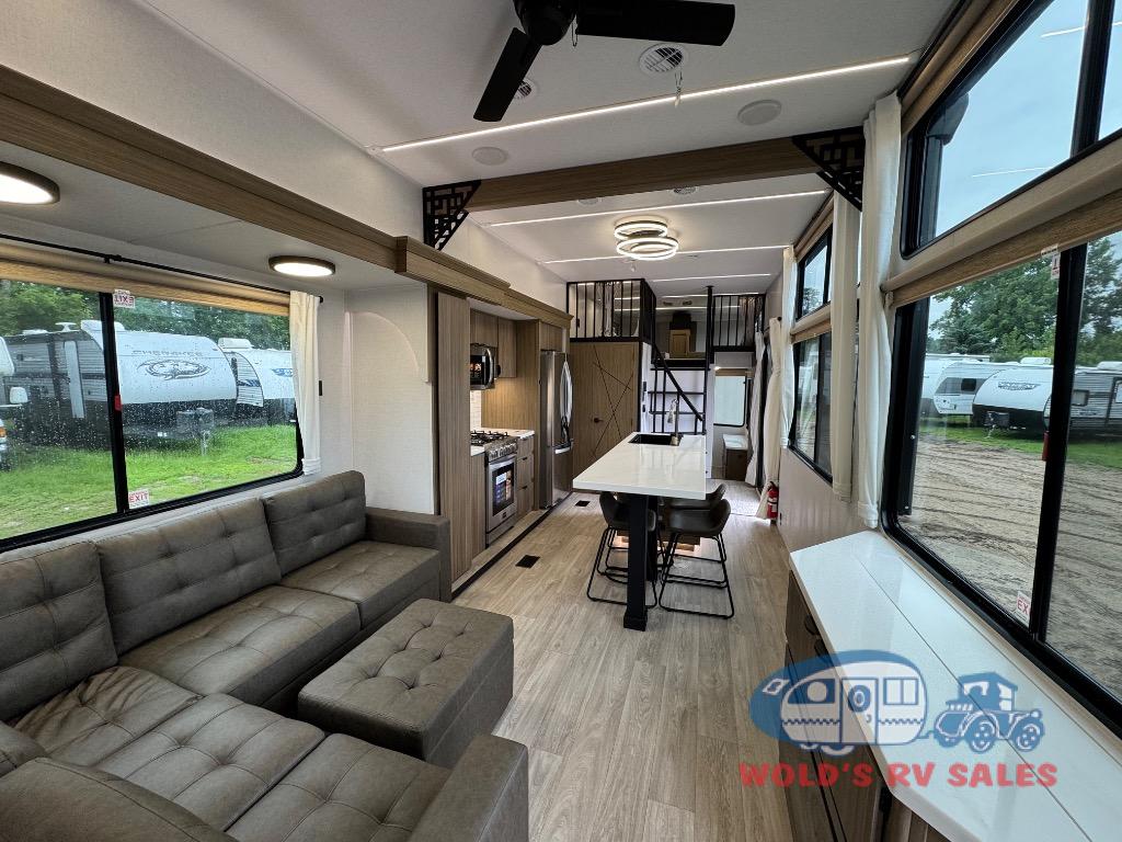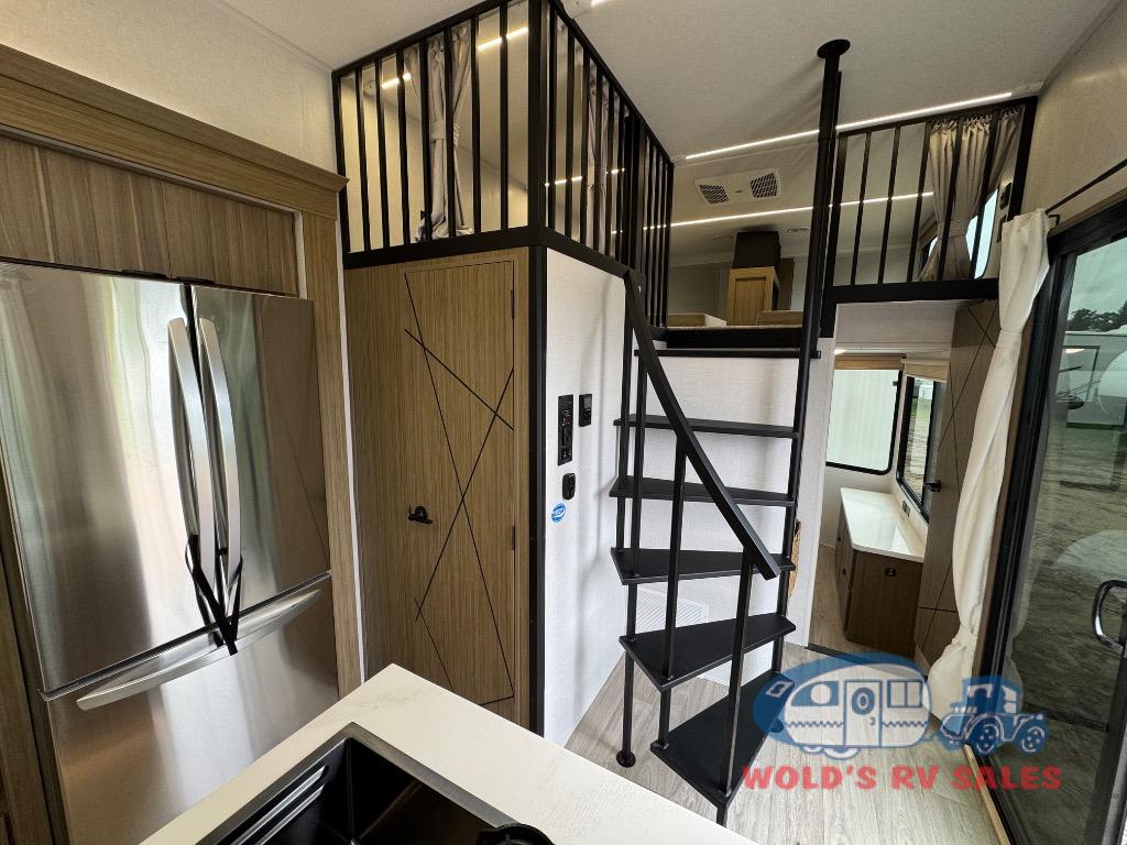 You will feel like you are home when you step inside! Not only will you be impressed with the large slide in the main combined kitchen and living area, but check out the island with four seats! The main entry closest to the front features a step up to a private bedroom featuring a custom king bed with Versa-Tilt within a slide, plus a fireplace, wardrobe, and a dress for your belongings. Just outside this door is a half bath around the corner and a spiral staircase to the front loft with two 42" x 74" bunk mats above. The kitchen is fully equipped for you to provide the best home cooked meals with a roll-out pantry, range and microwave, plus side-by-side refrigerator all part of the large slide that also houses an L-shaped sectional sofa with ottoman so everyone can have a seat! Opposite the sectional find an entertainment center with pop-up TV and fireplace. A second set of stairs leads up to the rear loft featuring a 62" x 74" Versa Queen mattress and a dresser. Back down in the very back of the unit, there is a large bathroom with a walk-in shower, linen cabinet, toilet, and vanity with a sink. There is also a space that has washer/dryer prep to add even more convenience. Outside, a 26' awning for outdoor living, and double entry doors to make it easy to move in and out.