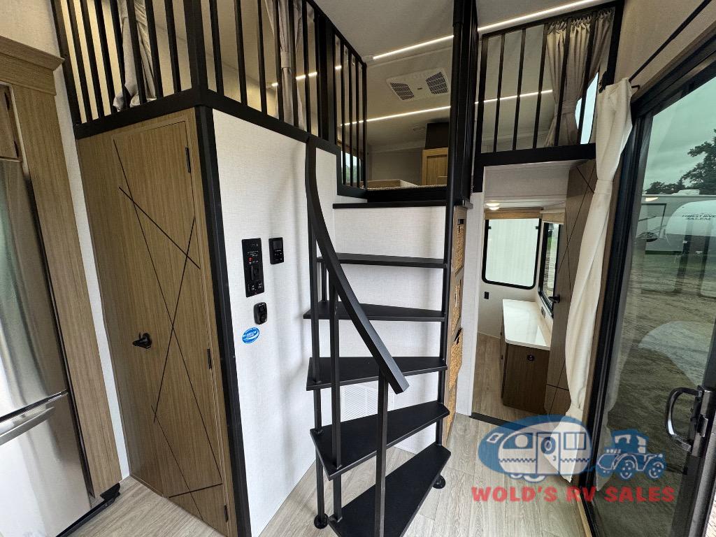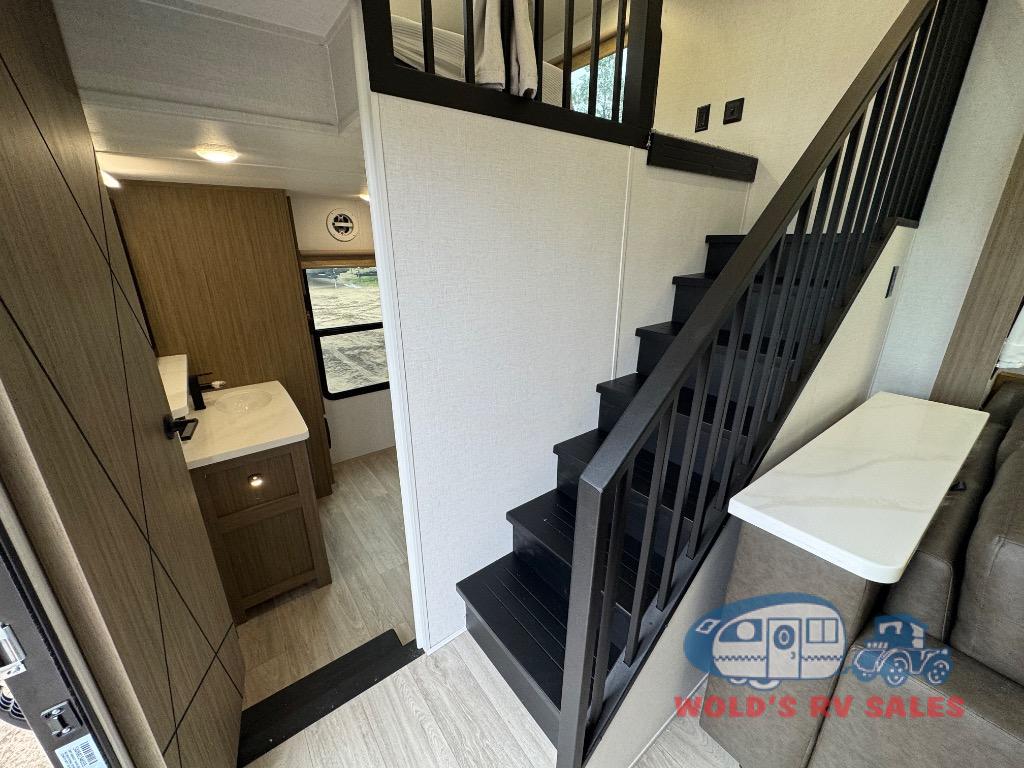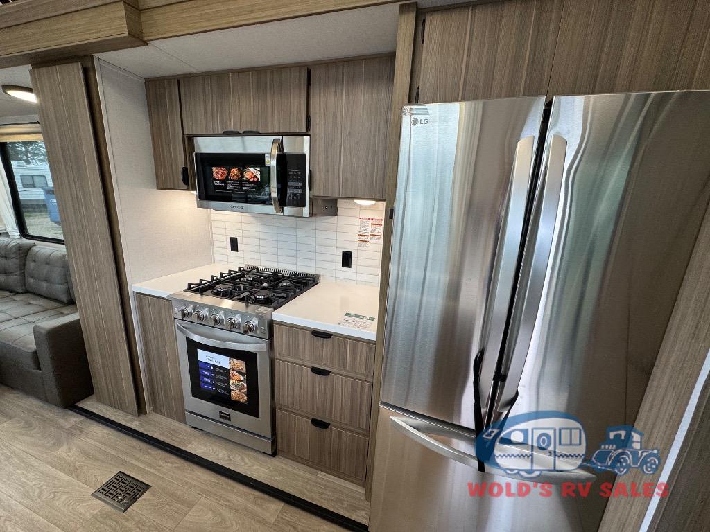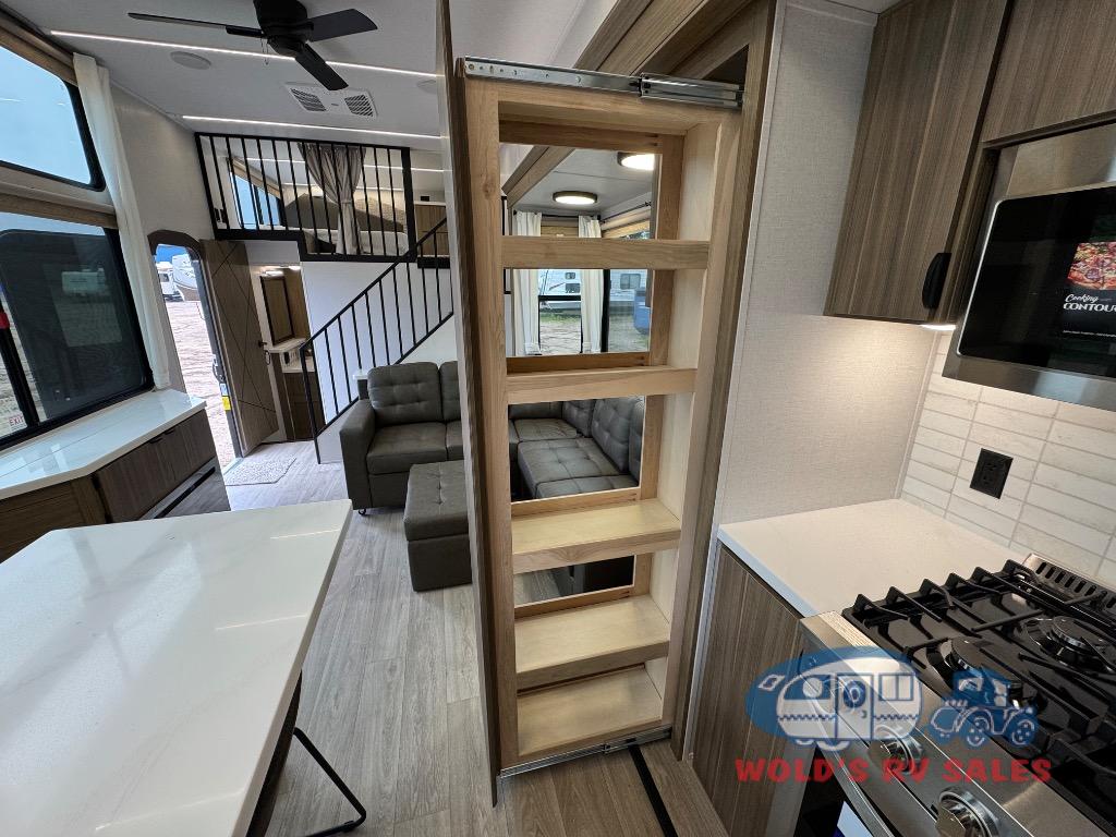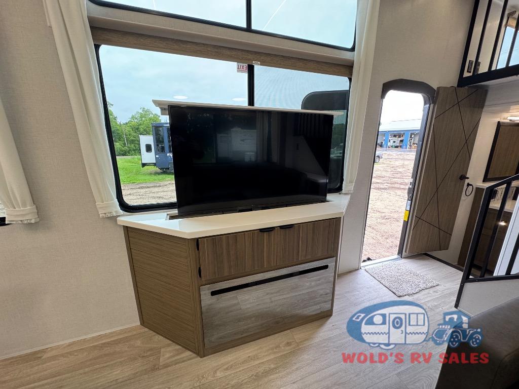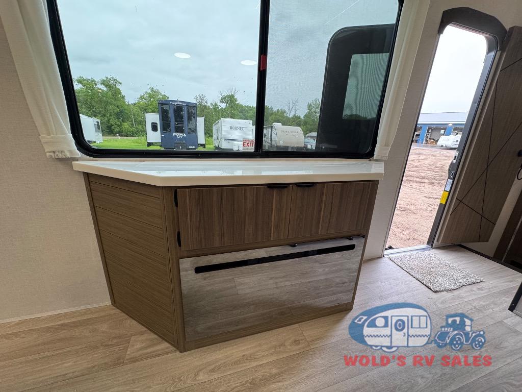 You will feel like you are home when you step inside! Not only will you be impressed with the large slide in the main combined kitchen and living area, but check out the island with four seats! The main entry closest to the front features a step up to a private bedroom featuring a custom king bed with Versa-Tilt within a slide, plus a fireplace, wardrobe, and a dress for your belongings. Just outside this door is a half bath around the corner and a spiral staircase to the front loft with two 42" x 74" bunk mats above. The kitchen is fully equipped for you to provide the best home cooked meals with a roll-out pantry, range and microwave, plus side-by-side refrigerator all part of the large slide that also houses an L-shaped sectional sofa with ottoman so everyone can have a seat! Opposite the sectional find an entertainment center with pop-up TV and fireplace. A second set of stairs leads up to the rear loft featuring a 62" x 74" Versa Queen mattress and a dresser. Back down in the very back of the unit, there is a large bathroom with a walk-in shower, linen cabinet, toilet, and vanity with a sink. There is also a space that has washer/dryer prep to add even more convenience. Outside, a 26' awning for outdoor living, and double entry doors to make it easy to move in and out.