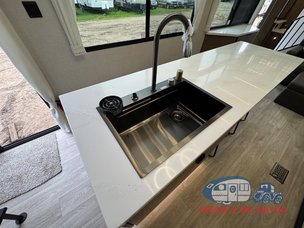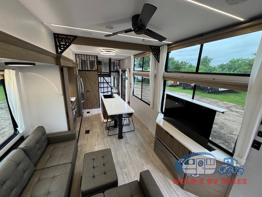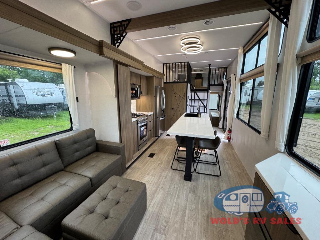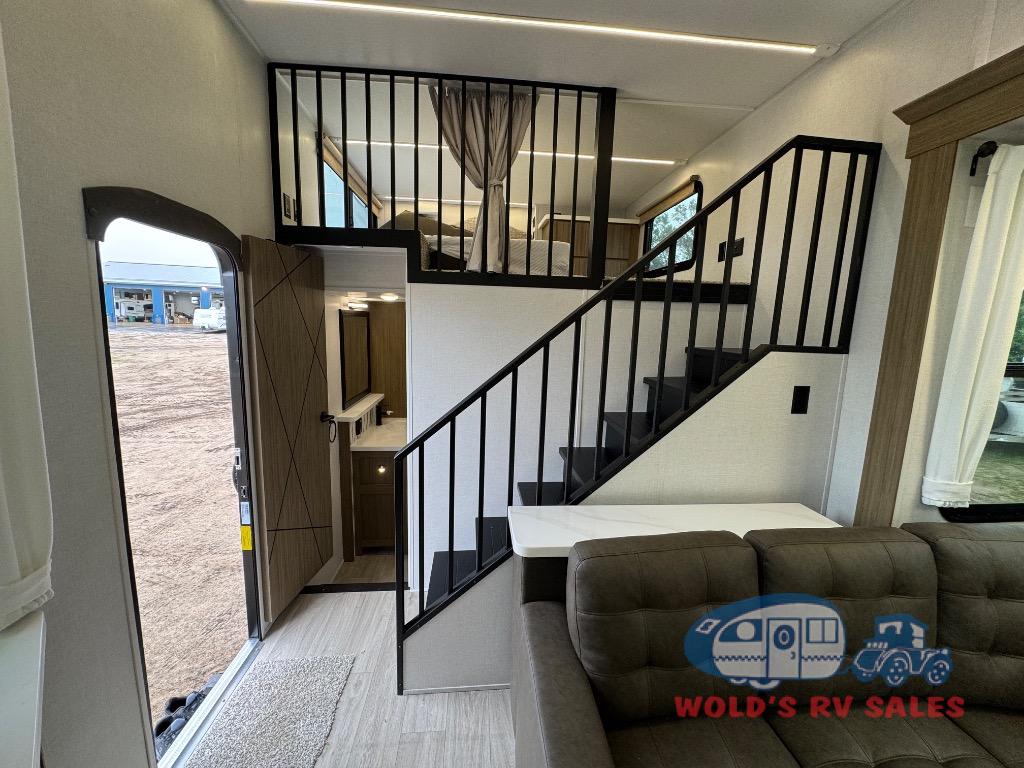 You will feel like you are home when you step inside! Not only will you be impressed with the large slide in the main combined kitchen and living area, but check out the island with four seats! The main entry closest to the front features a step up to a private bedroom featuring a custom king bed with Versa-Tilt within a slide, plus a fireplace, wardrobe, and a dress for your belongings. Just outside this door is a half bath around the corner and a spiral staircase to the front loft with two 42" x 74" bunk mats above. The kitchen is fully equipped for you to provide the best home cooked meals with a roll-out pantry, range and microwave, plus side-by-side refrigerator all part of the large slide that also houses an L-shaped sectional sofa with ottoman so everyone can have a seat! Opposite the sectional find an entertainment center with pop-up TV and fireplace. A second set of stairs leads up to the rear loft featuring a 62" x 74" Versa Queen mattress and a dresser. Back down in the very back of the unit, there is a large bathroom with a walk-in shower, linen cabinet, toilet, and vanity with a sink. There is also a space that has washer/dryer prep to add even more convenience. Outside, a 26' awning for outdoor living, and double entry doors to make it easy to move in and out.