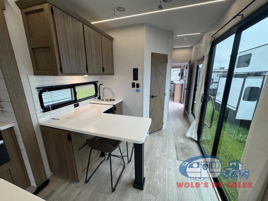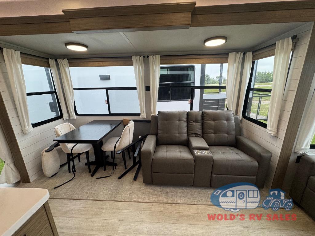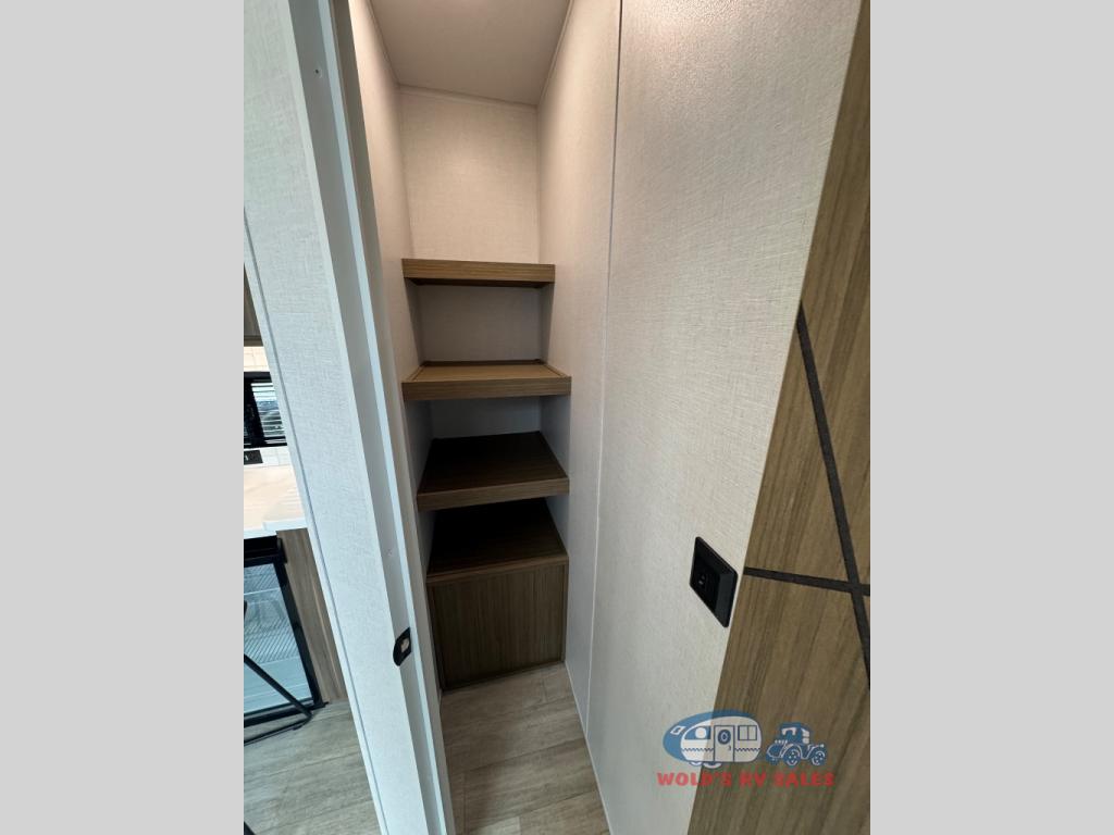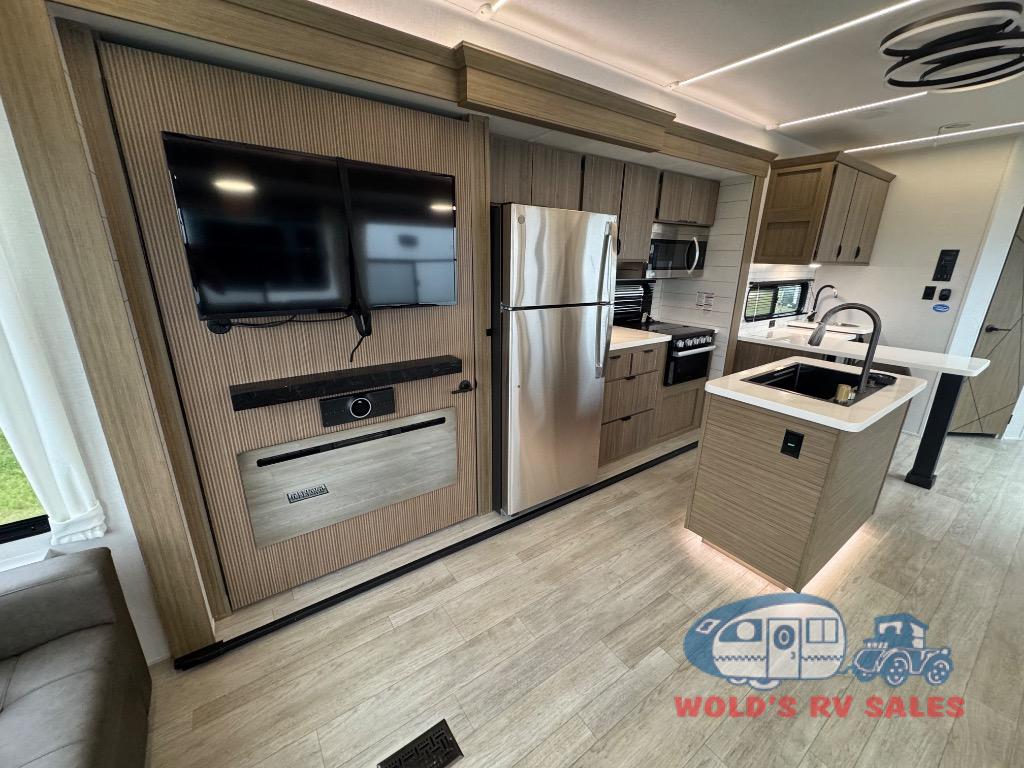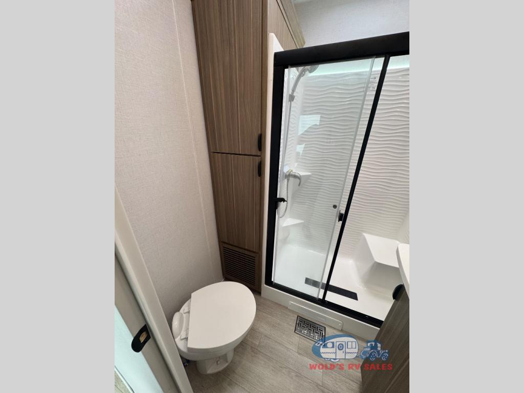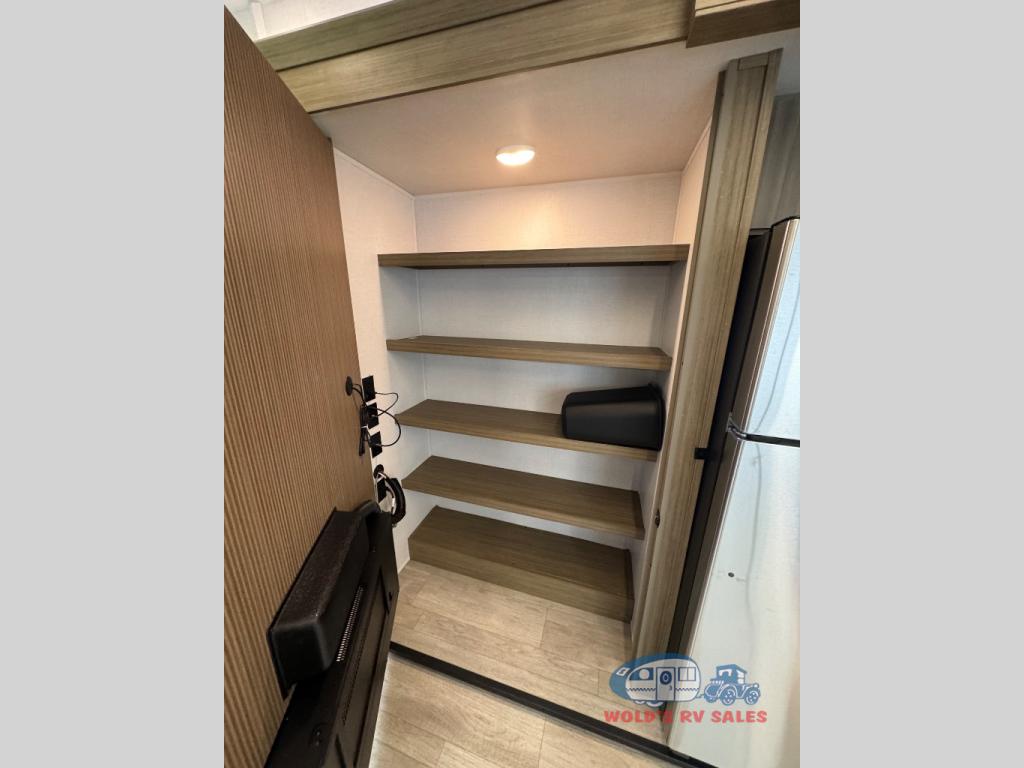 Head to your favorite place for a long weekend, or for the summer with this Salem Villa destination trailer. You are going to love the L-shaped bar area with two bar height chairs plus a sink and mini refrigerator for beverages. The rest of the kitchen area is wide open with dual opposing slides featuring stainless steel appliances, a kitchen island with a double sink, and a dining table with four chairs. The living area, which is combined here, features a sofa and theater seating for movie night or just relaxing. Enjoy the added ambiance from the fireplace with a entertainment center. Head to your right as you enter the main patio door and find a full bath with walk-in shower, toilet, plus a vanity with sink and medicine cabinet overhead. There is also a walk-in pantry for all of your storage needs. Continue on to the front master bedroom where you will enjoy a great night's rest on a king bed with Versa Tilt. There is also a nice closet with optional washer and dryer prep if you want the option to make laundry day easier.