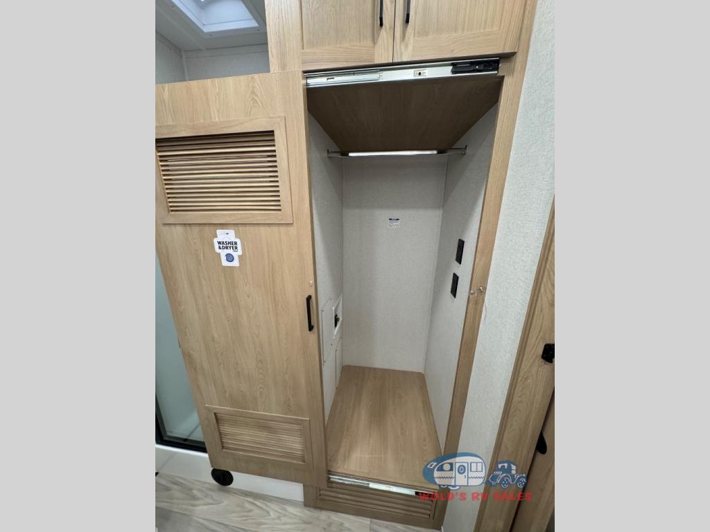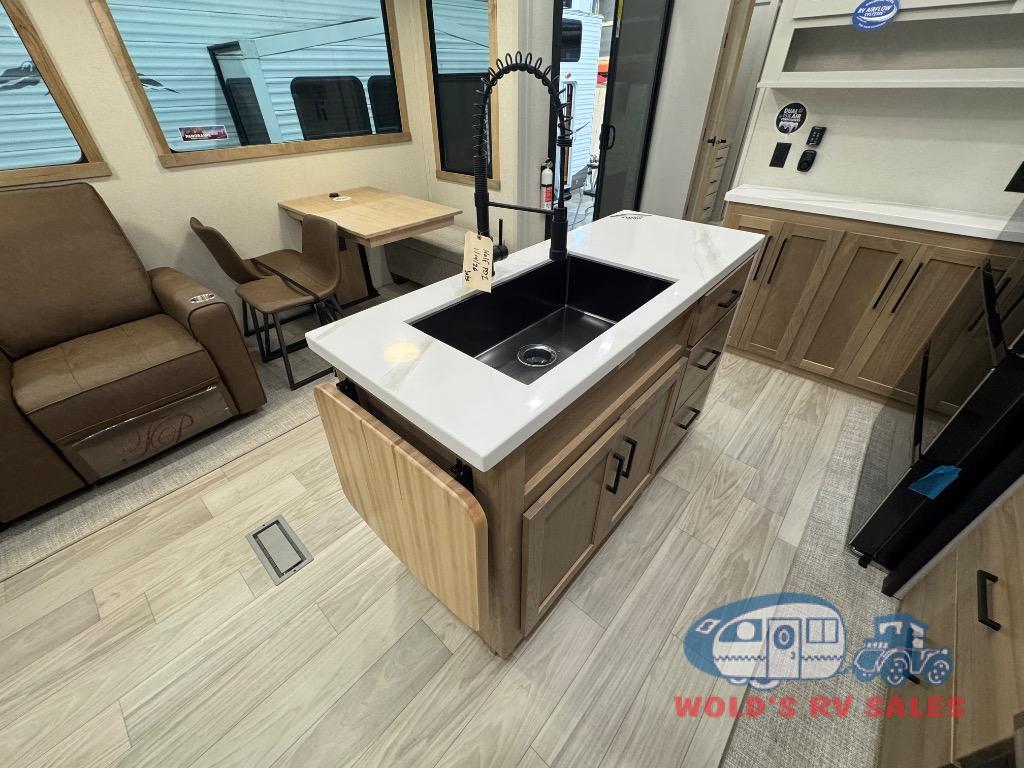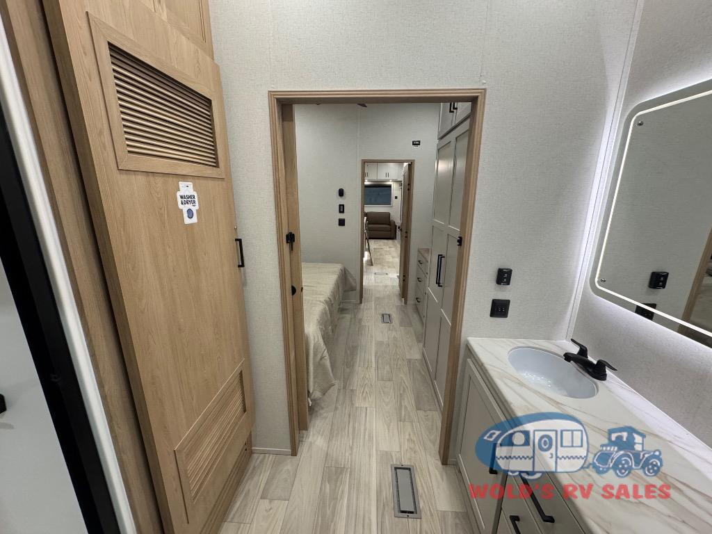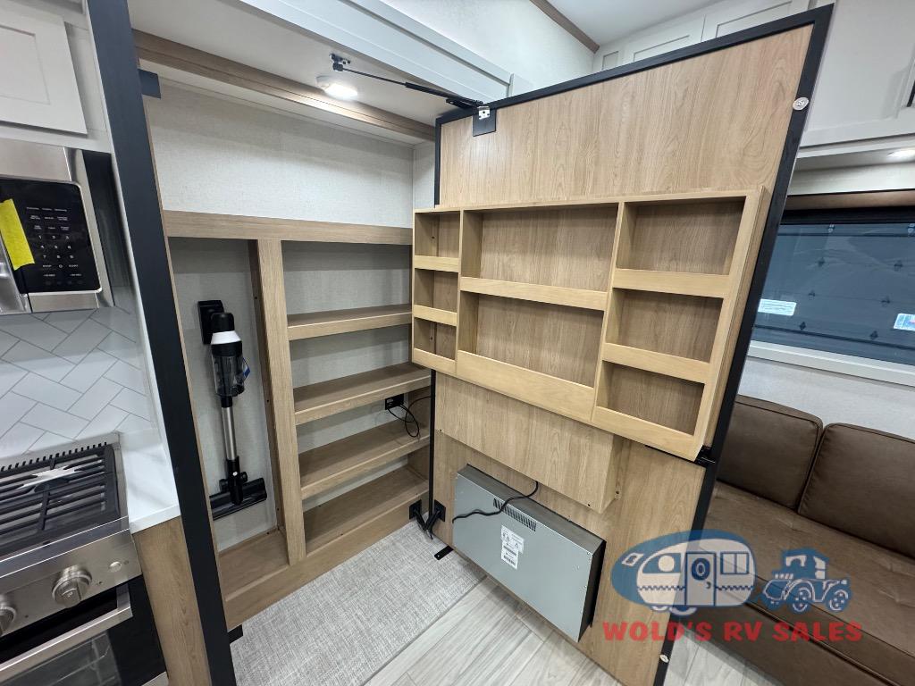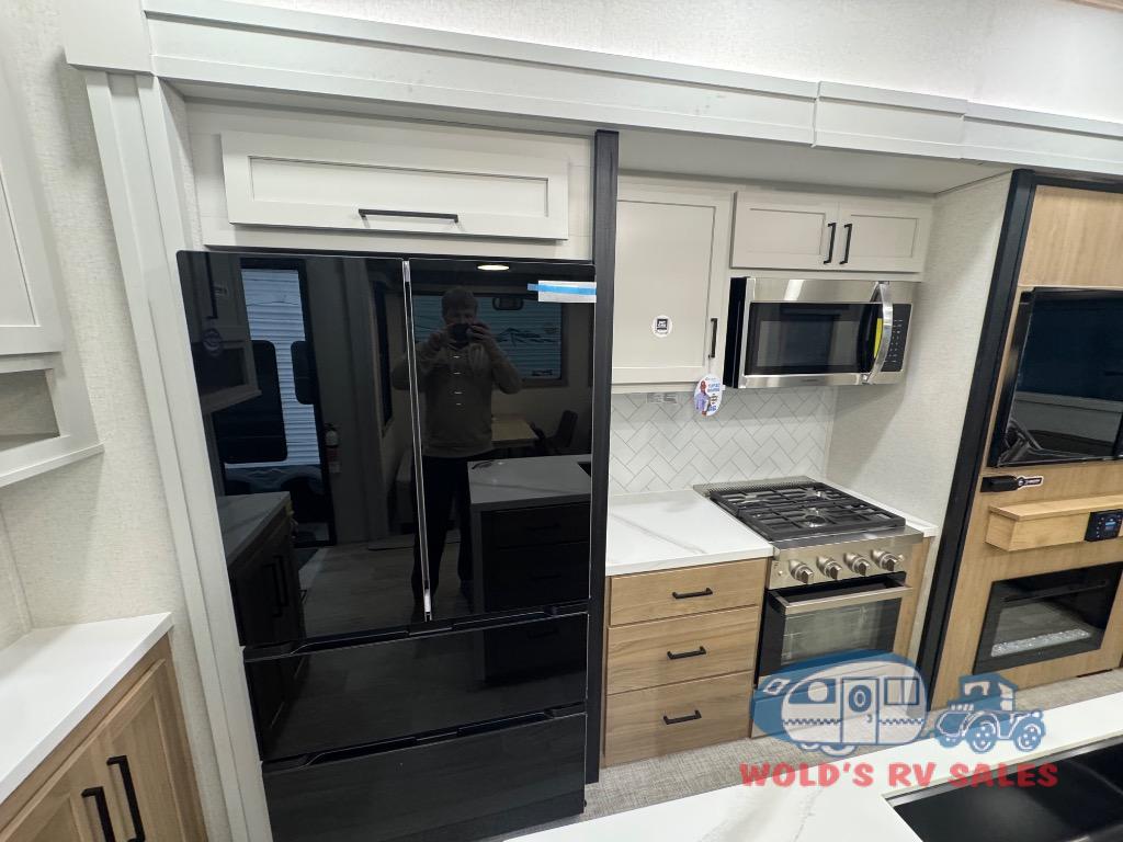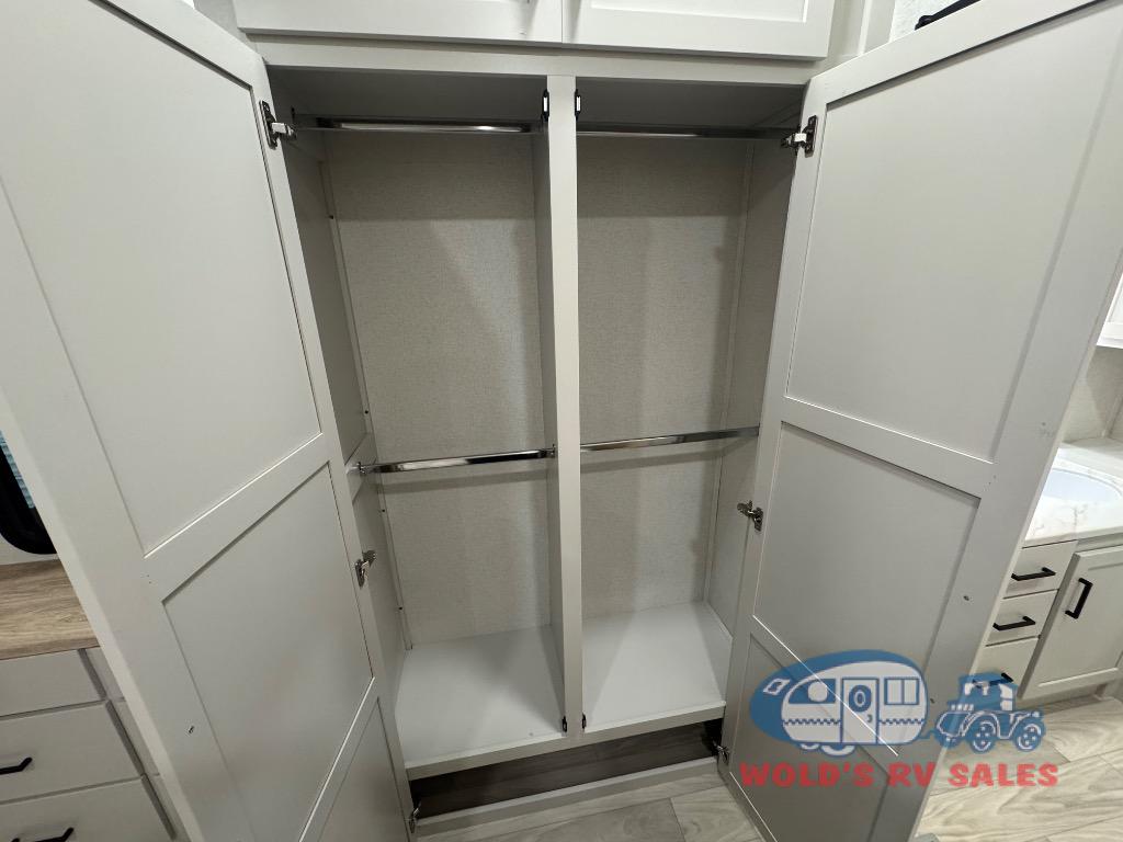 Enjoy extended stays in this triple slide out destination trailer! Once you unload your bags, you can put out the 19' awning with LED lights and relax in your camp chairs. The Chef Collection three burner range will let you make lunch for your crew when you head inside, and there is a free-standing dinette with a bench and two chairs to dine at. After your meal, you can relax on the theater seating across from the entertainment center with a hidden pantry behind it. There is also a front tri-fold hide-a-bed sofa to let guests sleep over. The mid-coach half bath will be easily accessible to use, and the full rear bath will create a master bedroom you are sure to love. There is a king bed slide out here, a dresser with TV prep, and two wardrobes to keep your things tidy!