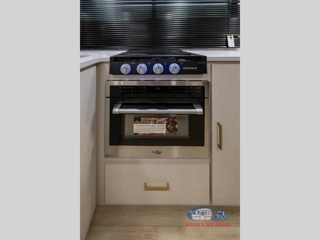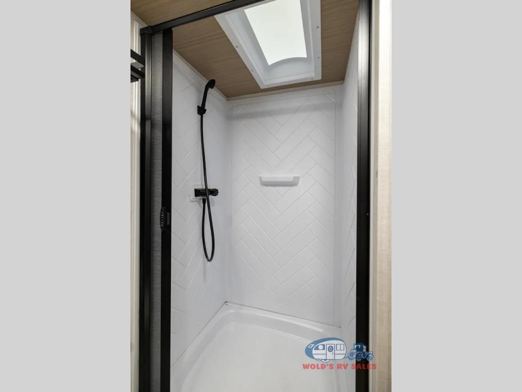 Escape to the great outdoors in this Vibe travel trailer. Once you arrive at your campsite, set up the 20' electric awning with LED lights, then grab the fishing poles from the large pass-through storage. You can make lunch on the electric oven/air fryer, and your food can be stored in the 12V refrigerator. The spacious full bath includes a 36" x 30" walk-in shower to clean up every day, and there is a linen closet to store clean towels and necessities.