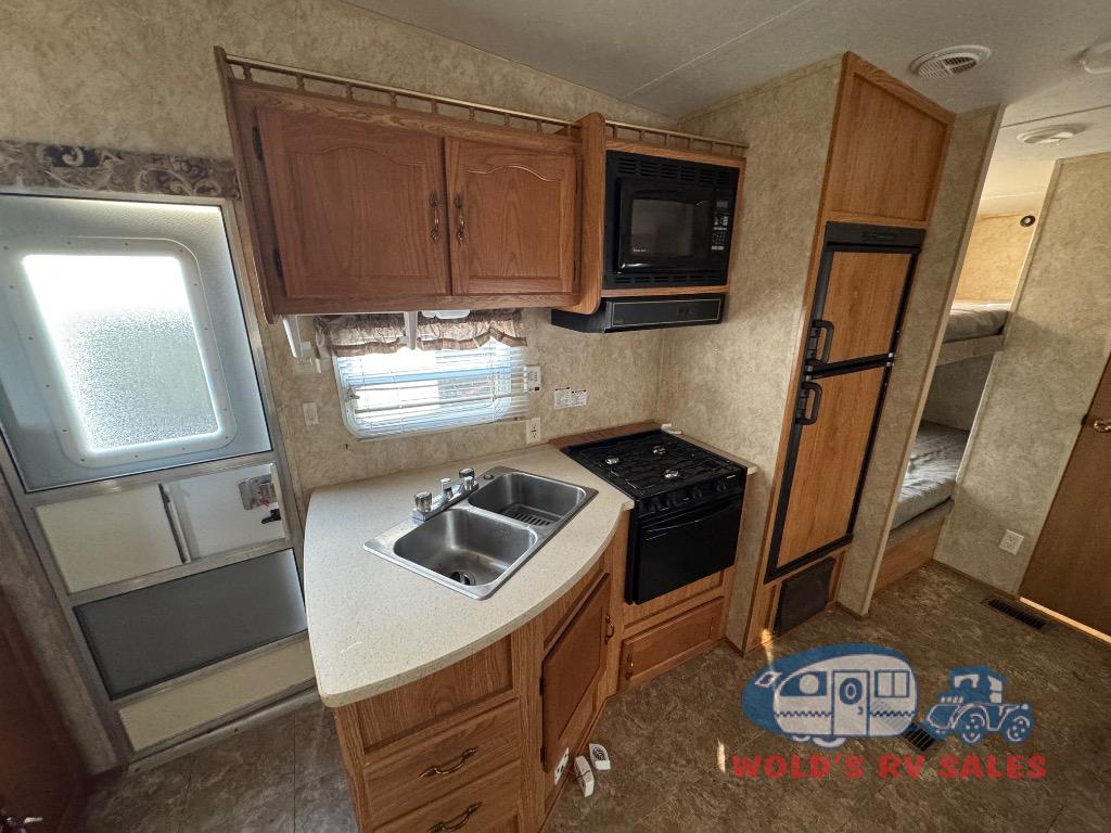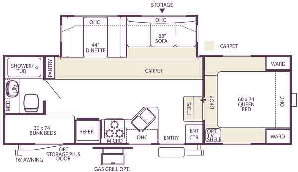 Single Slide, Shower/Tub, Bunk Beds, 16' Awning, Refrigerator, Microwave, Double Kitchen Sink, Opt. Gas Grill, Ent. Center, Sofa, Dinette, Overhead Storage, Queen Bed, Wardrobes, Carpet, and Much More.