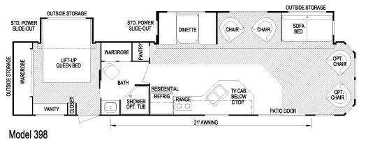 Double Slide Layton Park Trailer w/Rear Lift-Up Queen Bed, Wall Ward., Vanity, 2nd Ward., Bath w/Shower or Opt. Tub, Toilet, Lav., Ward., Res. Refrig. 3 Burner Range, Dbl. Kitchen Sink, Pantry, Booth Dinette/2 Lounge Chairs/Sofa Bed Slide Out, Outside Storage, Patio Door, Opt. Front Lounge Chairs, 21' Awning, Outside Storage, Optional Entry Door and More.