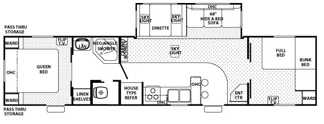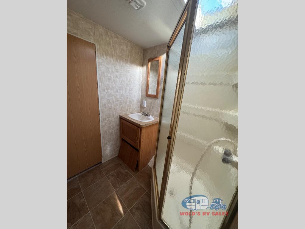 Single Slide Park Model w/Rear Queen Bed, Wardrobes, Flip TV, Rear Pass-Thru Storage, Separate Bedroom Entrance, Linen Shelves, Neo-Angle Shower, Sink, House Refrigerator, 3 Burner Range, Double Kitchen Sink, Bar Stools, Booth Dinette w/Skylights & Hide-A-Bed Sofa Slideout, Corner Ent. Center, Front Full Bed w/Bunk Above, Wardrobe & Flip TV, Overhead Cabinets Throughout and Much More.
