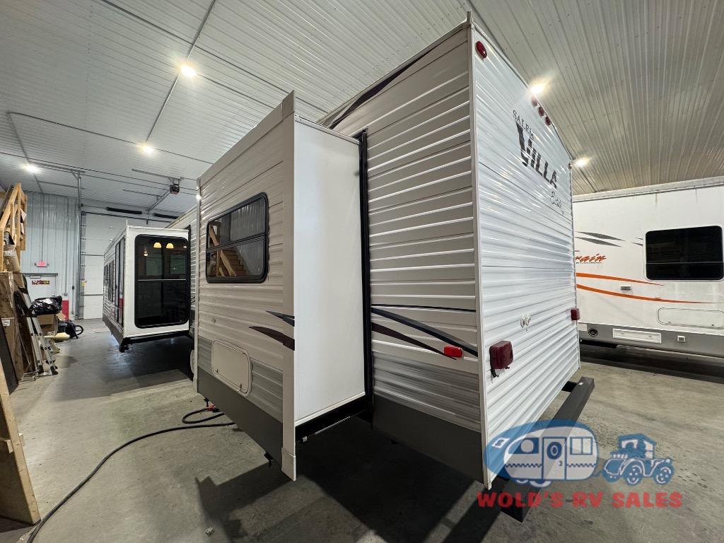 Double Slide Salem Villa Estate, Rear Queen Bed Slide, Storage, Ward., Shelves, Vanity, Shirt Closet, Garden Shower, Ward., Lav., Med. Cab., Toilet, Free Standing Dinette/Lounge Chairs/Sofa Slide, Pantry, House Type Refrig., 4 Burner Range, Dbl. Kit. Sink, Fireplace/TV Cab., Hutch, Overhead Cabinets Throughout, Patio Door, 21' Awning & More. Available Options May Include: Garden Tub, Washer/Dryer, Bar Stools.