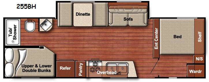 The rear corner features a set of double bed bunks, and the opposite corner features a convenient toilet and tub/shower with a separate sink.