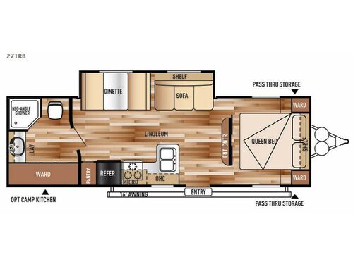 There is much storage with the overhead cabinets inside the travel trailer and the pass thru storage outside the trailer. You can even choose an optional outside kitchen and an optional baggage door.