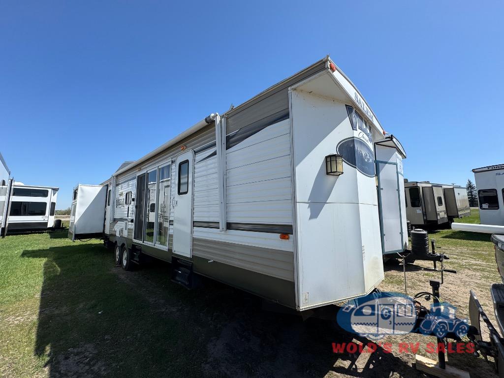 The Salem Villa 402QBQ Classic destination trailer by Forest River features four slides and a rear bunk house.
