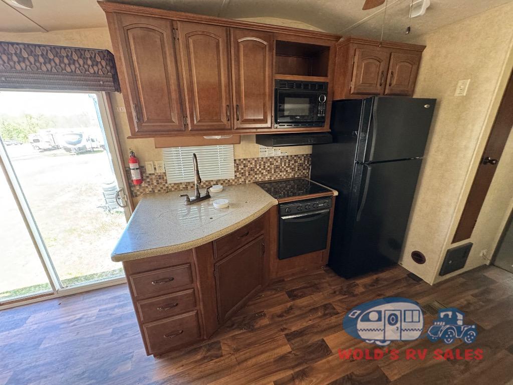 As you enter the trailer, to the left there is a double kitchen sink, three burner range, microwave, and refrigerator. The opposite side of the trailer has a slide with a u-shaped dinette and a sofa. Next to the sofa you will find an entertainment center.