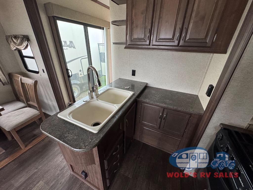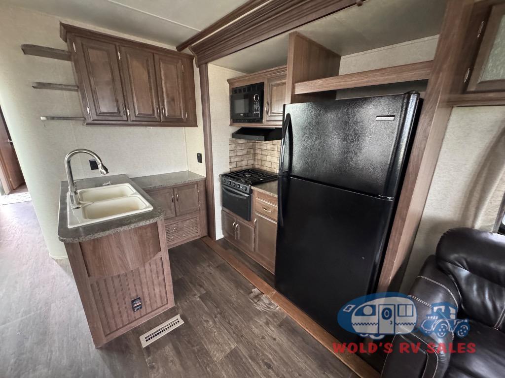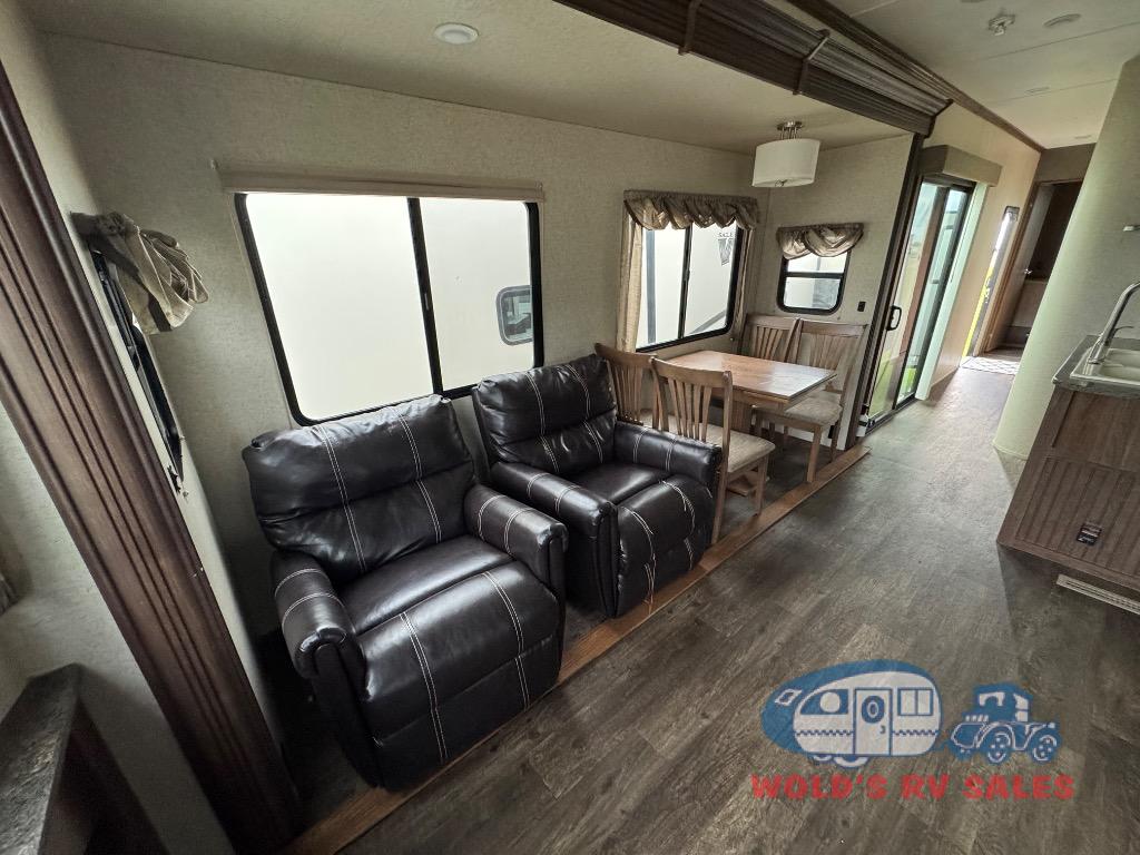 The living and kitchen area are quite spacious and open with two slides. As you enter into the kitchen there is a l-shaped counter with lots of counter space and a double kitchen sink. One of the slides has a free-standing table with chairs and two lounge chairs. The chairs at the free-standing table have storage under the seats, which is an ideal place to store card games or books. The slide on the opposite side of the trailer has a four burner range, refrigerator, and sofa. Along the front wall of the living area there is an entertainment center. You can choose to add an optional fireplace below the entertainment center, plus so much more!