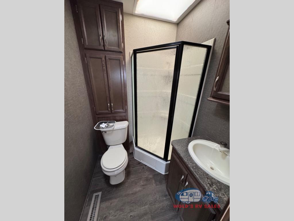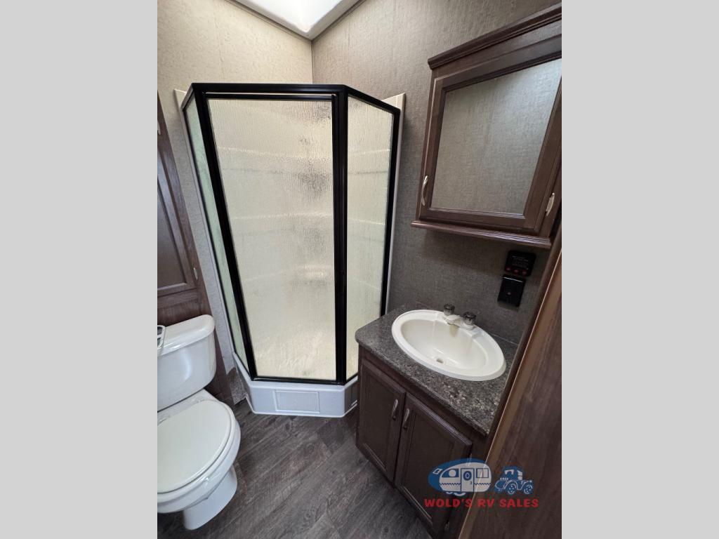 Stepping inside the rear entrance door of the 41 FBHL you find that the bathroom is directly in front of you. Inside the bathroom there is a corner cabinet for toiletries, a toilet, cabinet above the toilet, corner shower, sink, and medicine cabinet.
