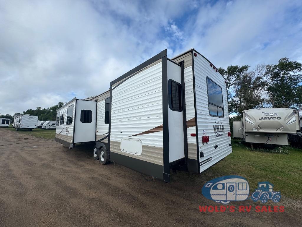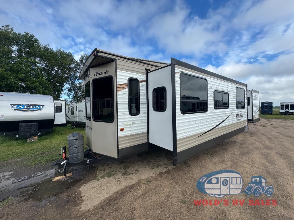 The Salem Villa Classic 39FDEN destination trailer by Forest River features double slides, dual entry, a queen bed, and a front living area.