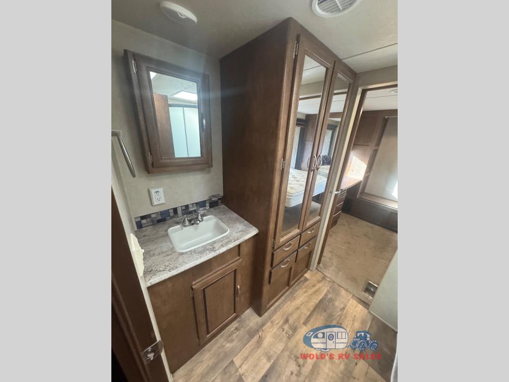 The bathroom is a walk-through with a sink, medicine cabinet, and wardrobe with drawers on one side of the travel trailer, and a toilet with a radius shower on the other side.