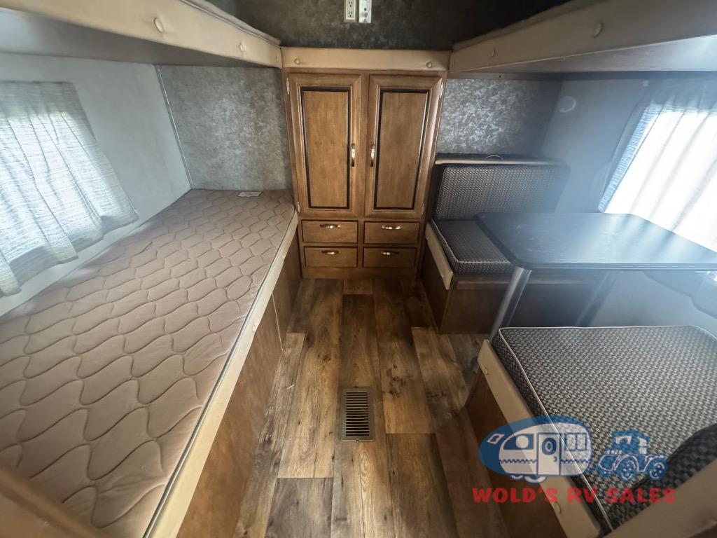 To the right of the patio door entrance you will find an entertainment center. Just around the corner there is a front bunk house with a set of bunk beds on one side and a dinette and a hinged bunk above the dinette on the other side. Along the front of the room there is a wardrobe and entertainment center.