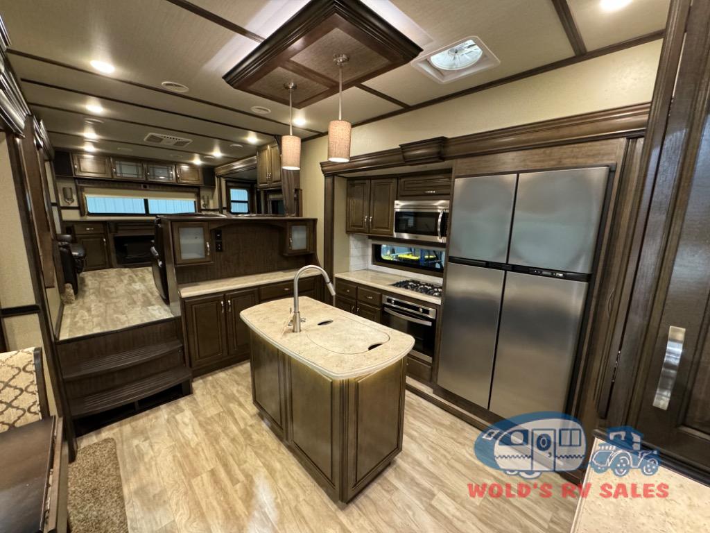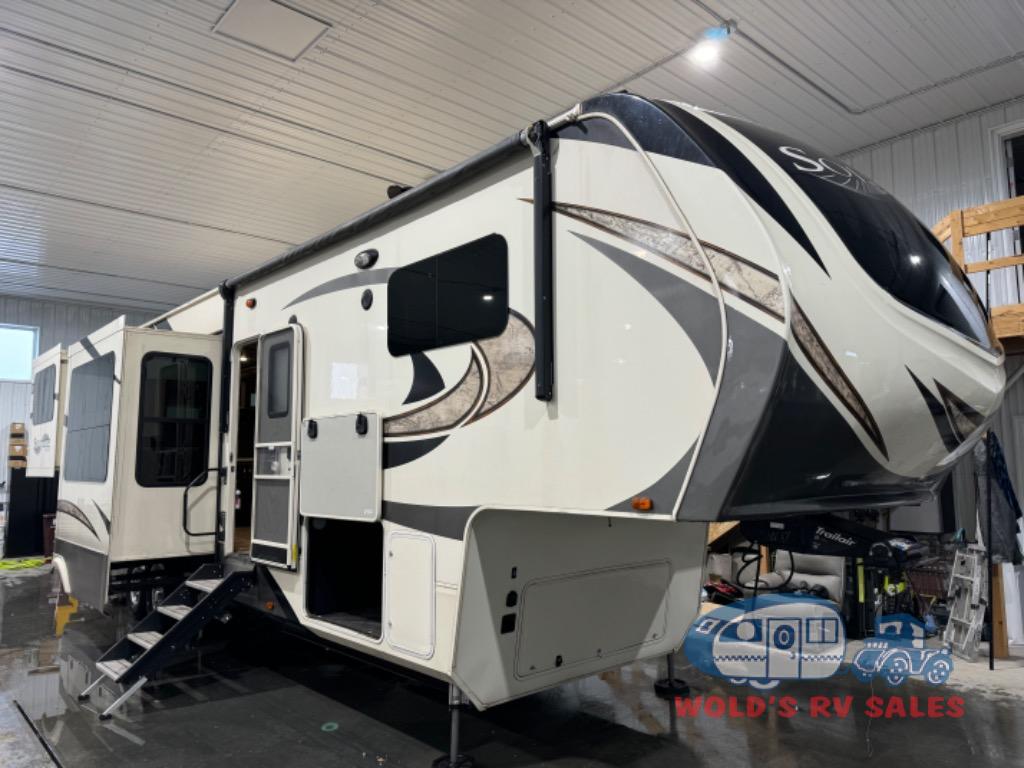 This Solitude 375RES fifth wheel allows you to travel with all the comforts of home including plenty of interior floor space to move around, extra sleeping space for the kids or grandkids, and plenty of storage for everything you might need for an extended stay. The unique exterior rear storage includes a sliding tray allowing easy access to the gear in the back. Inside, the front master bedroom will not disappoint with a pullout ottoman, flip-top dresser, and a TV to mention a few features. The cook will surely love making meals with the professional grade stainless steel cooktop, built-in oven and convection microwave. The popular kitchen island, stainless steel 18 cu. ft. four door refrigerator, and large pantry are sure to impress. The buffet adds additional counter space to serve food or place your keys and things. You might even decide to add a few options such as a washer and dryer to keep your clothes clean the whole time, a king size bed for more sleeping surface, or even a pull-out kitchen to make meals outdoors. There are many features and plenty of space for everyone!