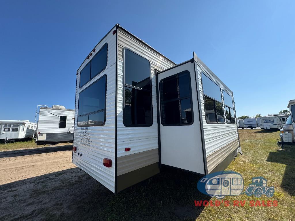 Come choose a quiet spot in the woods for your Salem Grand Villa 42DL destination trailer by Forest River. This model features triple slide outs and a loft with three bunk mats that your children or grand children will love. The double entry doors include a set of patio doors for the main entry plus a private entry door that leads into the front master bedroom. You will love the large walk-in pantry for all of your non-perishables, and the kitchen island which provides extra counter space to prep and serve your meals, plus added storage beneath for your larger pots and pans. The kitchen also features a skylight for added natural light making it seem bright even on cloudy days!