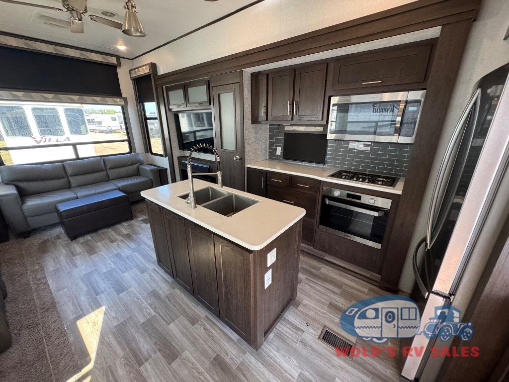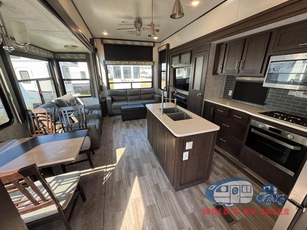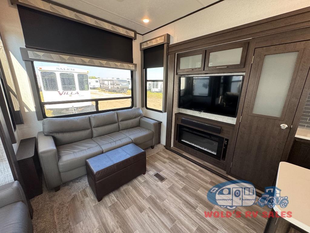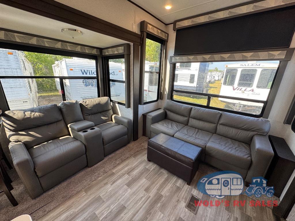 Functionality plus at-home comforts describe the Salem Grand Villa destination trailer from Forest River. You will love all of the new features and upgrades like the extra large windows to bring the view or your surroundings right inside, the new taller ceiling which provides a spacious and airy feel. You will also appreciate the upgraded cabinet door fronts on the island, the 80" extra wide sofa, plus the Whirlpool brand french door residential refrigerator and 1.6 cu. ft. oversized Whirlpool microwave oven for all of your extended stay needs. With the Salem Grand Villa, you truly get a home-away-from-home with all of the conveniences that make travel fun, right on down to the housekeeping with central vacuum being included, plus so much more!
