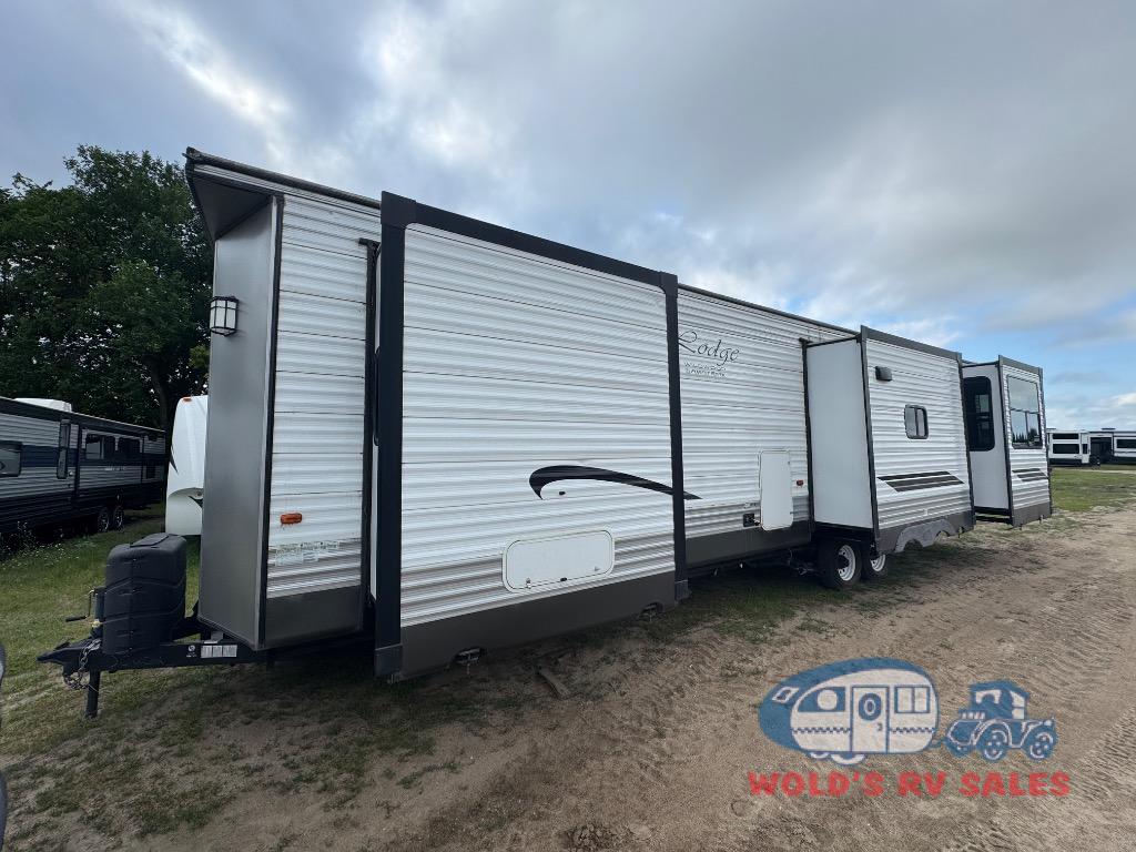 With four slides, a rear living room, and a private bedroom, you are sure to love your time in this Wildwood Lodge destination trailer by Forest River. Enjoy your meals at the free-standing dinette which has three chairs along one side and a bench along the opposite side. In the rear living area you can relax on the theater seats while watching a movie or your favorite show at the entertainment center, and you will also find that this model has two entry doors so that you can quietly enter into the front bedroom without disturbing anyone!