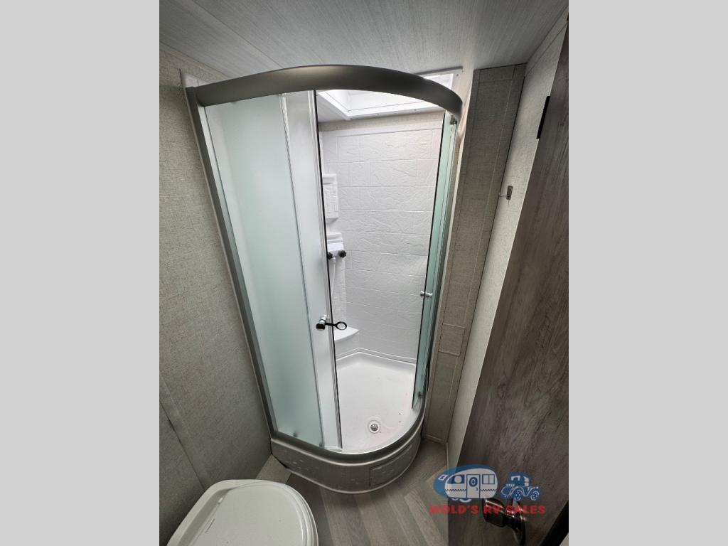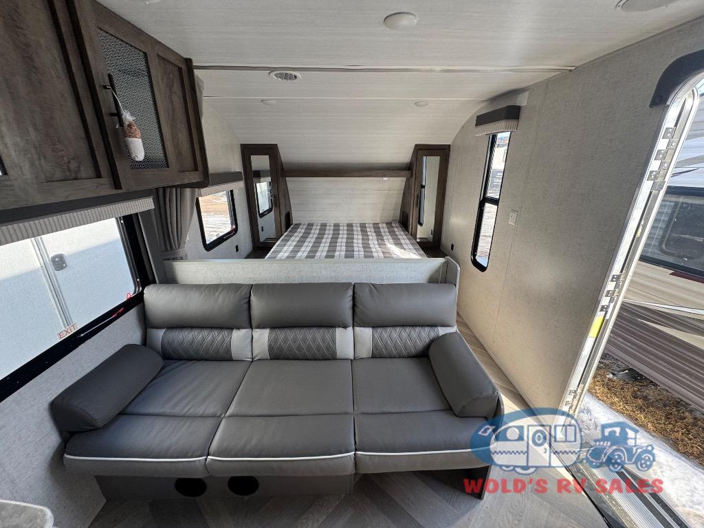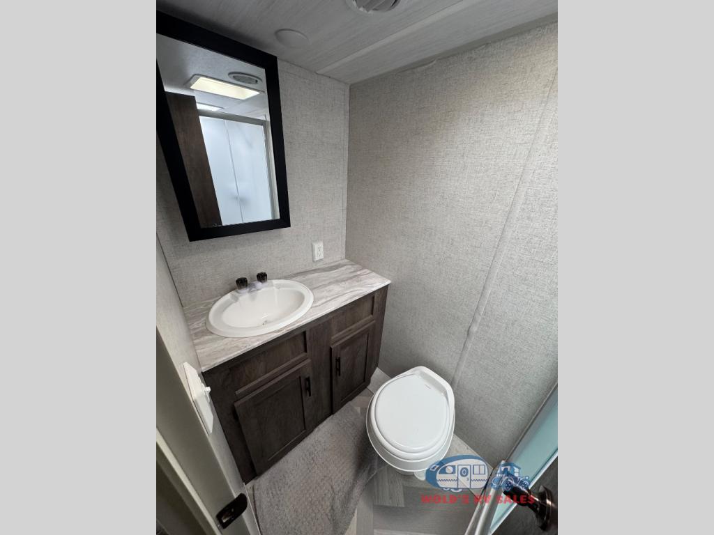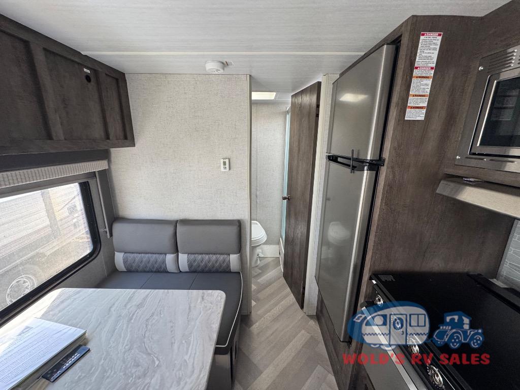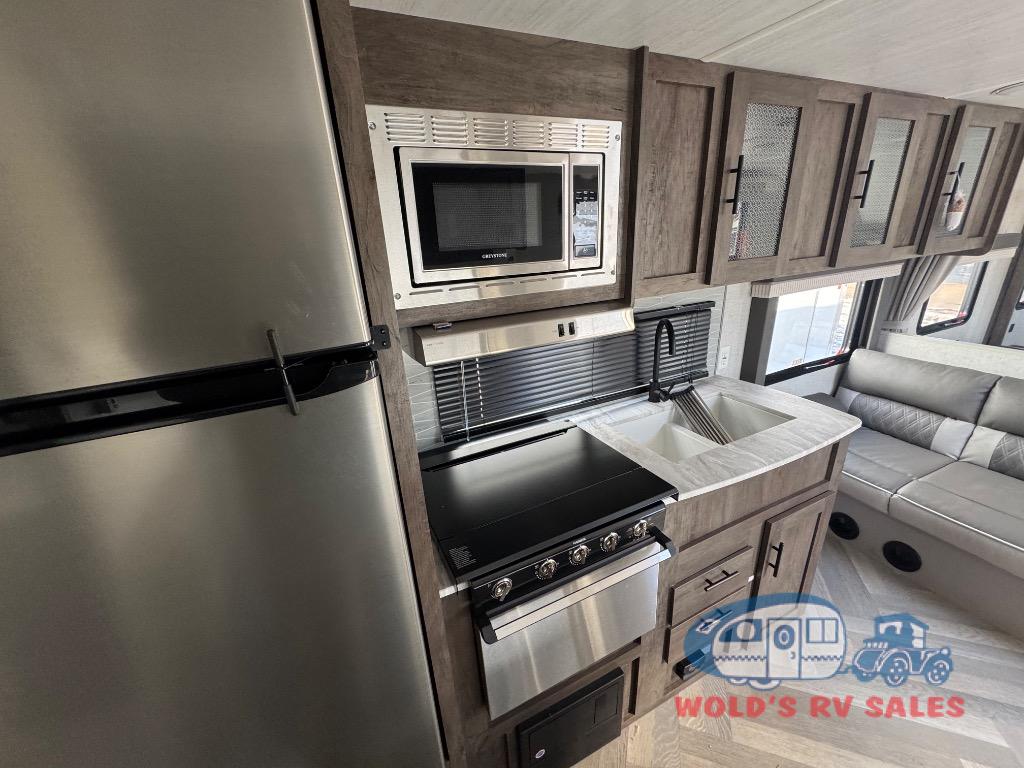 Do you need a spacious rear bathroom and a front queen bed? Well then, check out this travel trailer! There are closets on either side of the queen bed and a privacy curtain that can be drawn at night. Grab some eggs and bacon from the oversized 11 cu. ft. refrigerator and fry them up on the three burner cooktop then head to the booth dinette to enjoy eating them there comfortably. The sofa is a great place to wind down your nights, especially after showering in the walk-in shower!