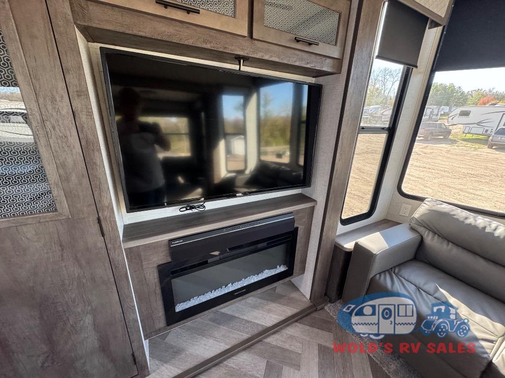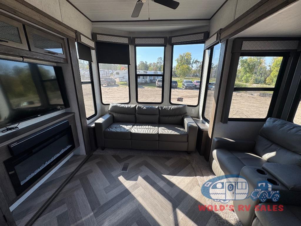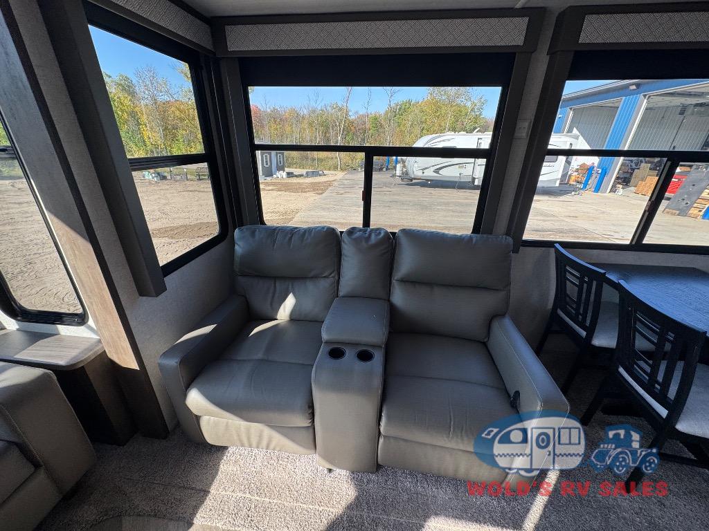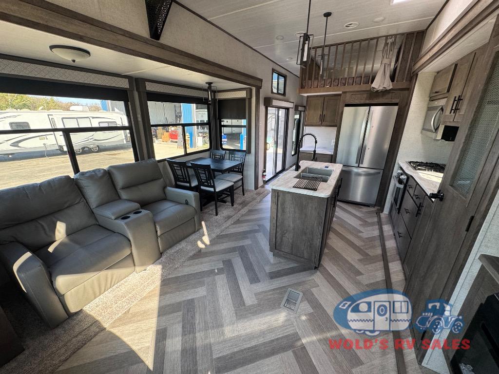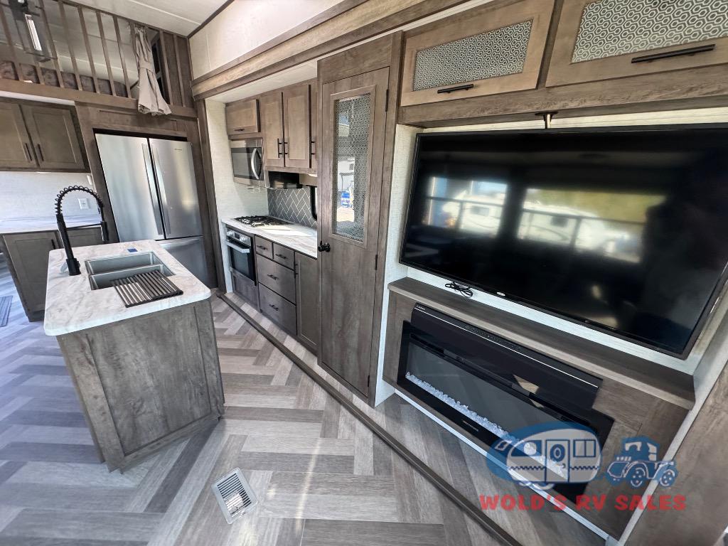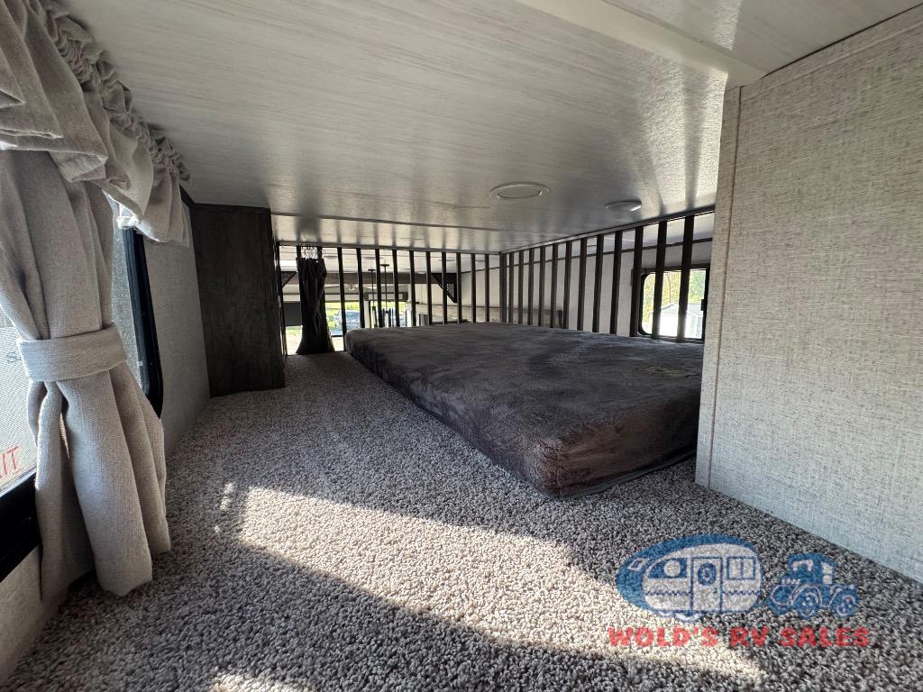 The grandkids will be begging to come along with you on your next getaway in this destination trailer! It features a double loft with three 42" x 74" bunk mats in total above the rear private bedroom. Inside the bedroom is a custom king bed slide with overhead cabinets, large dresser drawers, and a closet that is prepped to add an optional washer and dryer so you won't have to worry about dirty clothes. The 50" walk-in shower with a seat will make it easy for everyone to get squeaky clean each morning too. The living and kitchen area feature a kitchen island, a free standing dinette to enjoy meals and card games, a front sofa, and theater seating across from the entertainment center with a 30" built-in electric fireplace heater for those crisp evenings!