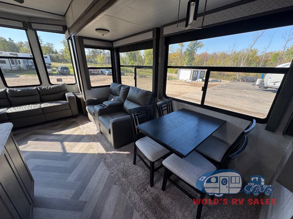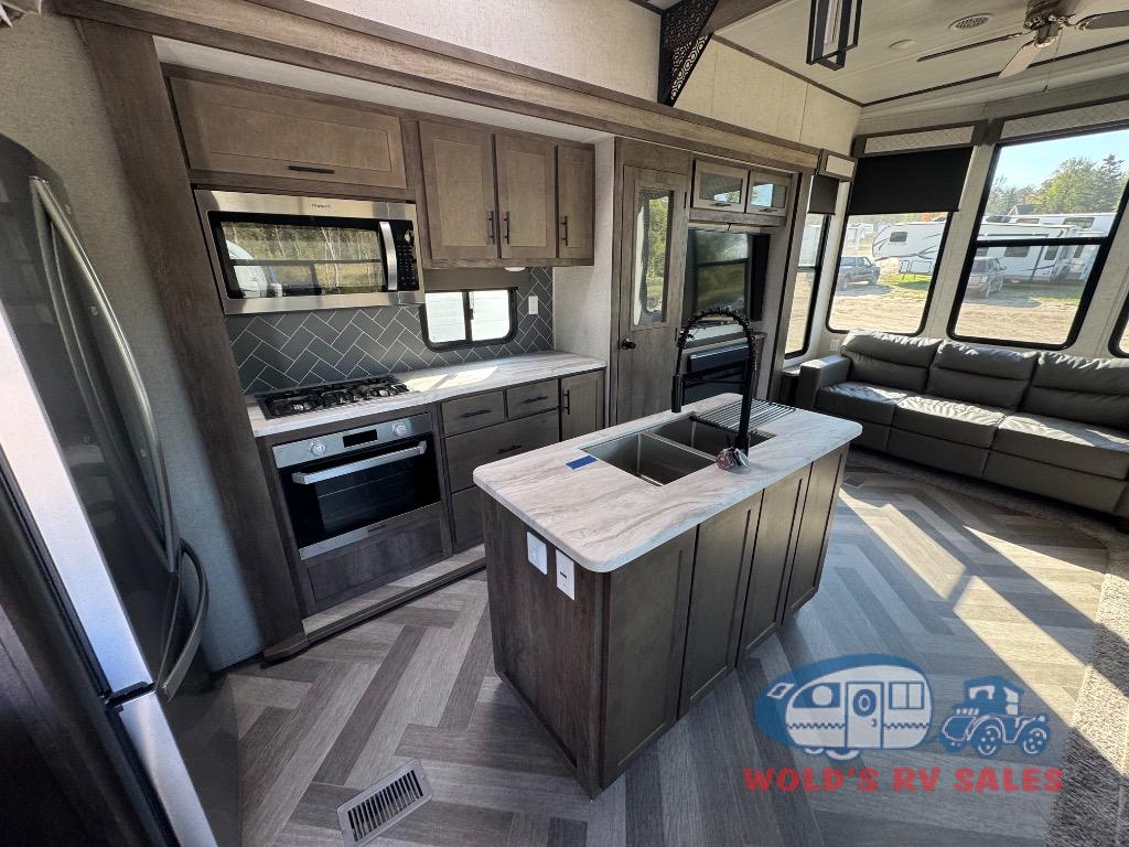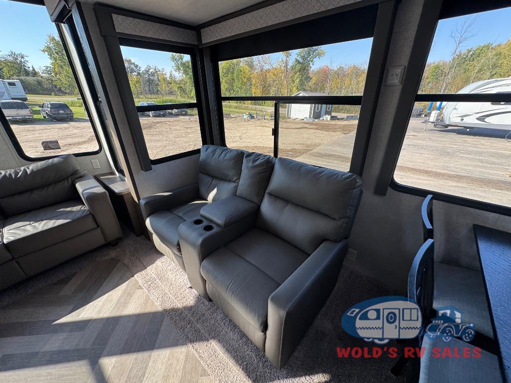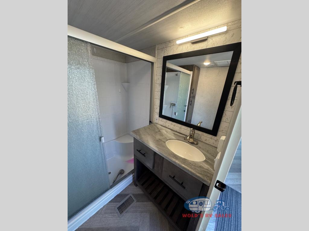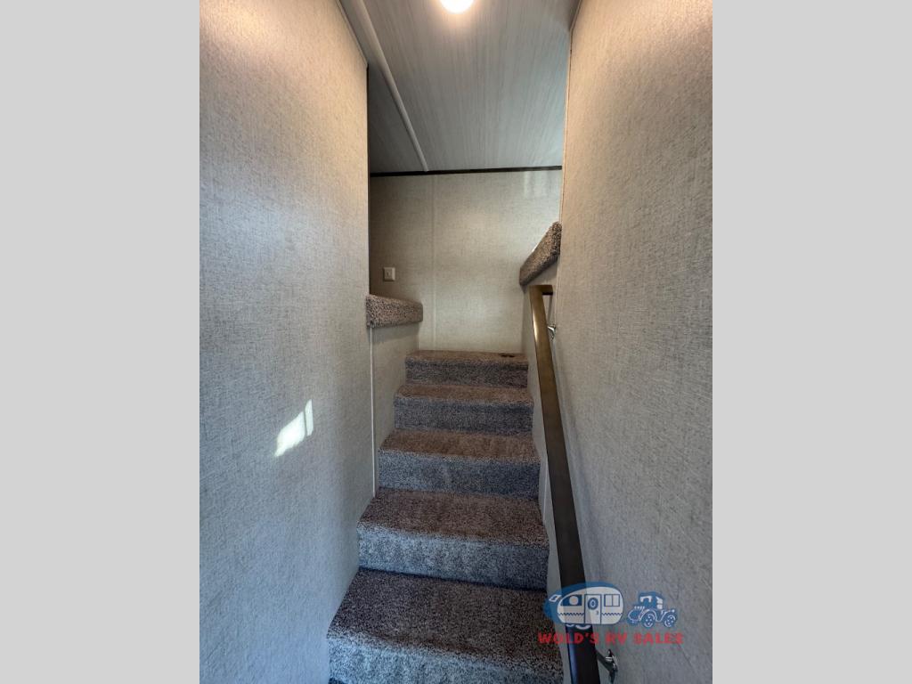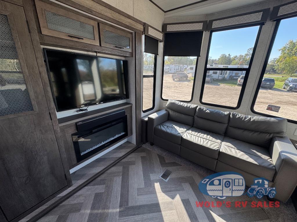 The grandkids will be begging to come along with you on your next getaway in this destination trailer! It features a double loft with three 42" x 74" bunk mats in total above the rear private bedroom. Inside the bedroom is a custom king bed slide with overhead cabinets, large dresser drawers, and a closet that is prepped to add an optional washer and dryer so you won't have to worry about dirty clothes. The 50" walk-in shower with a seat will make it easy for everyone to get squeaky clean each morning too. The living and kitchen area feature a kitchen island, a free standing dinette to enjoy meals and card games, a front sofa, and theater seating across from the entertainment center with a 30" built-in electric fireplace heater for those crisp evenings!